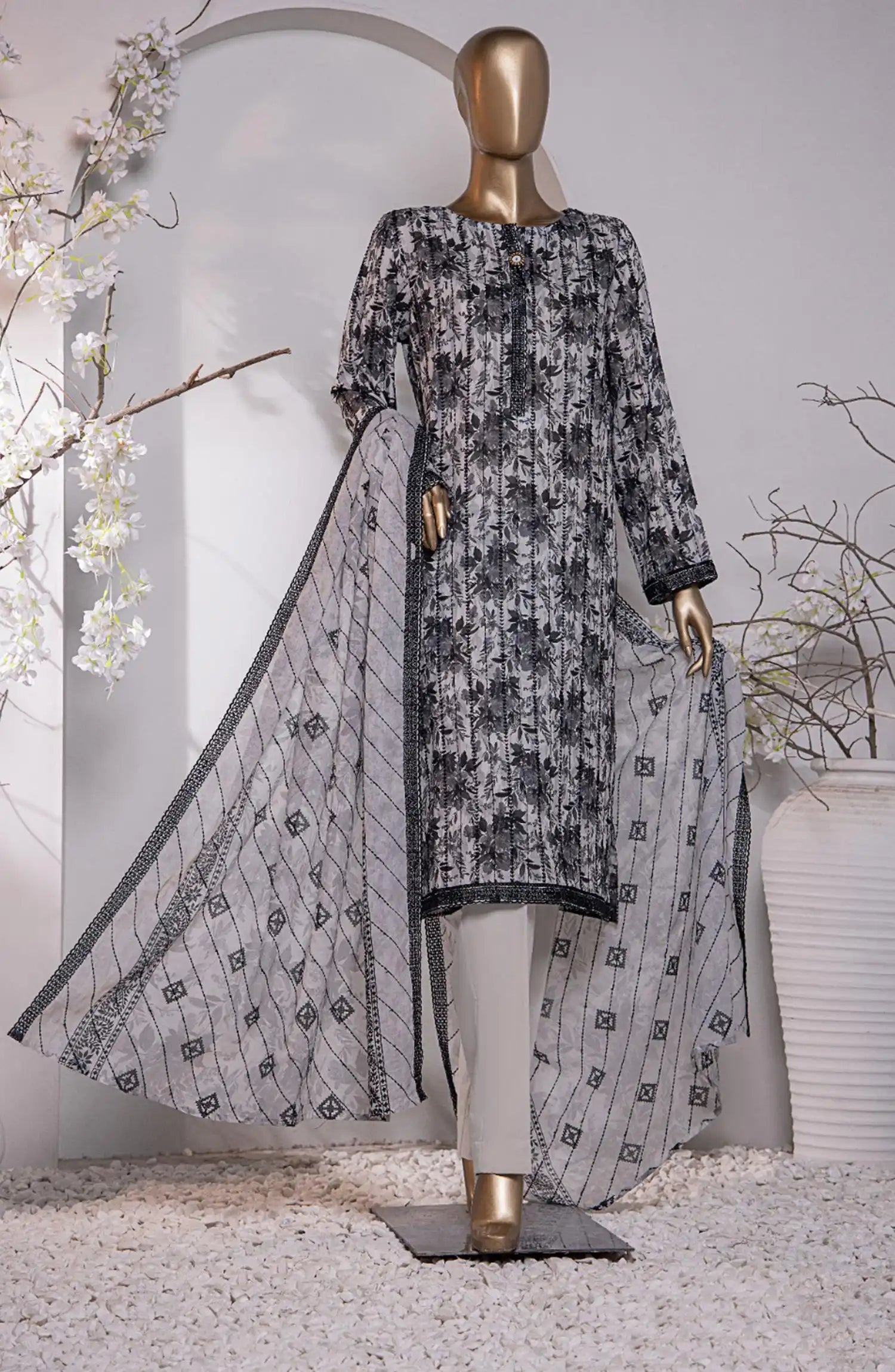 HZ Dhagakari Embroidered Lawn Collection has been styled in the image for photography and illustrative purposes.