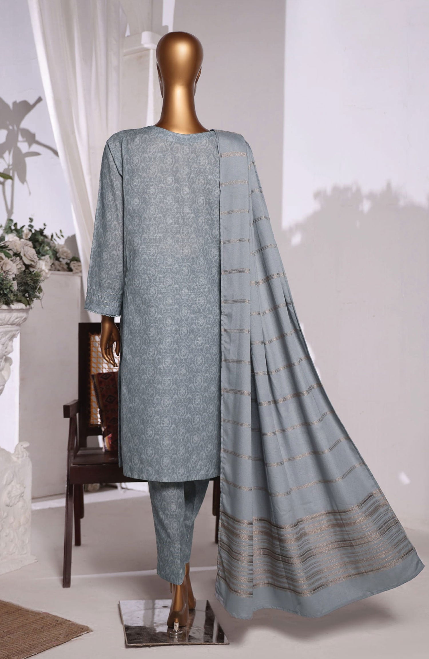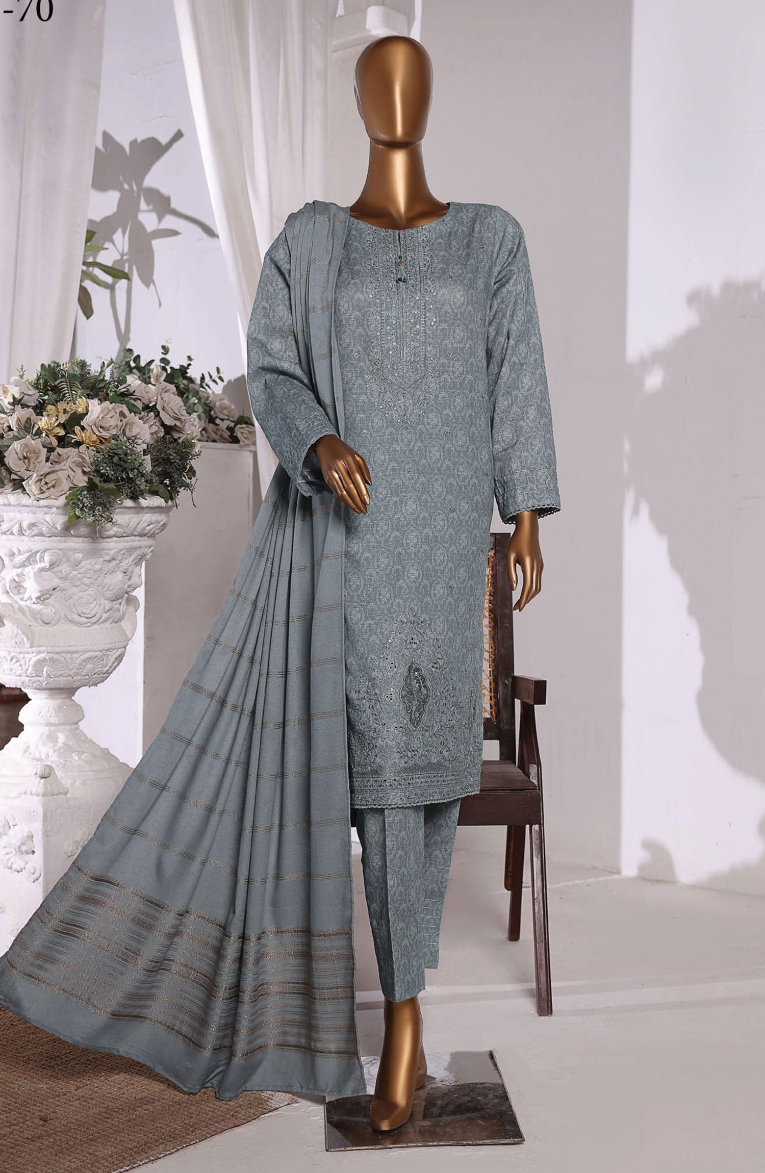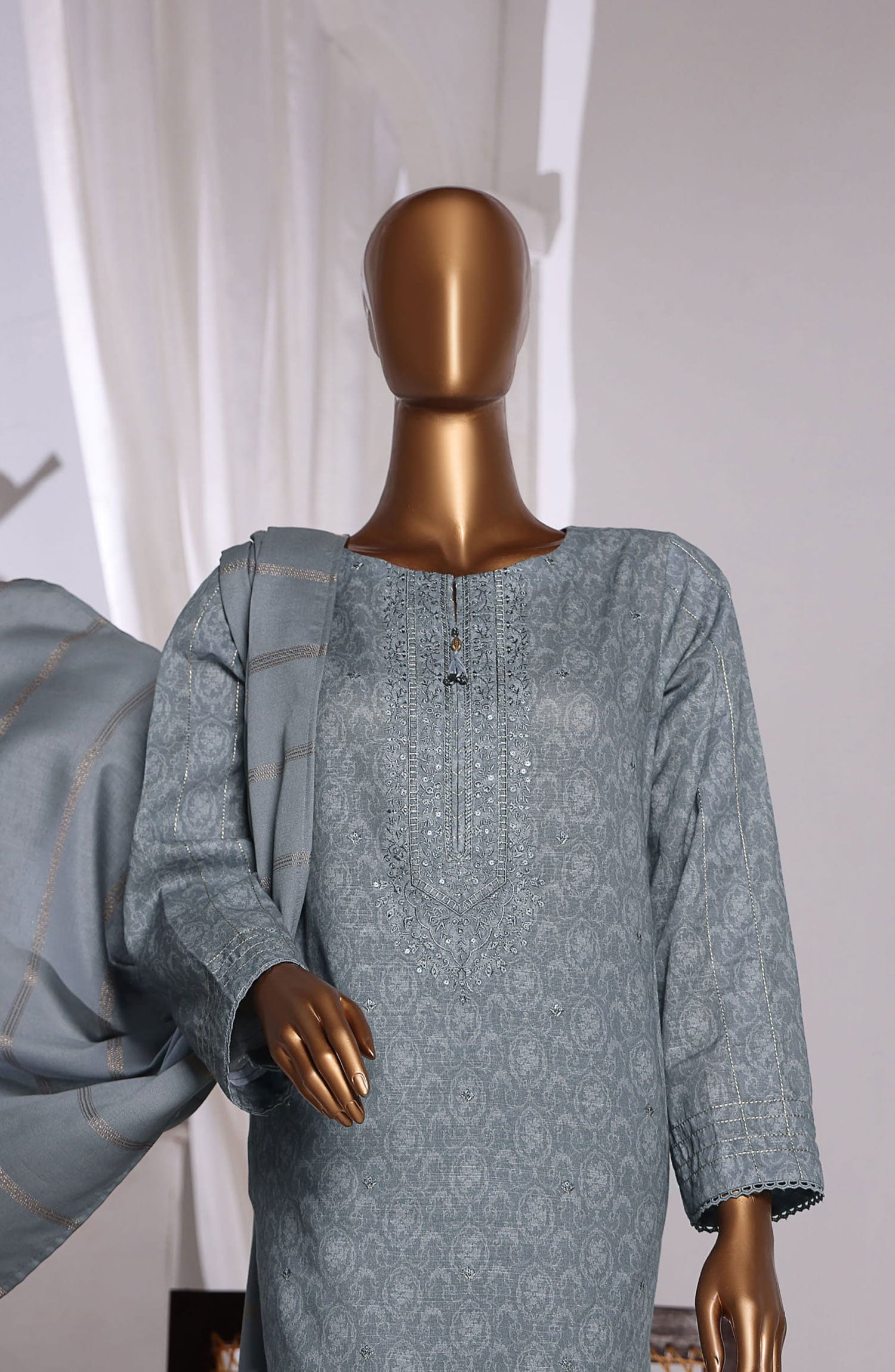 Ayla Embroidered Chambray Stitched 2 Piece Solids - EAE210105H - AY25SW - Silver Grey - Winter Collection