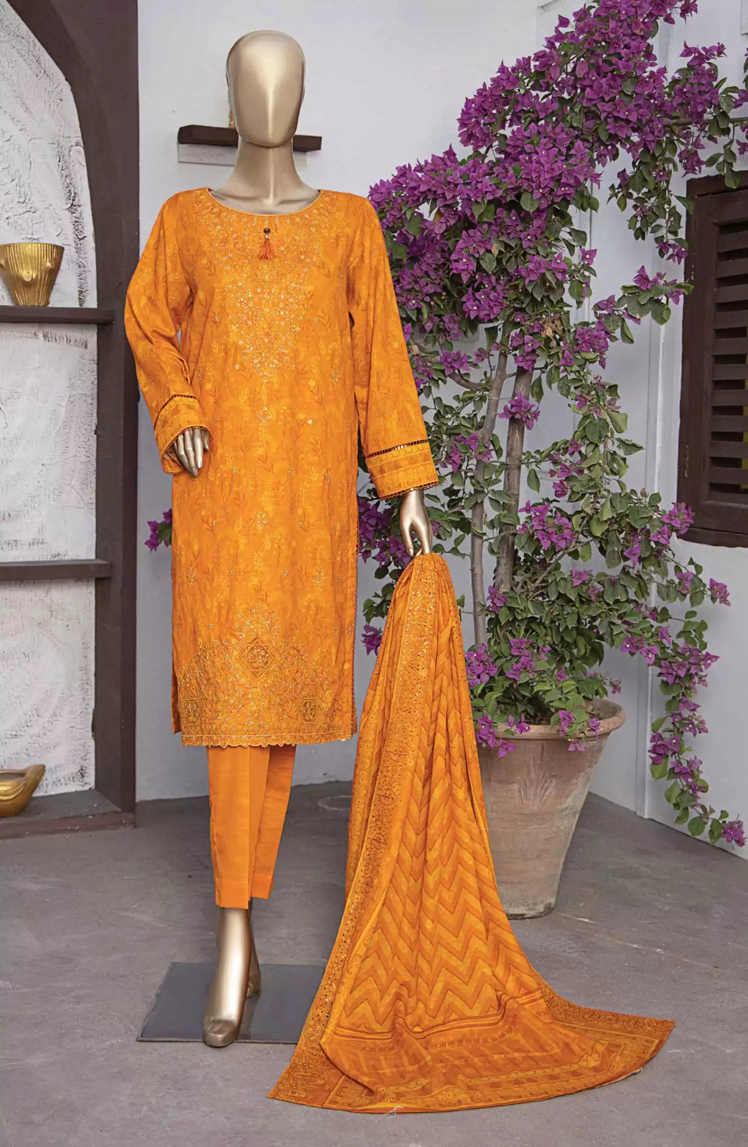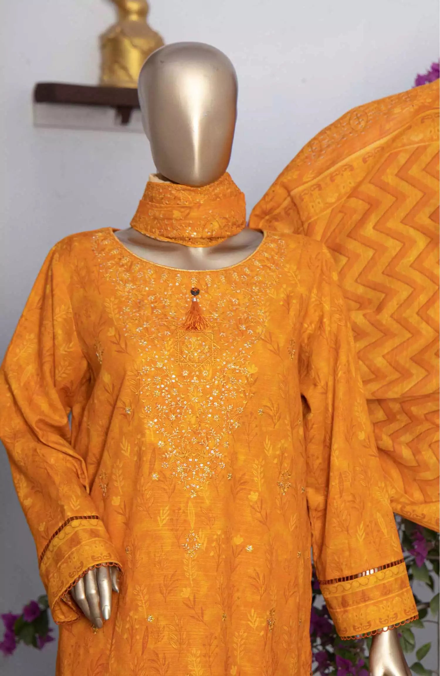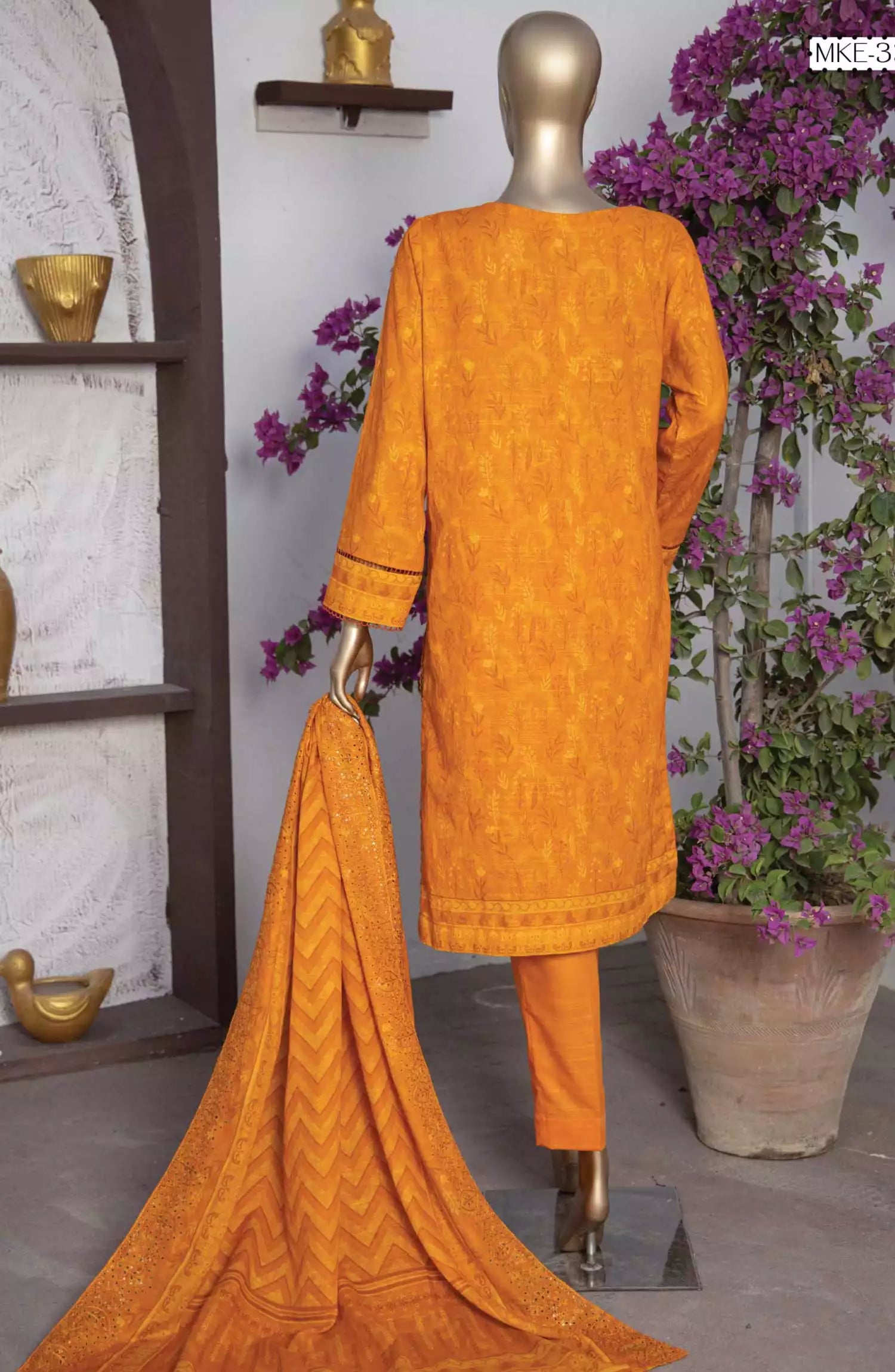 The standard style comes as a long-sleeved kameez with dupatta and trouser/shawlar.