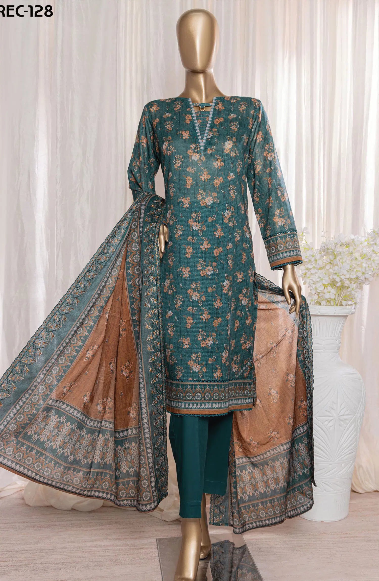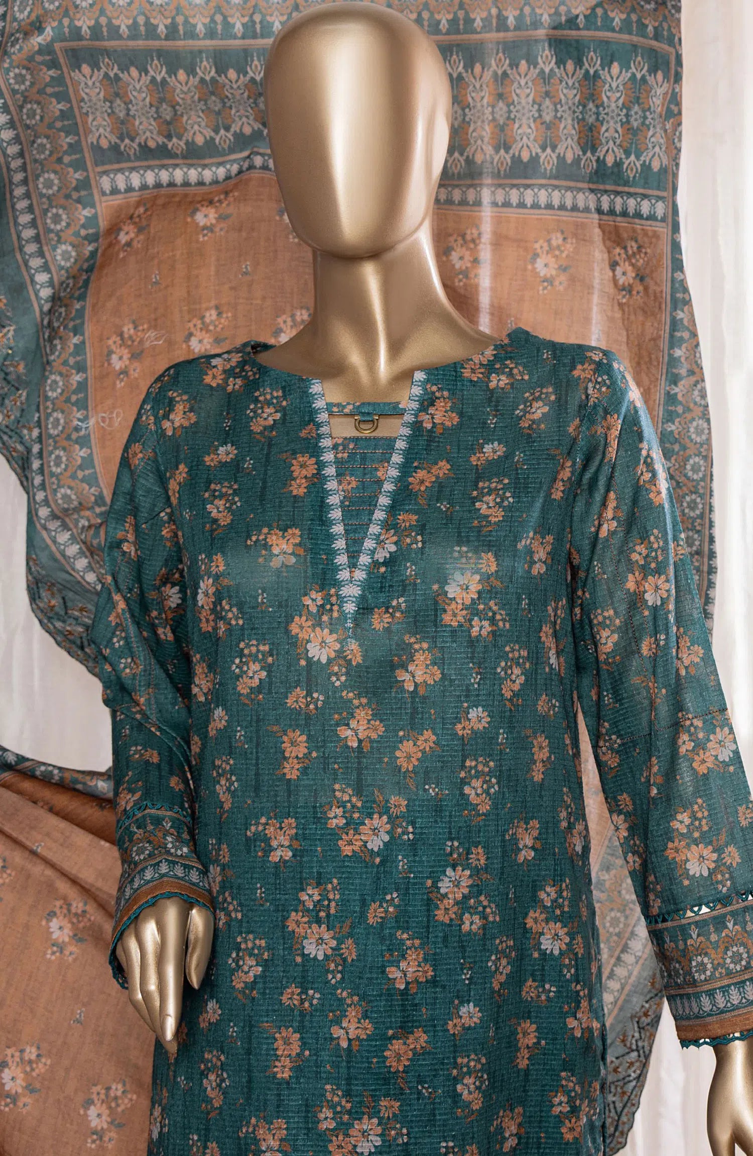 The standard style comes as a long-sleeved kameez with dupatta and trouser/shawlar.