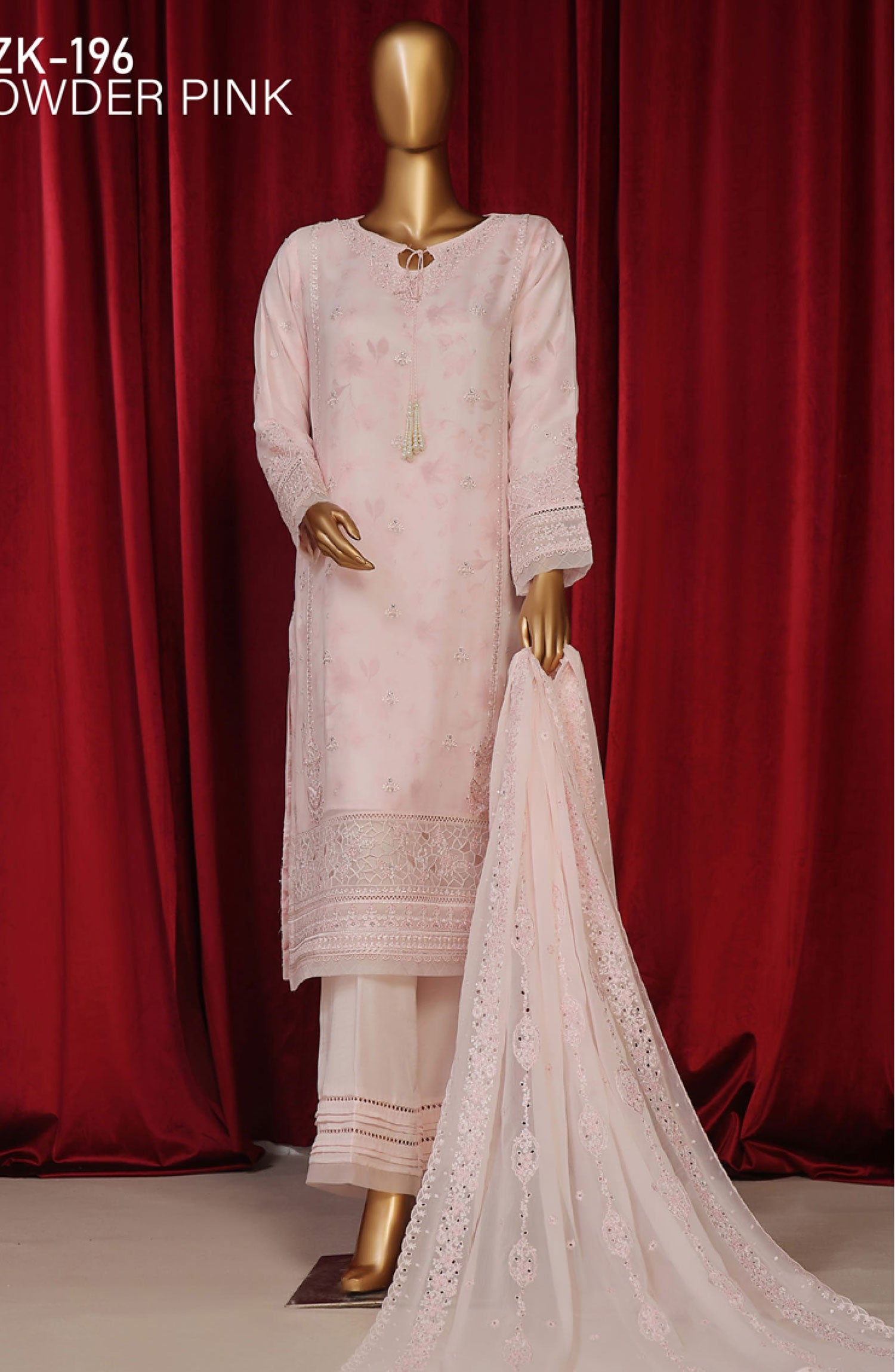 The standard style comes as a long-sleeved kameez with dupatta and trouser/shawlar.