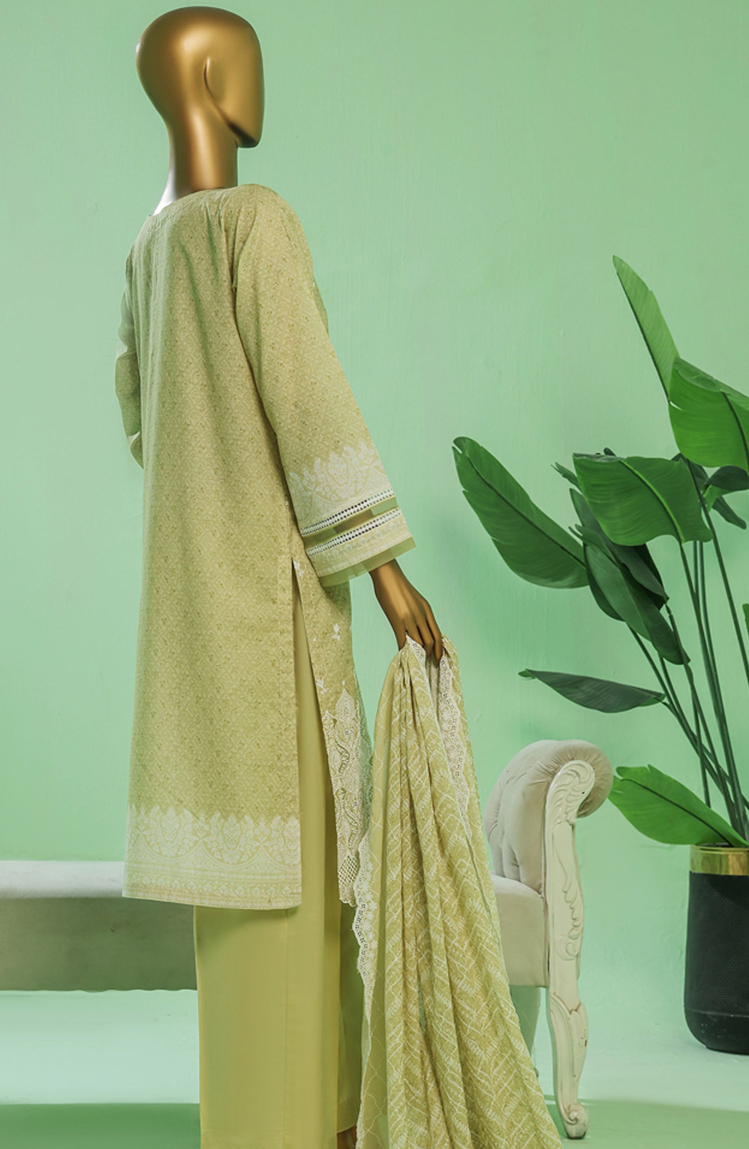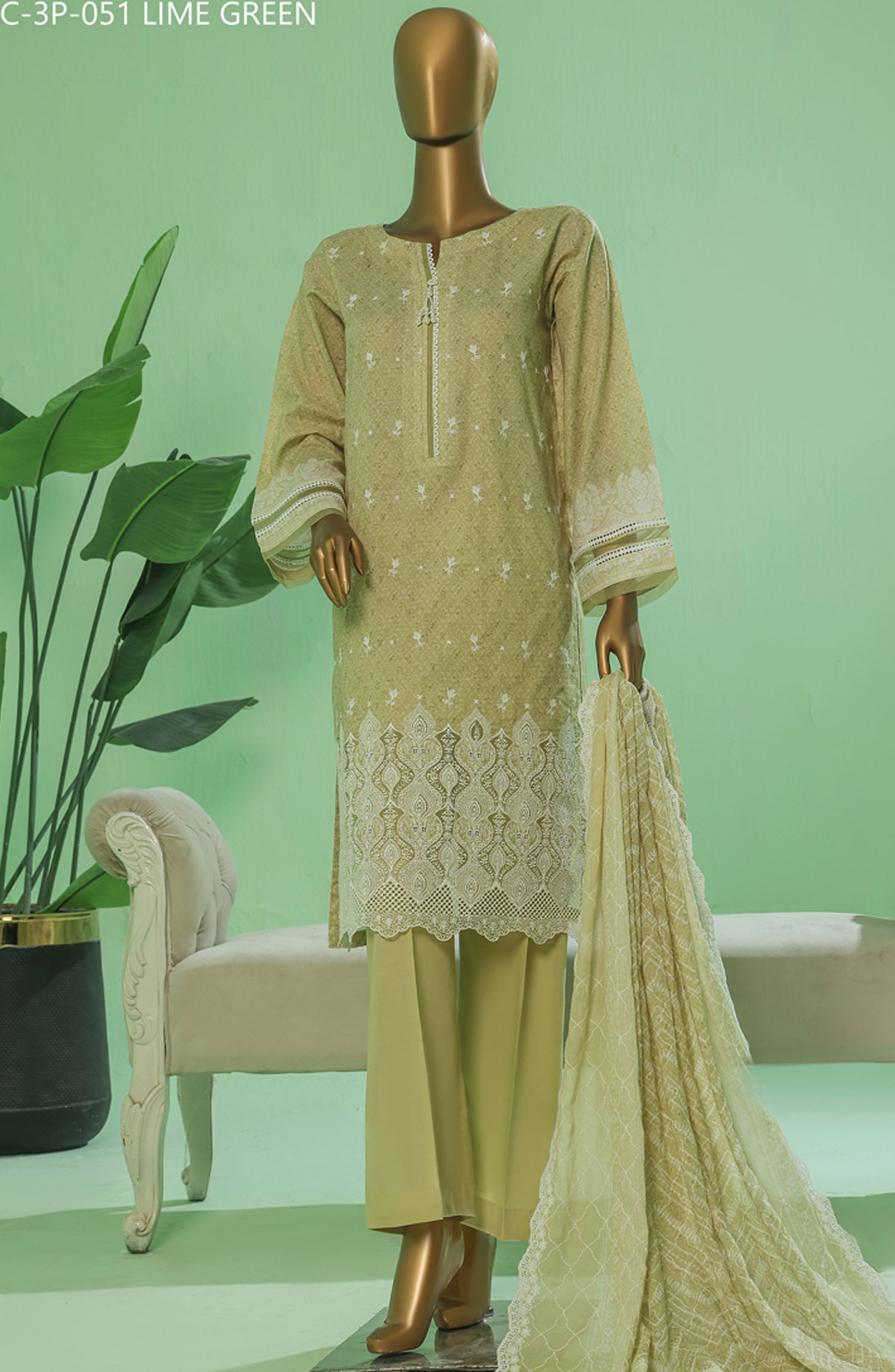 Home HZ Textile Chikankari Lawn Stitched 3 Piece Suit - PEC-3P-051 Lime Green - HZ25PTKV3 - Green - Eid Collection