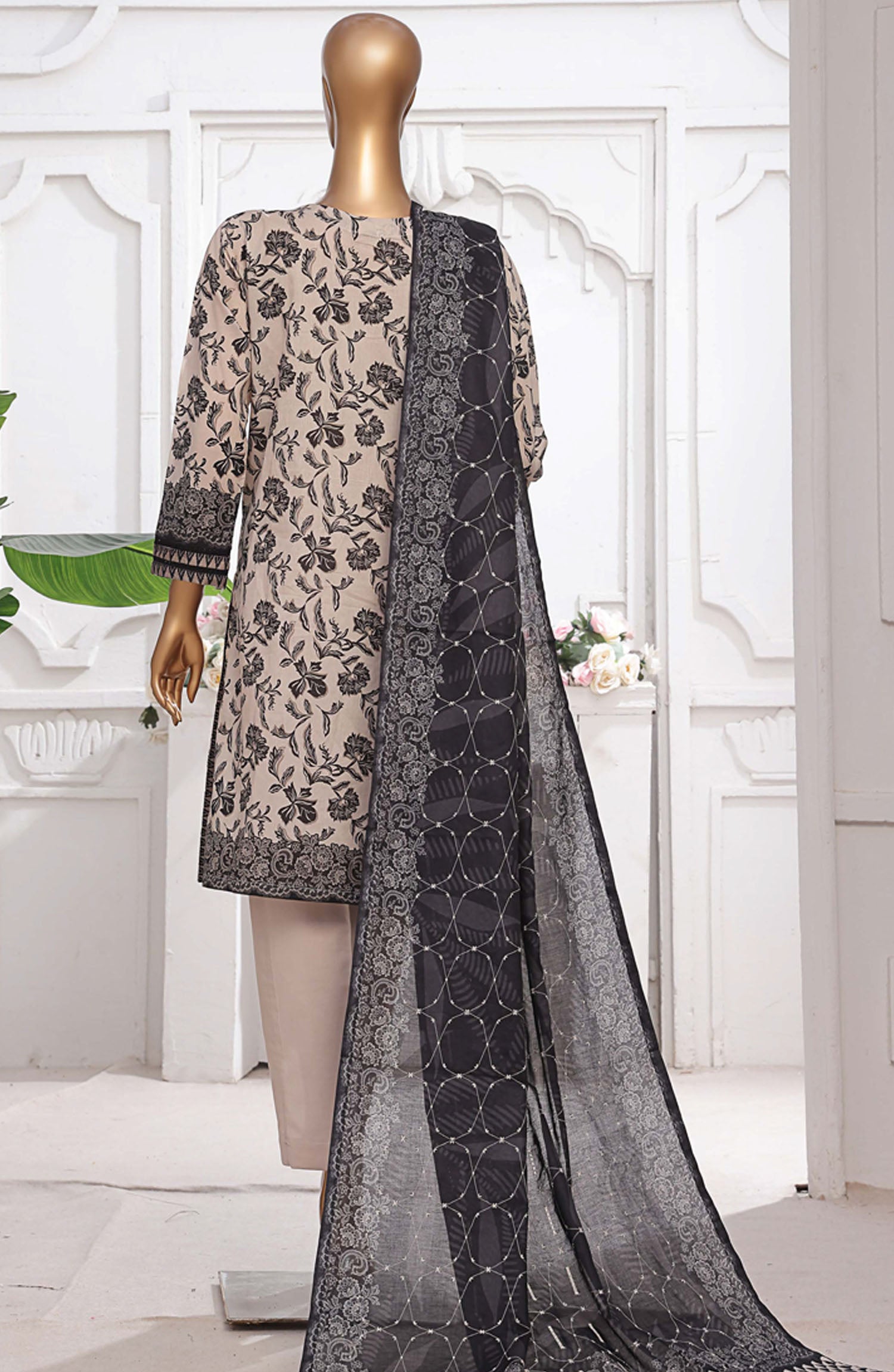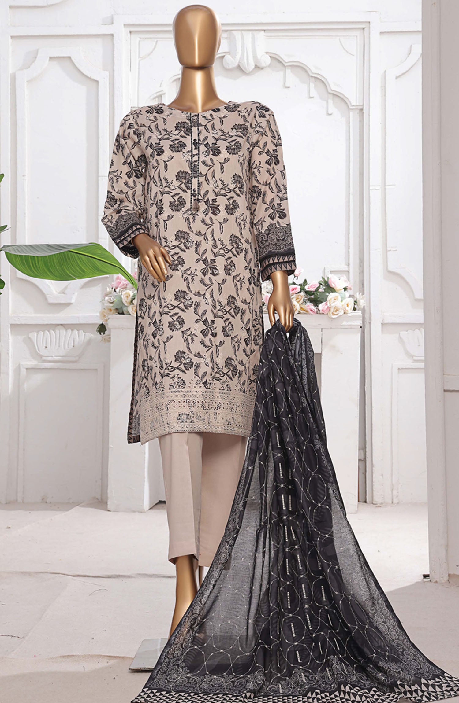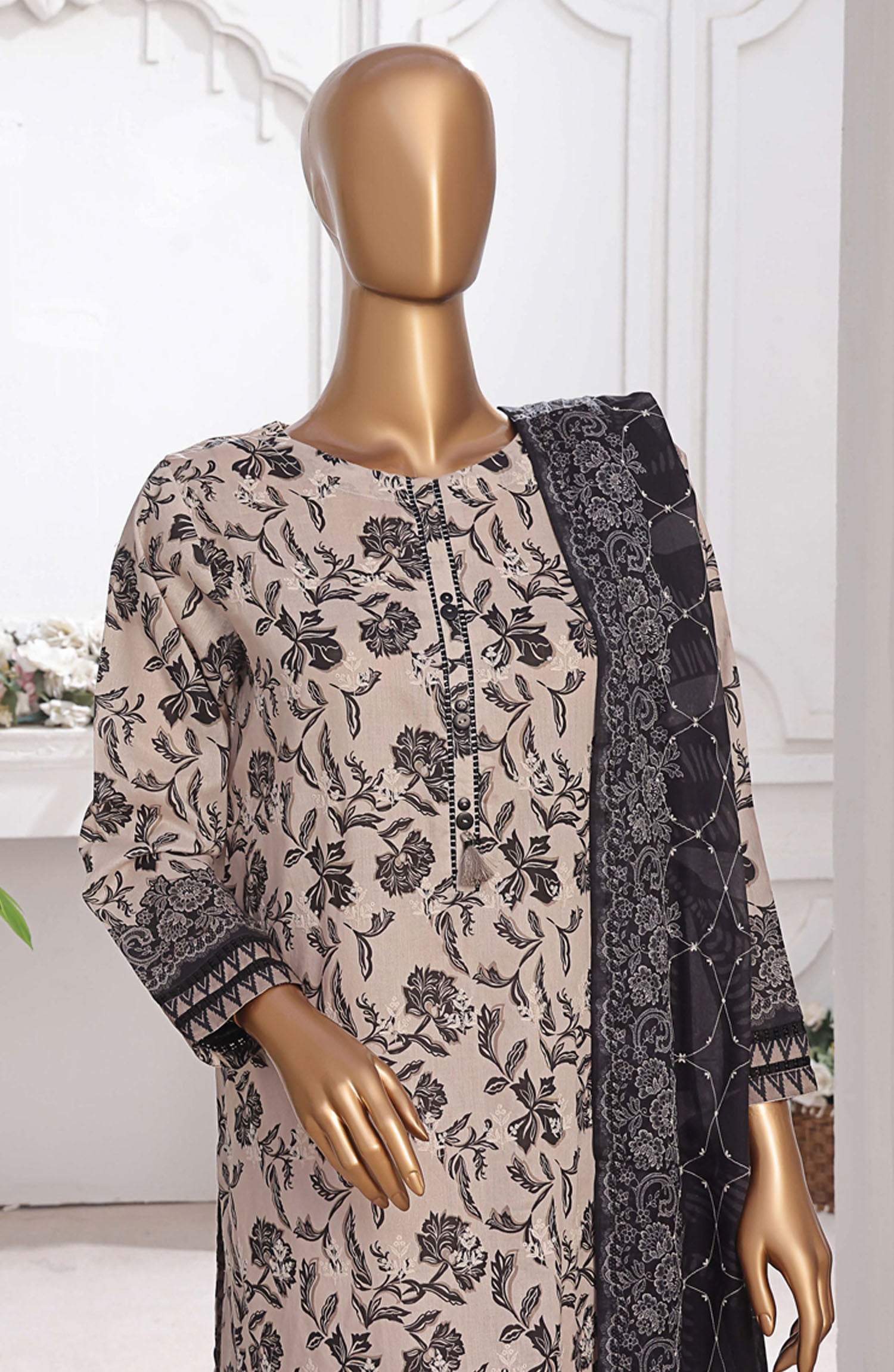 Home HZ Textile Printed Lawn Stitched 3 Piece Suit - PEC-207 Beige Black - HZ25PTKV2 - Beige - Summer Collection