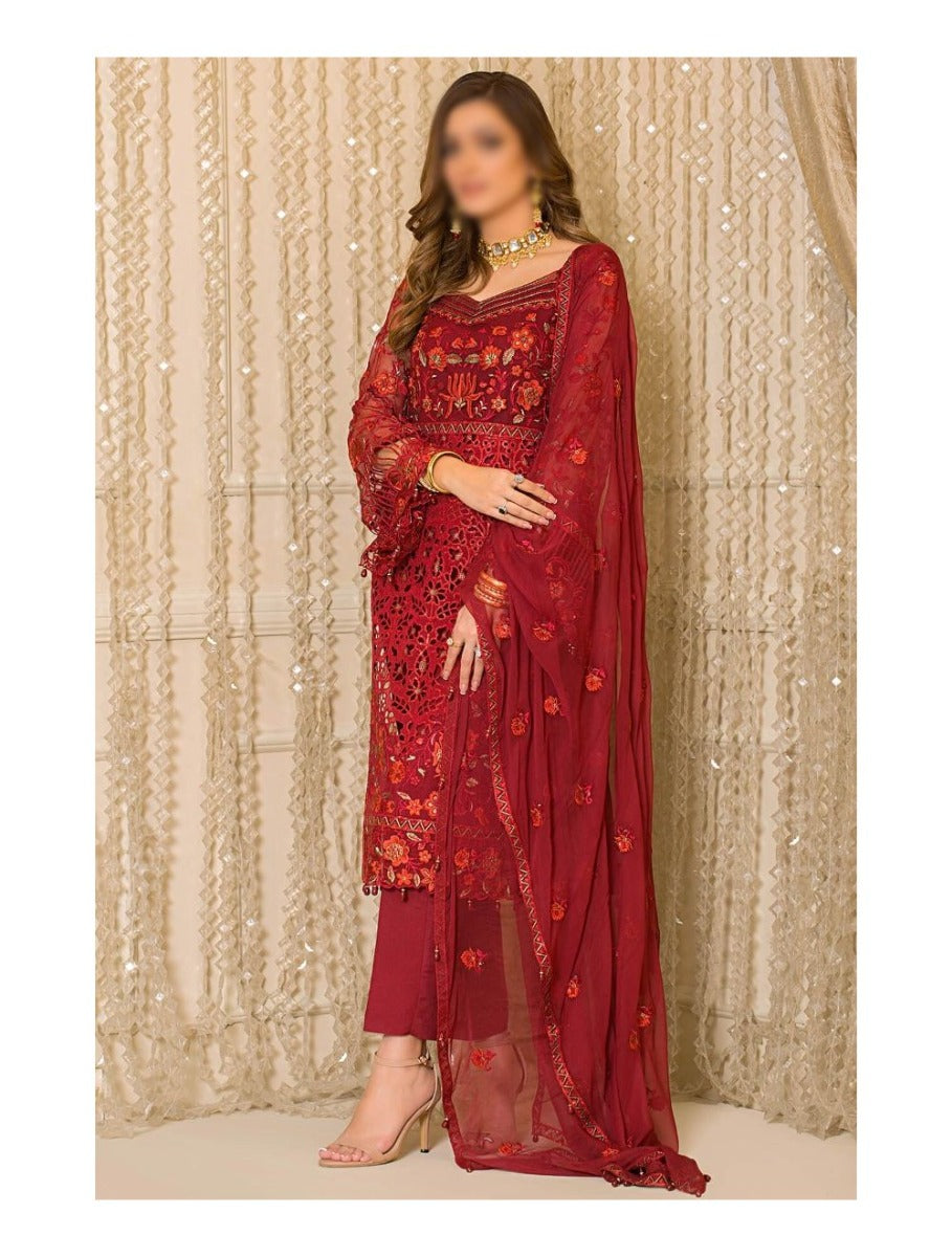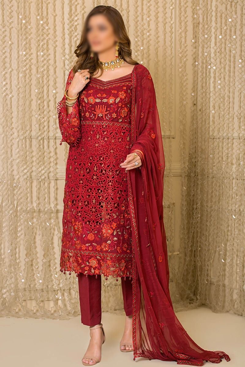 The standard style comes as a long-sleeved kameez with dupatta and trouser/shalwar.