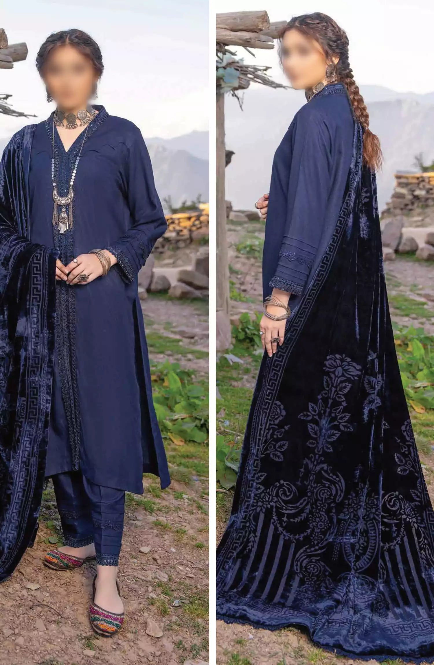 3 Piece Luxury Zari Wool Suit with Velvet Cutwork Shawl.