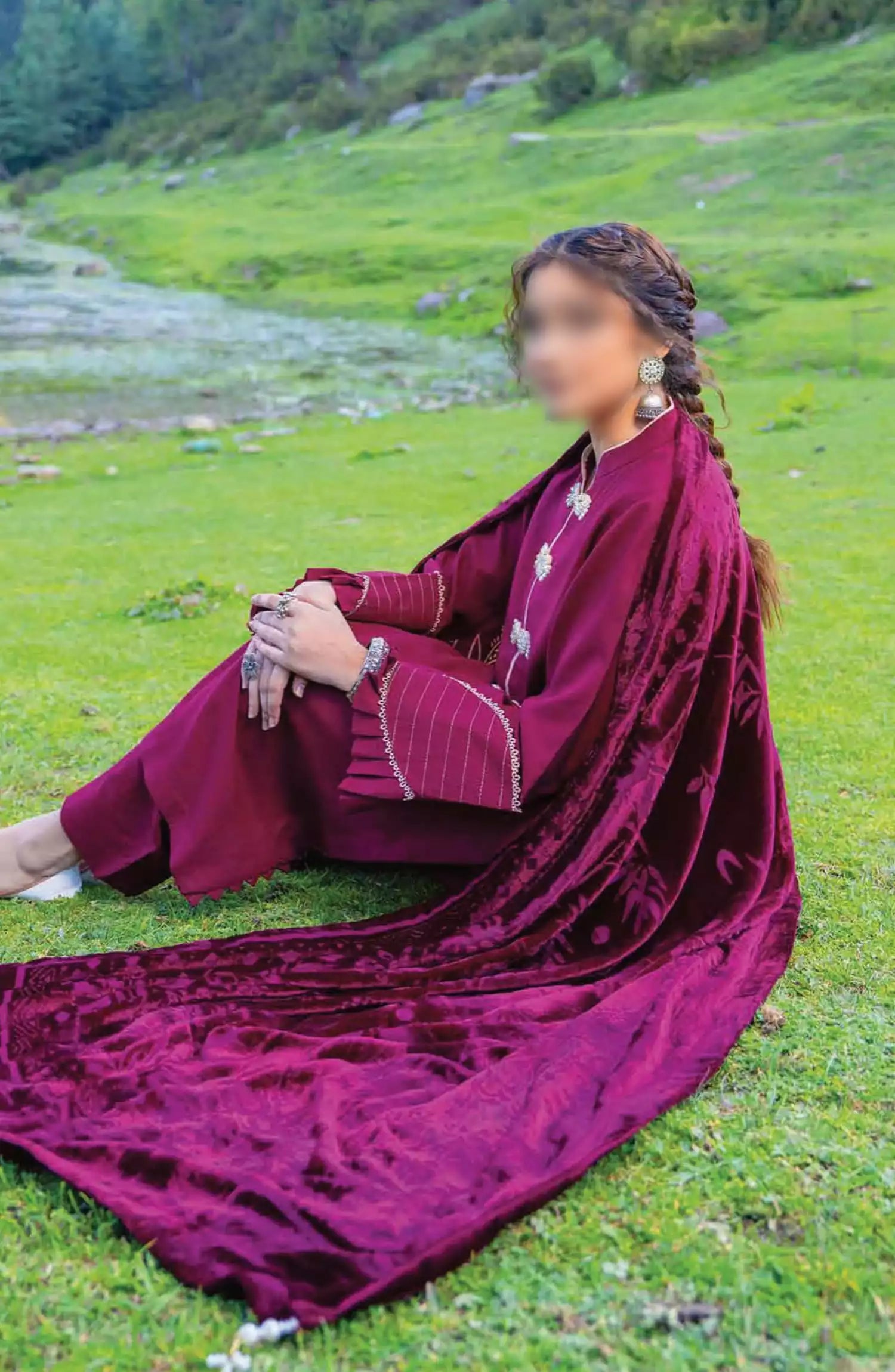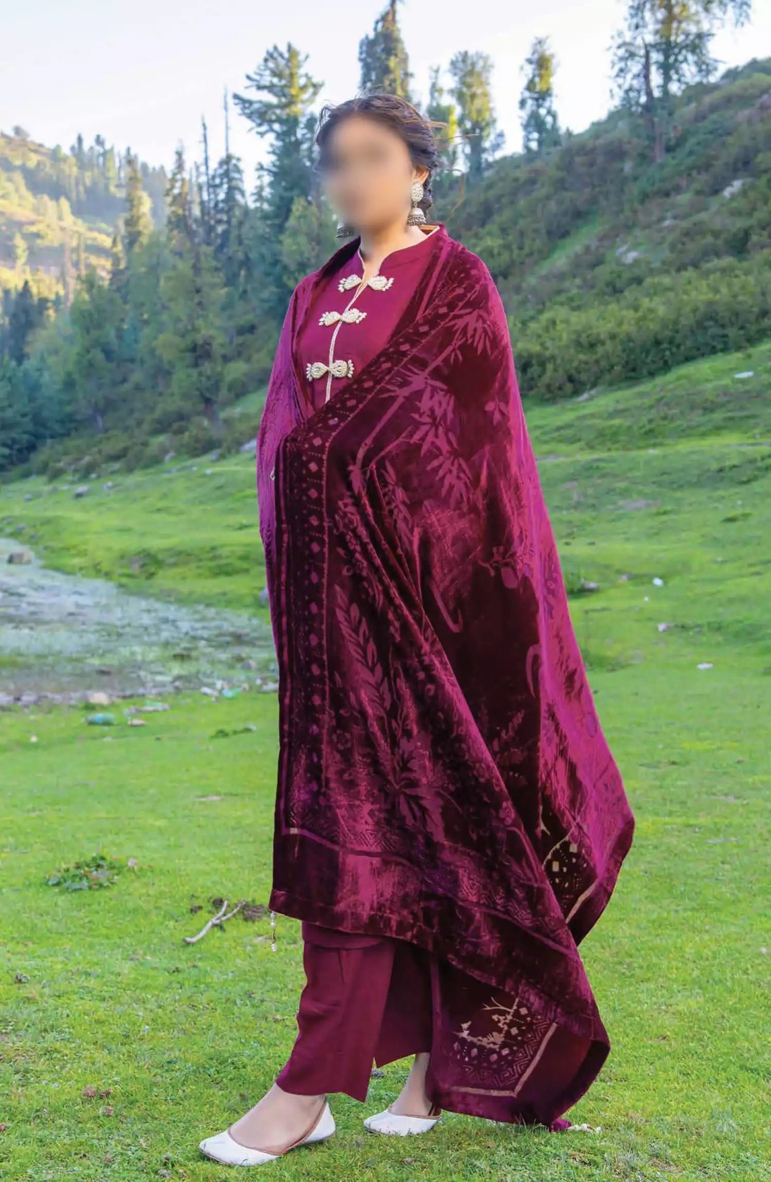 3 Piece Luxury Zari Wool Suit with Velvet Cutwork Shawl.