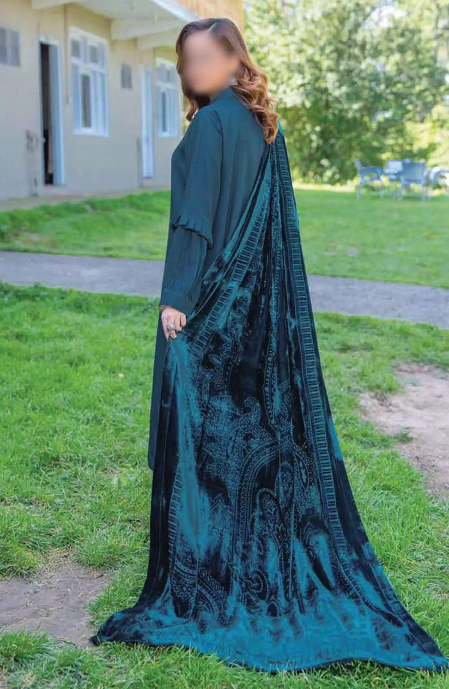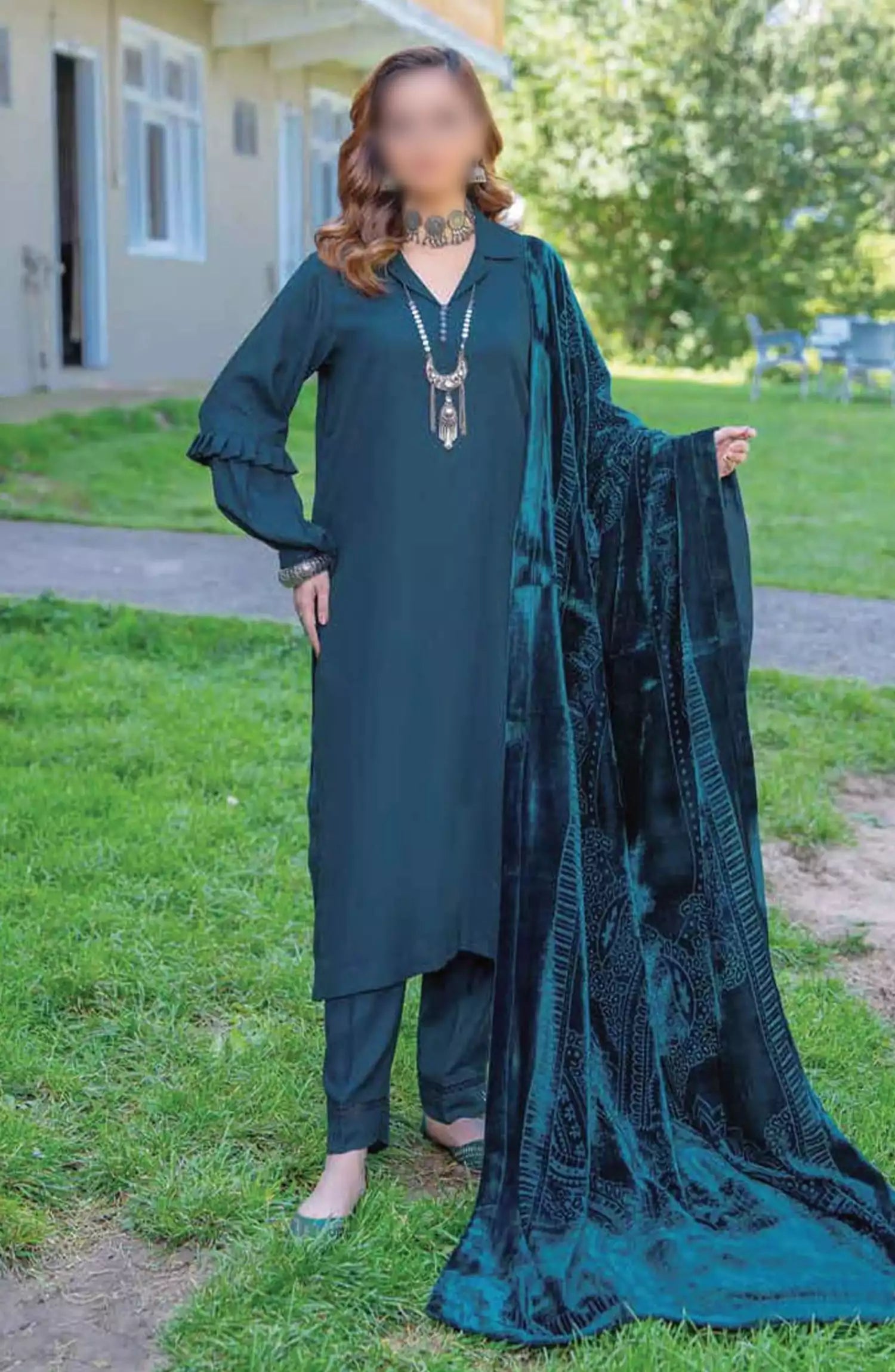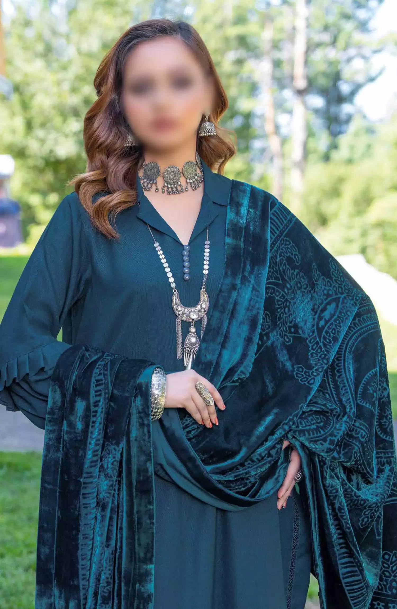 3 Piece Luxury Zari Wool Suit with Velvet Cutwork Shawl.