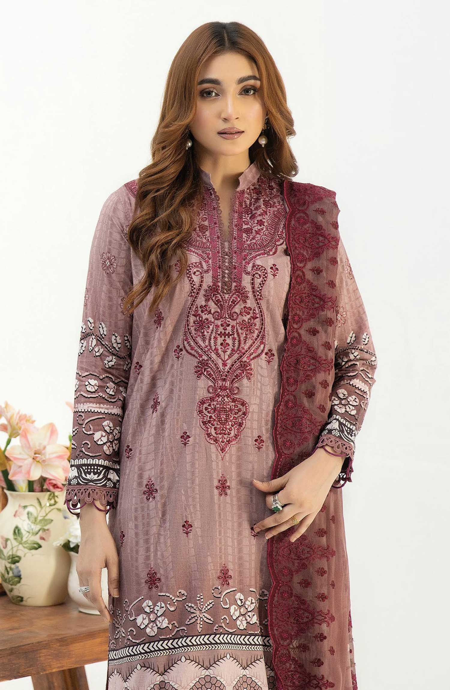 Modest Embroidered Khaddar Stitched 3 Piece Suit - 10050-Mar - MOD25WNT - Maroon - Winter Collection