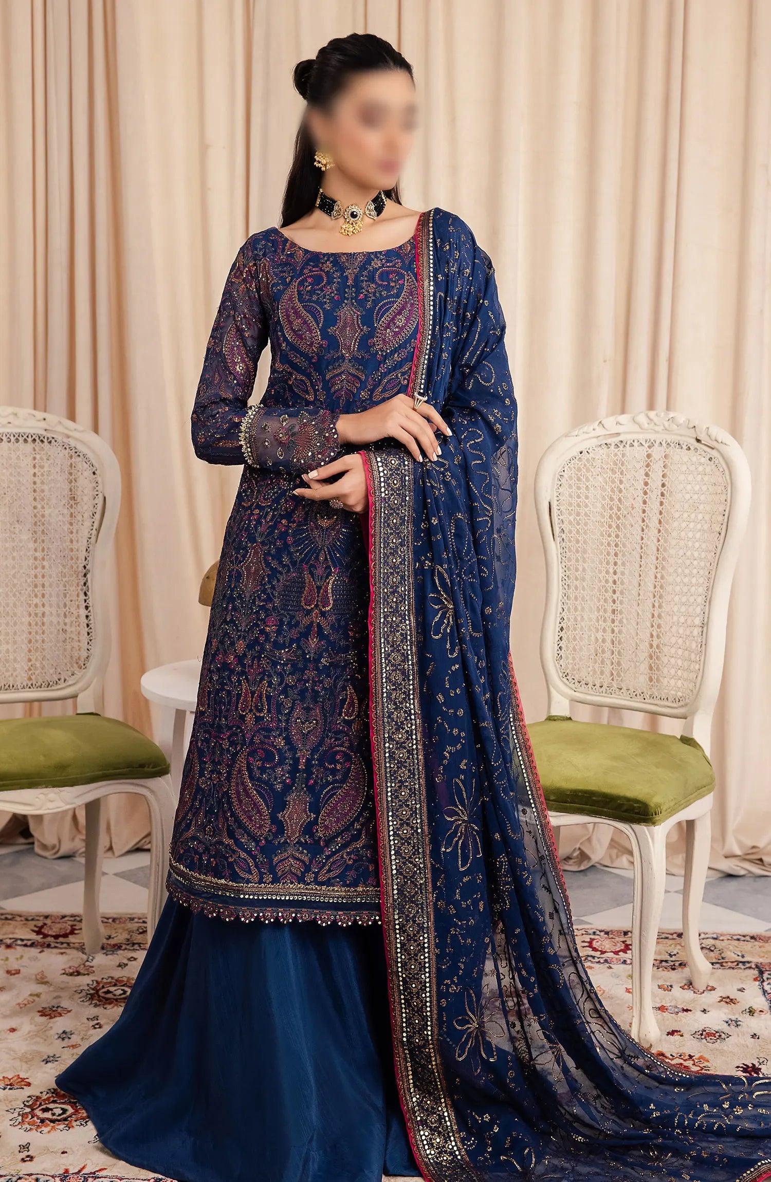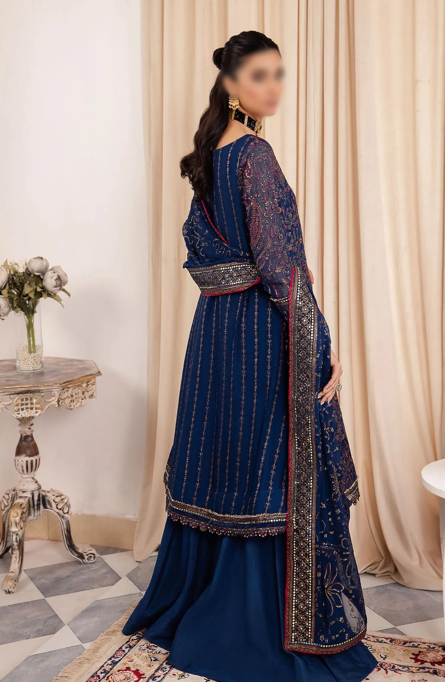 Dive into sophistication with our deep blue embroidered chiffon ensemble. The intricate details on the shirt front and