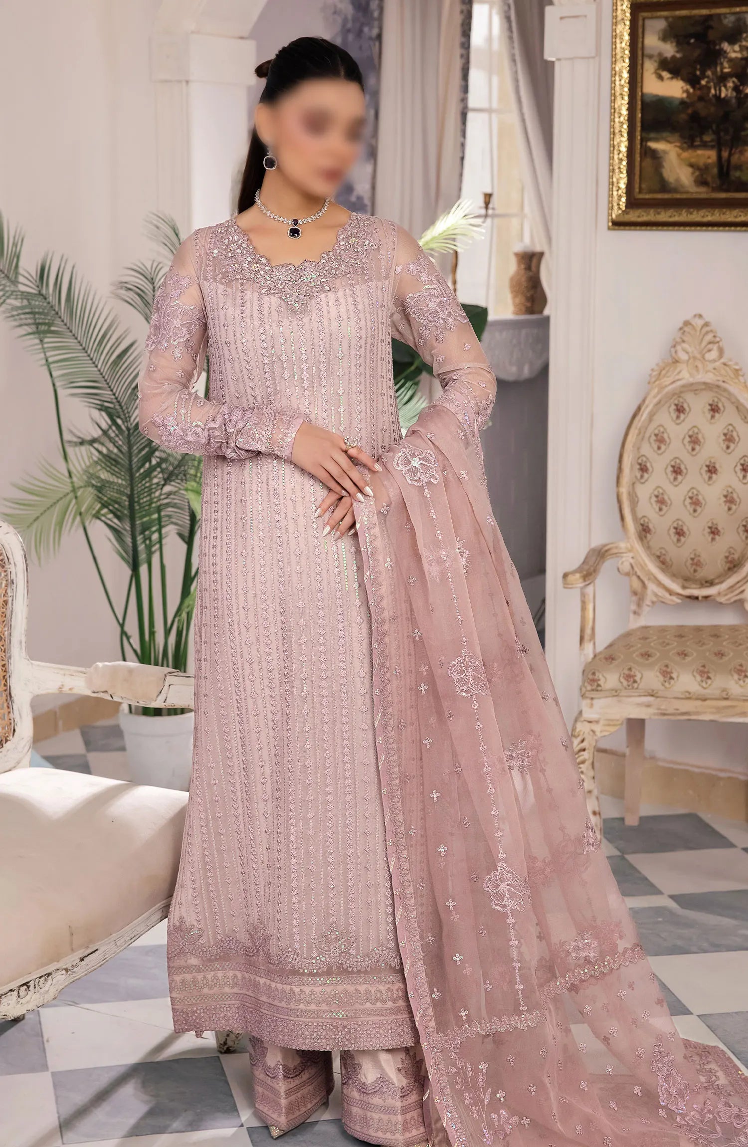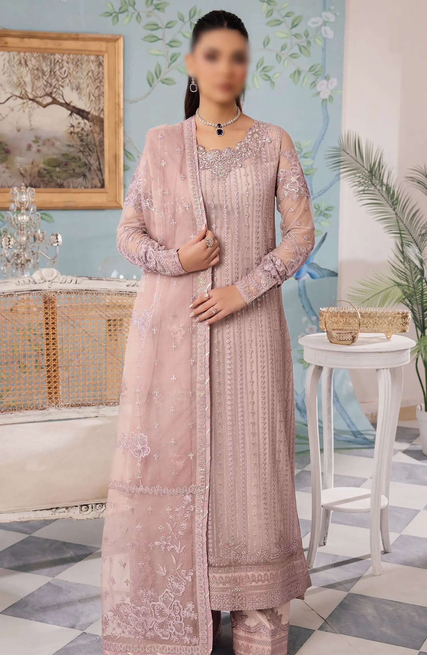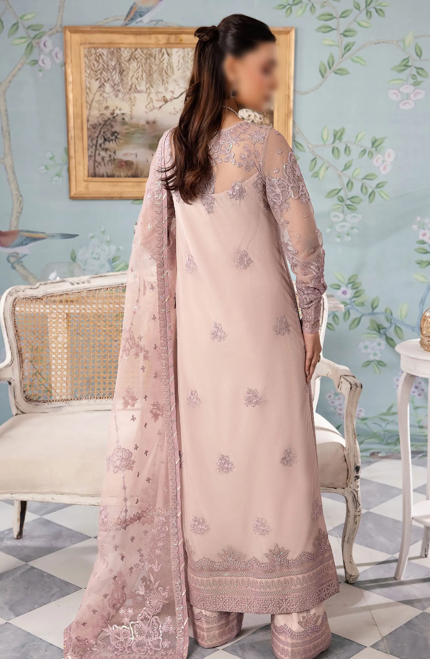 Bareen' captures the essence of grace and sophistication. This captivating attire boasts an intricately embroidered shirt, front and back,embodying the artistry of timeless beauty. The embroidered organza neckline, adorned with exquisite adda work, adds a touch of finesse to this enchanting ensemble. Paired harmoniously with an embroidered organza dupatta and solid pants. Step into a world where every detail speaks of refined style and understated glamour.