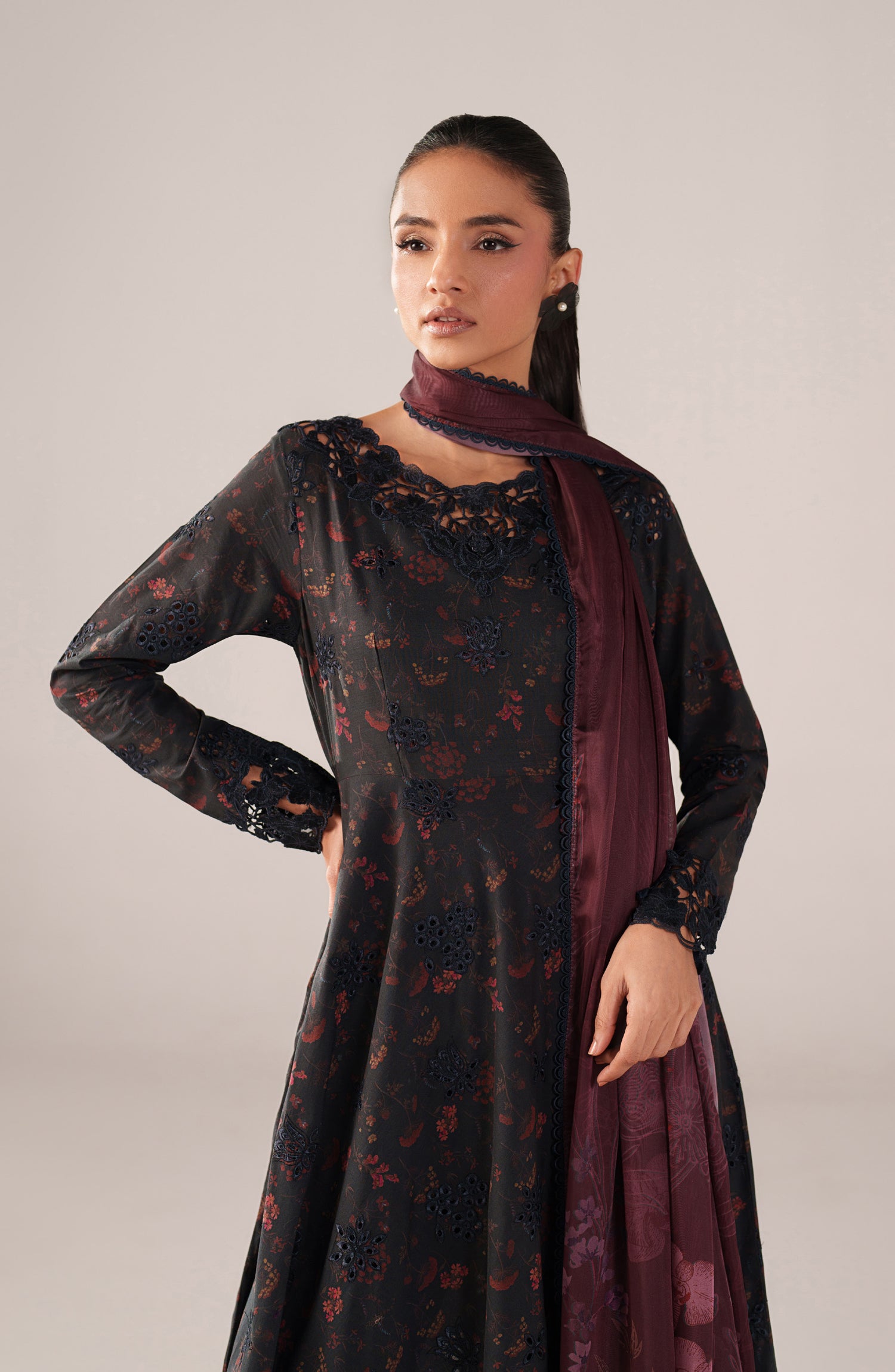 Frock Front, Back & Sleeves: Borer Embroidered Printed Lawn