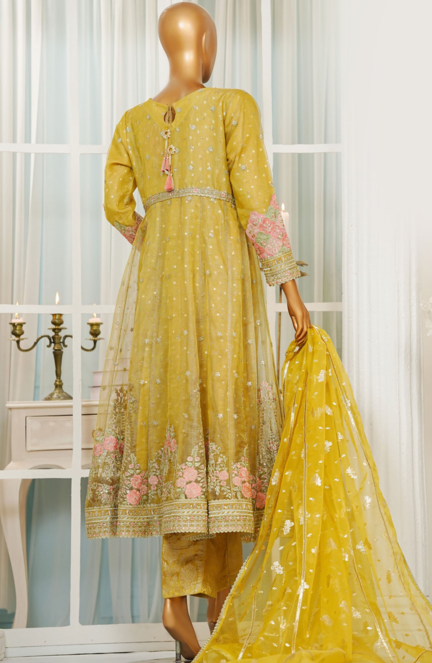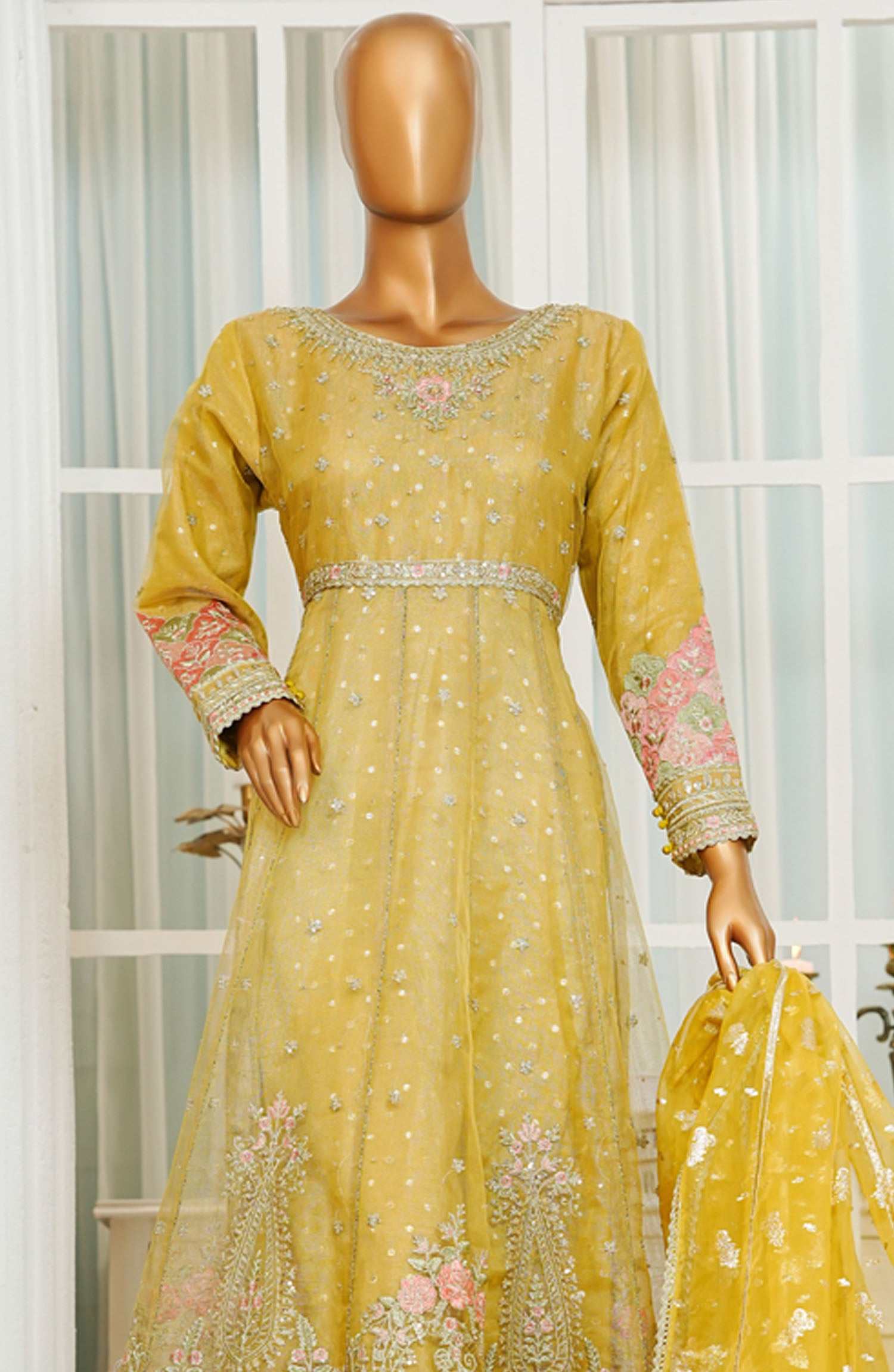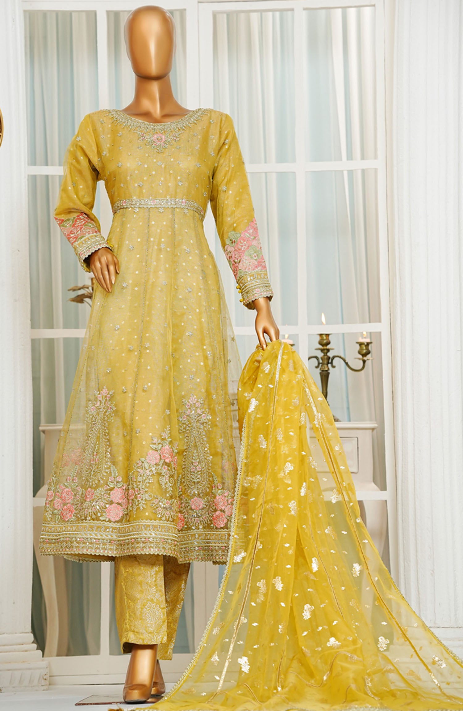 Jashn by HZ Textile Embroidered Zarri Net Stitched 3 Piece Suit - HZK-208 Yellow - HZ25JFF - Yellow - Wedding Collection
