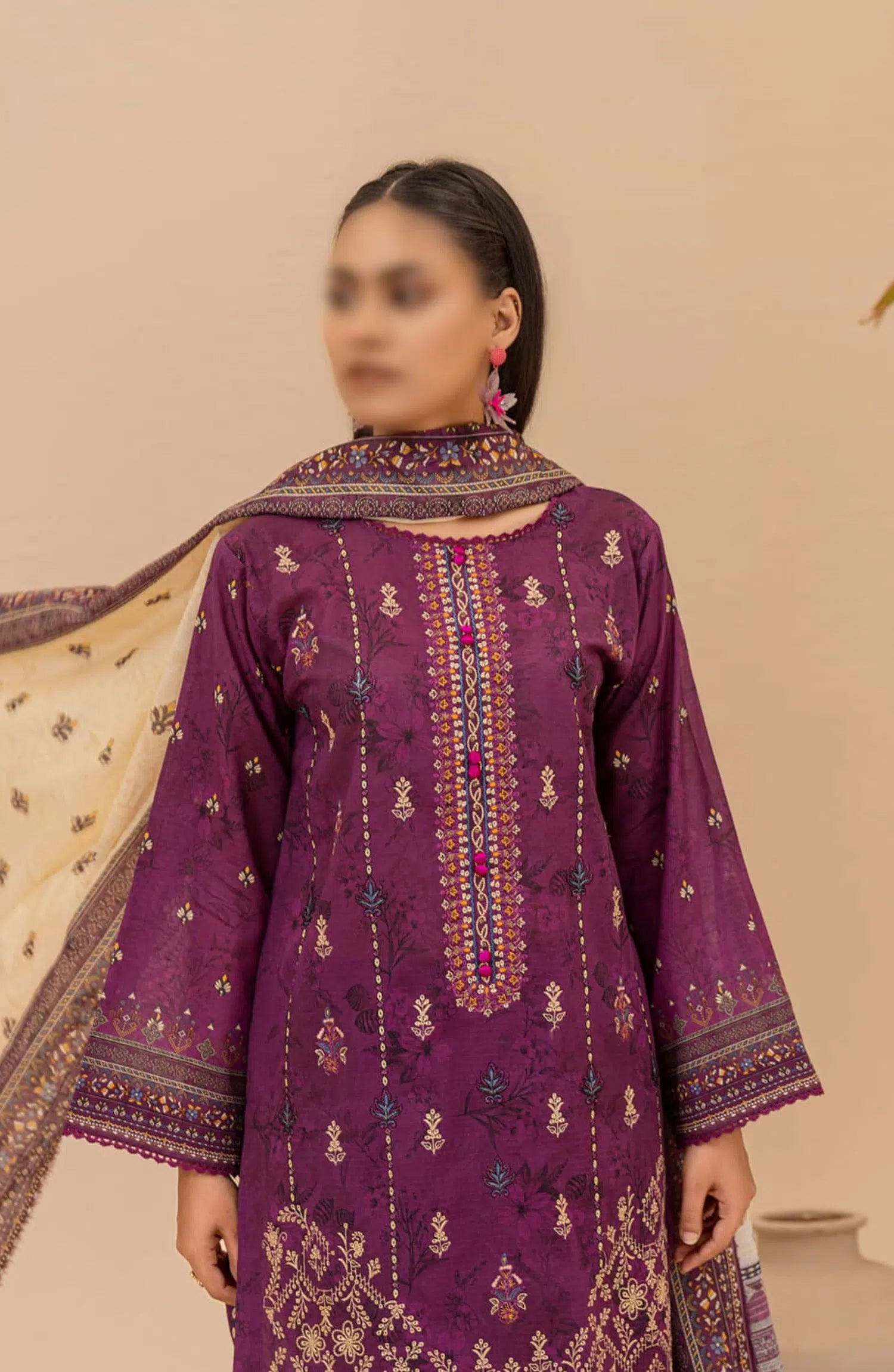 Jasmine Lawn Dora Digital Print and Embroidered Collection Vol 16 has been styled in the image for photography and illustrative purposes.