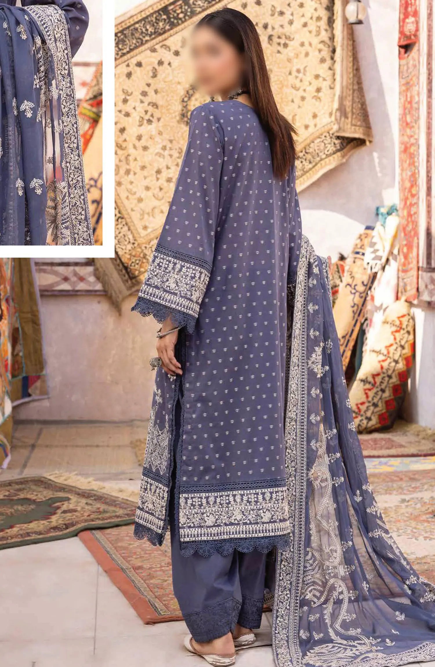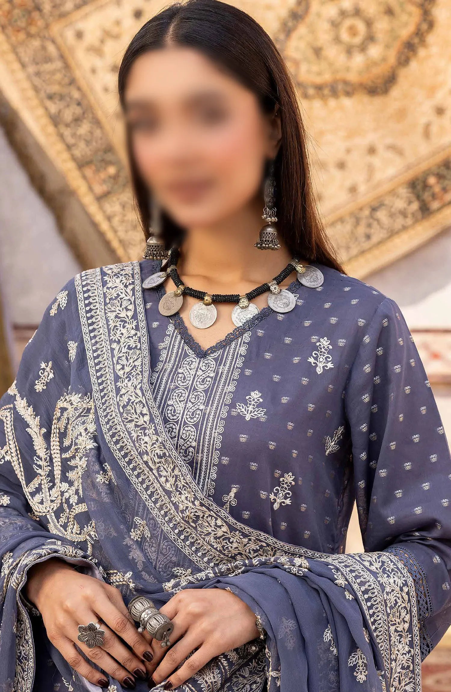 Johra Naqsh Embroidered Banarsi Jacquard Lawn Collection has been styled in the image for photography and illustrative purposes.