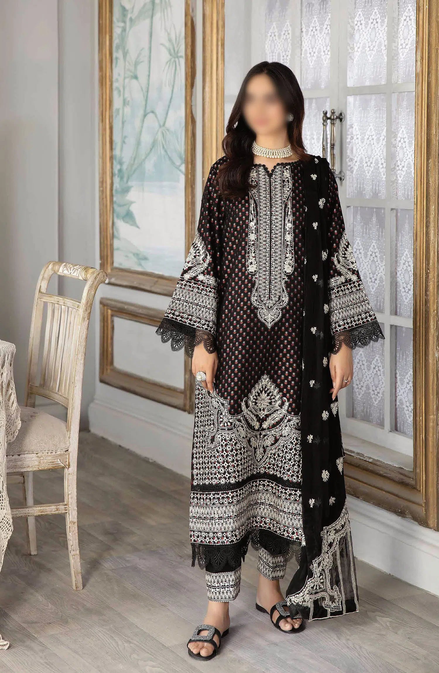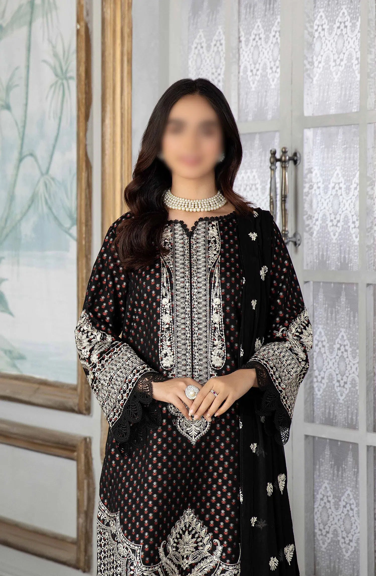 Modest Embroidered Khaddar Stitched 3 Piece Suit - 9990-Blk - MOD25WNT - Black - Winter Collection