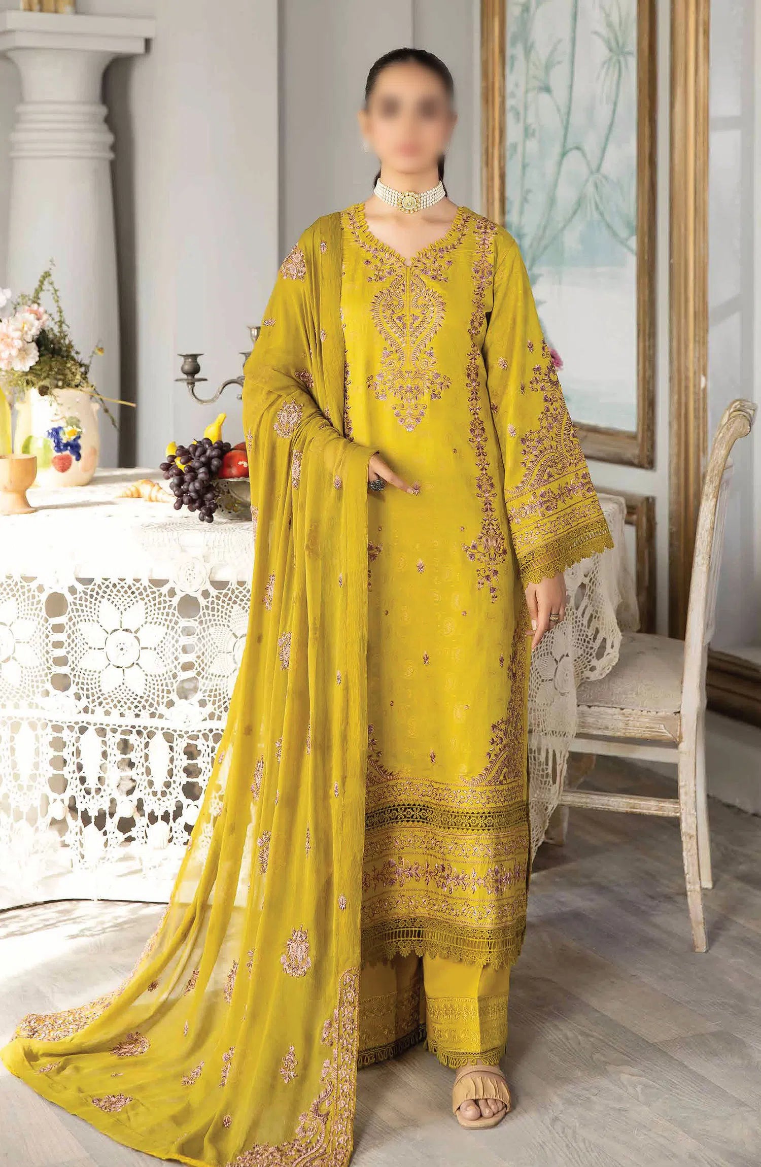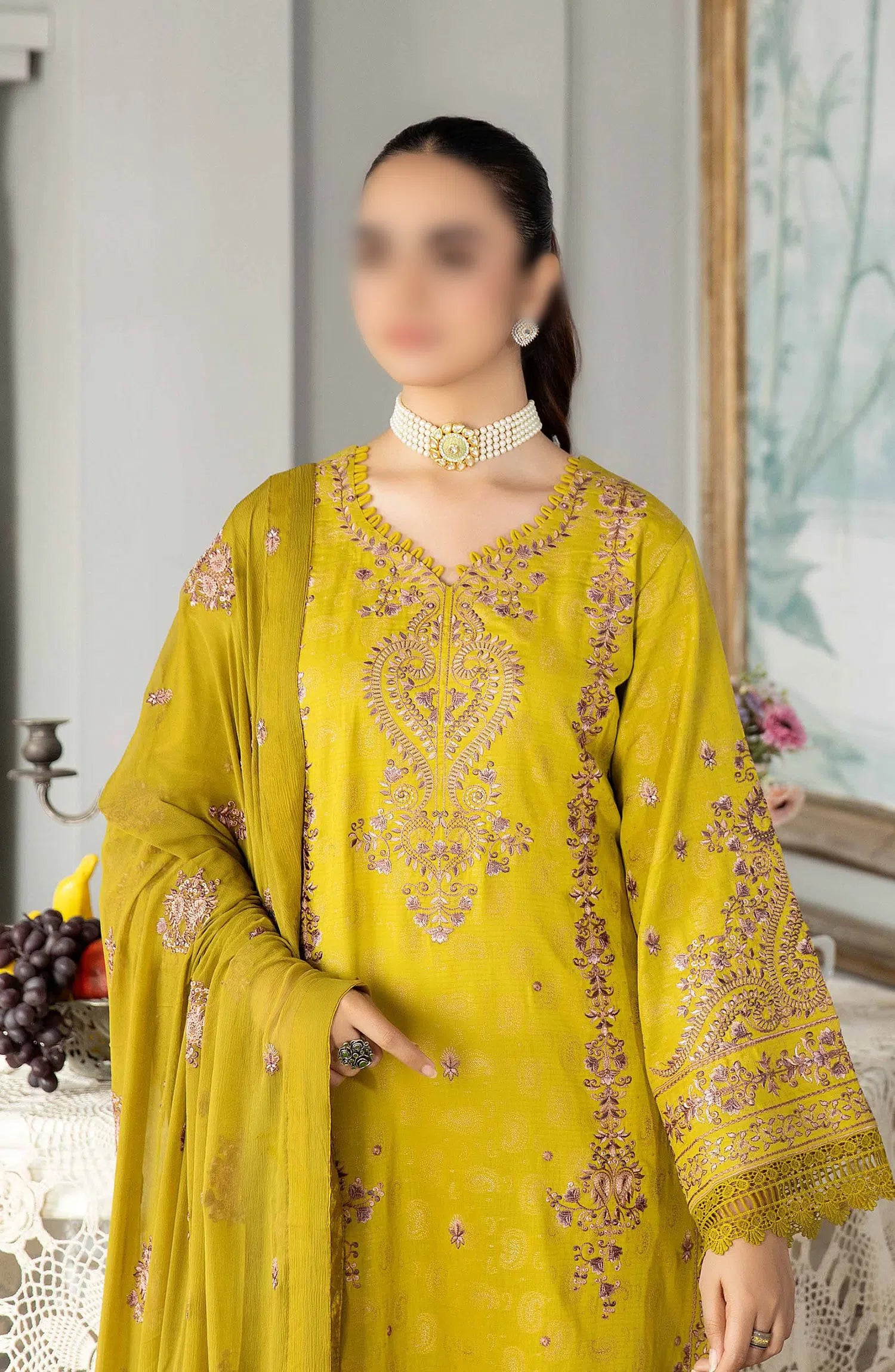 Johra Nasheman Embroidered Banarsi Jacquard Lawn Collection 2024 has been styled in the image for photography and illustrative purposes.
