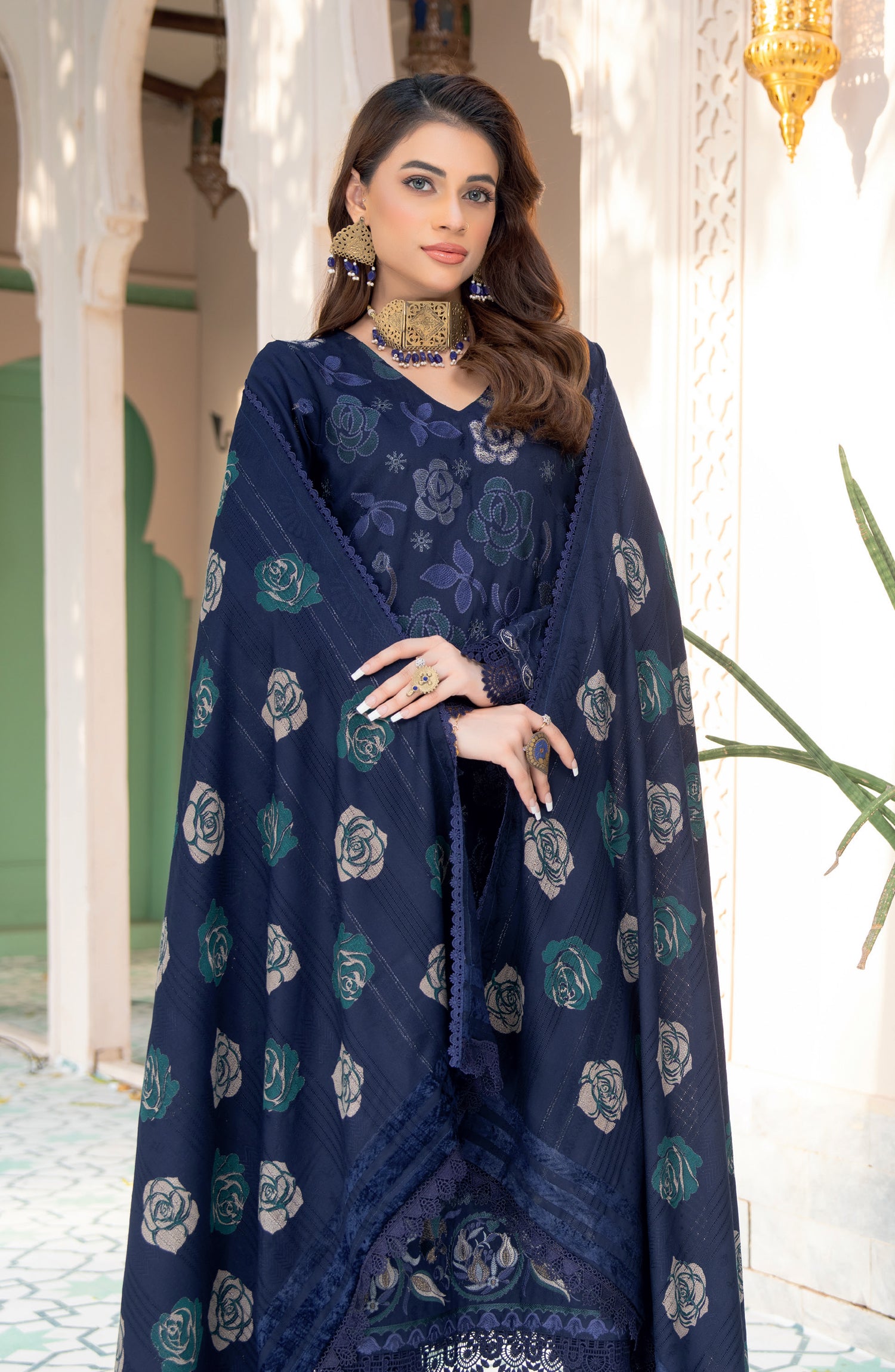 Premium Embroidered Dhanak Unstitched Suit with Fancy Hand Print Wool Shawl