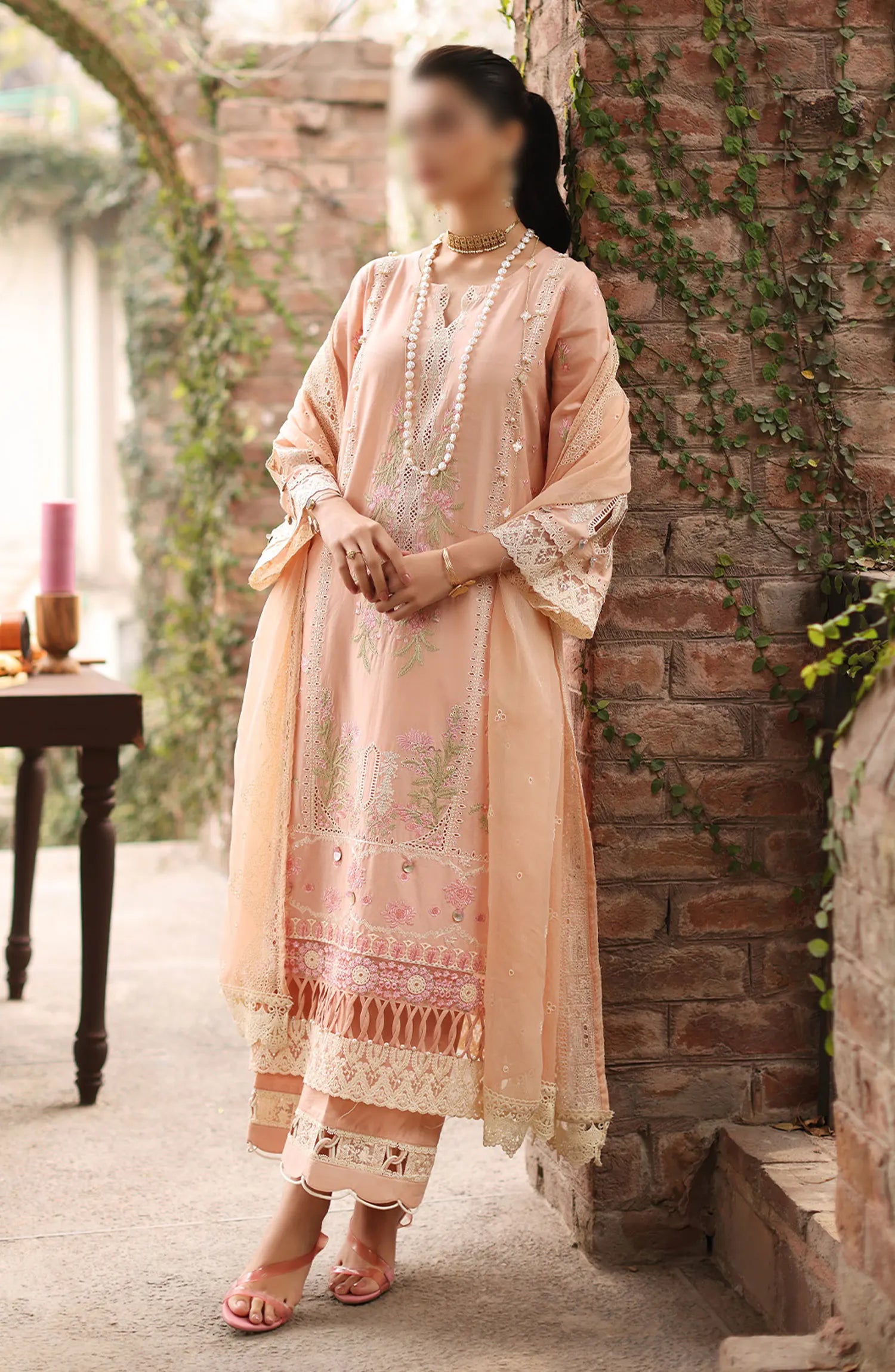 The standard style comes as a long-sleeved kameez with dupatta and trouser/shawlar.