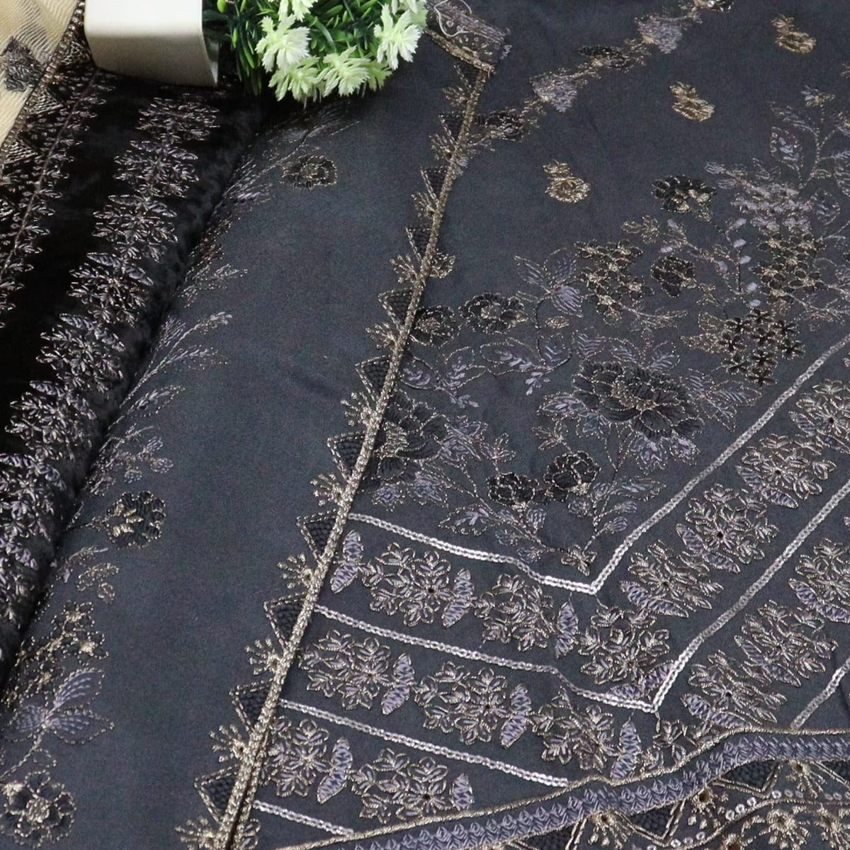 Kashish Unstitched Embroidered Leather Peach Collection has been styled in the image for photography and illustrative purposes.
