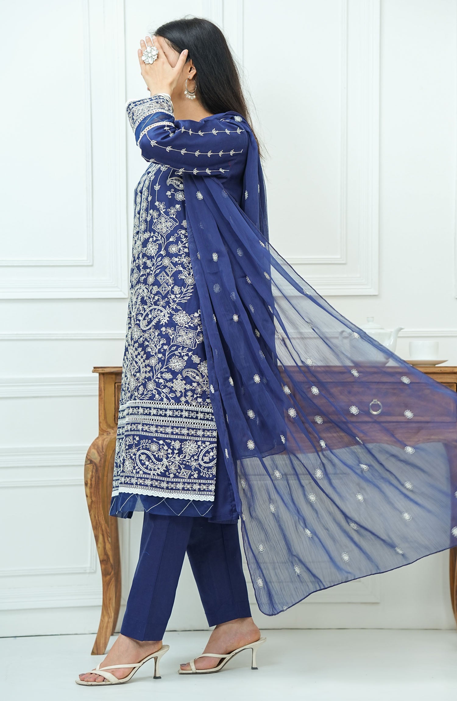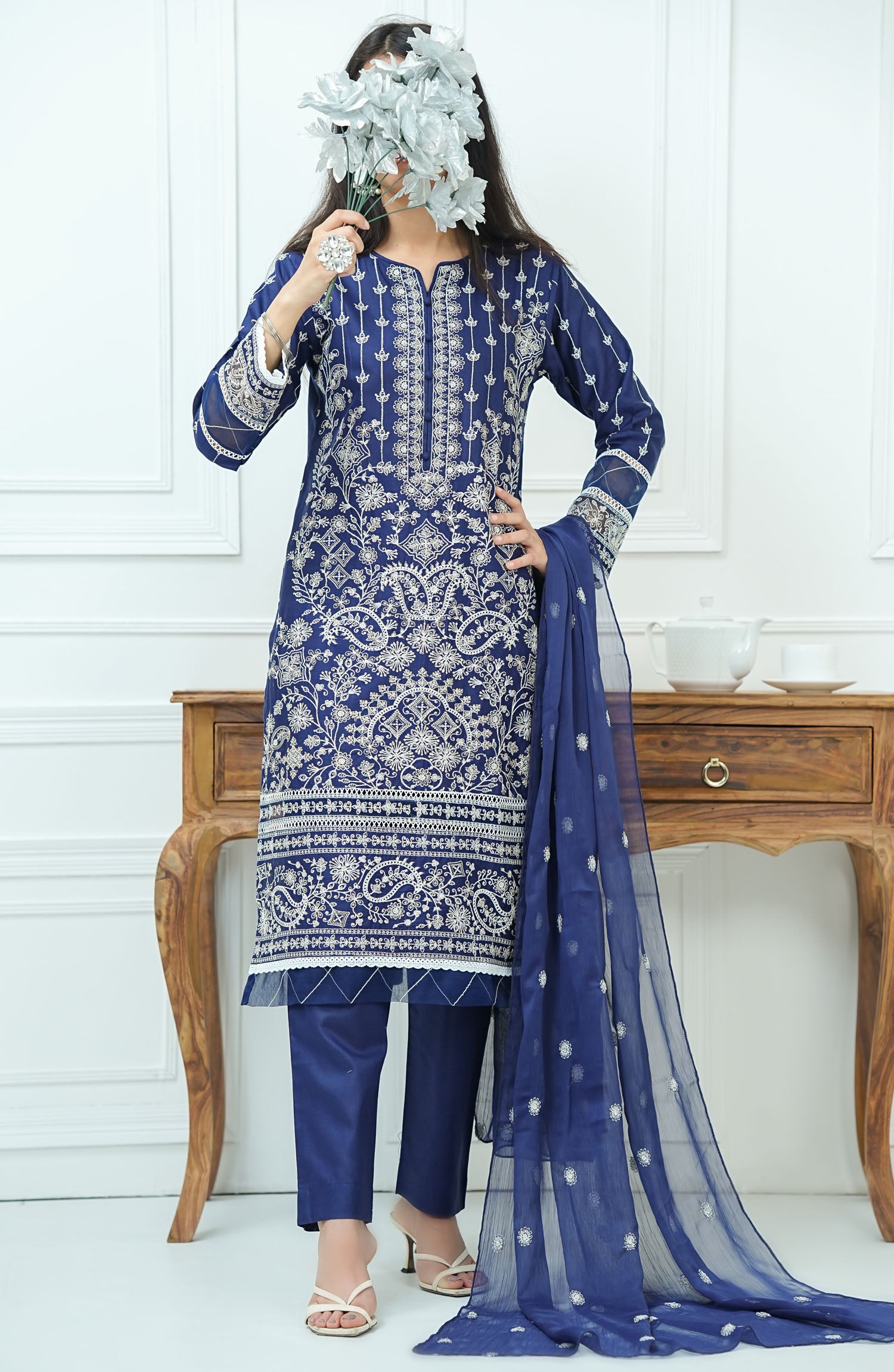 The standard style comes as a long-sleeved kameez with dupatta and trouser/shawlar.