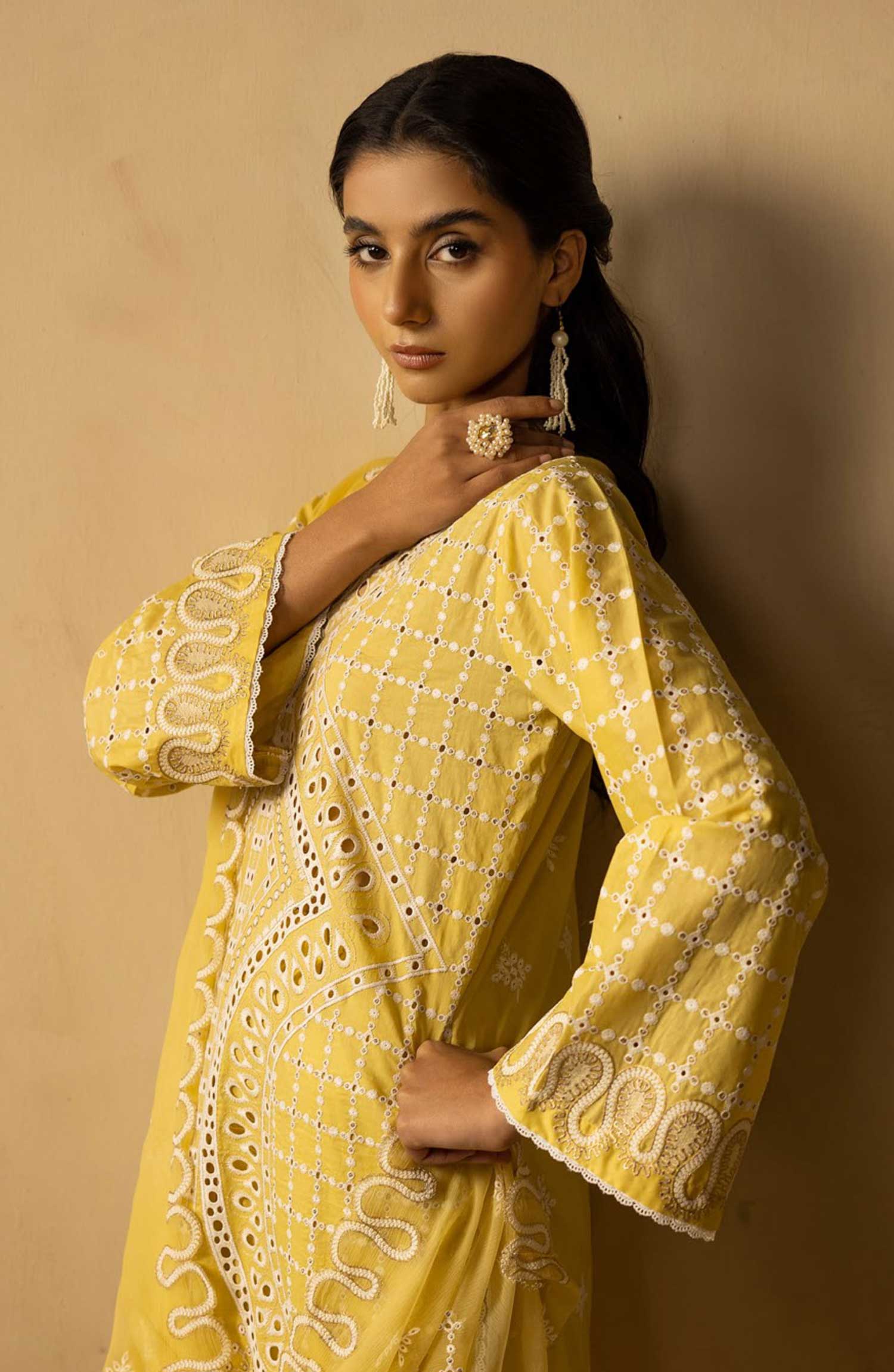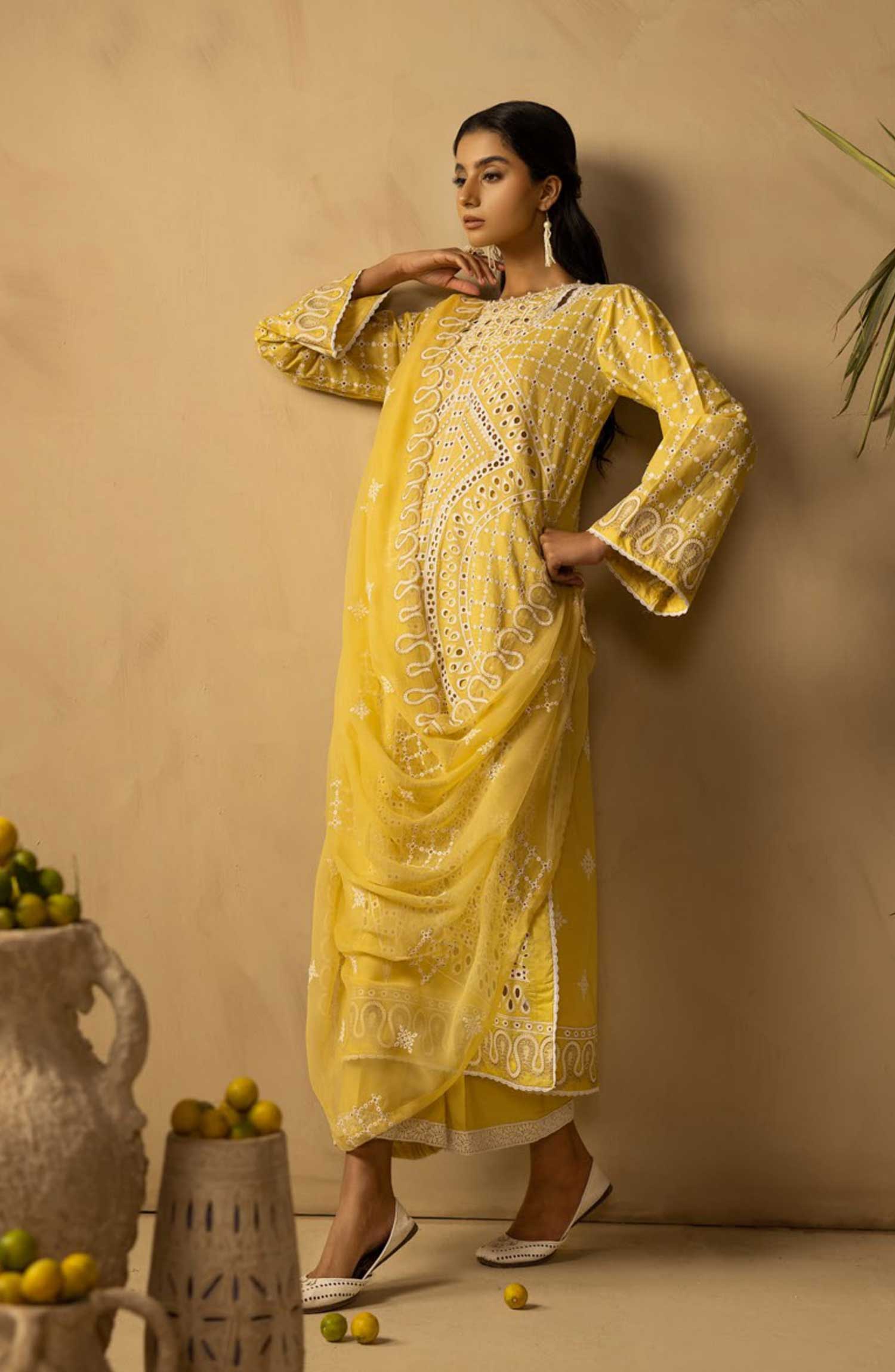 The standard style comes as a long-sleeved kameez with dupatta and trouser/shawlar.