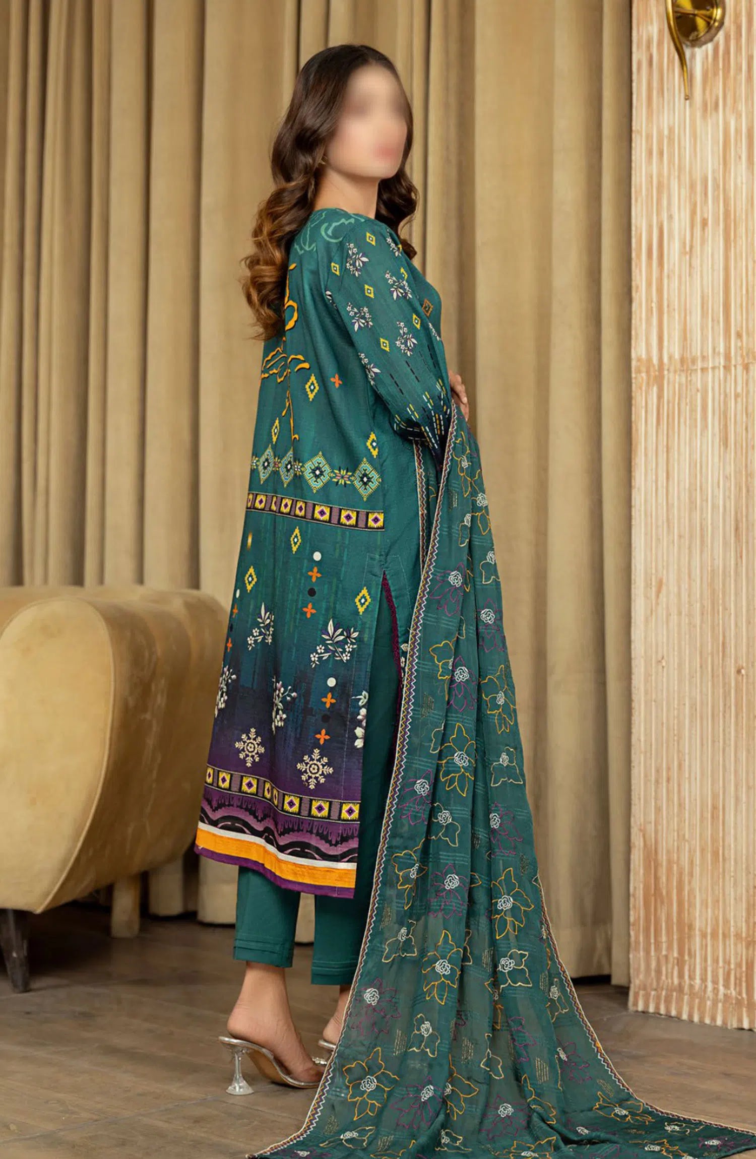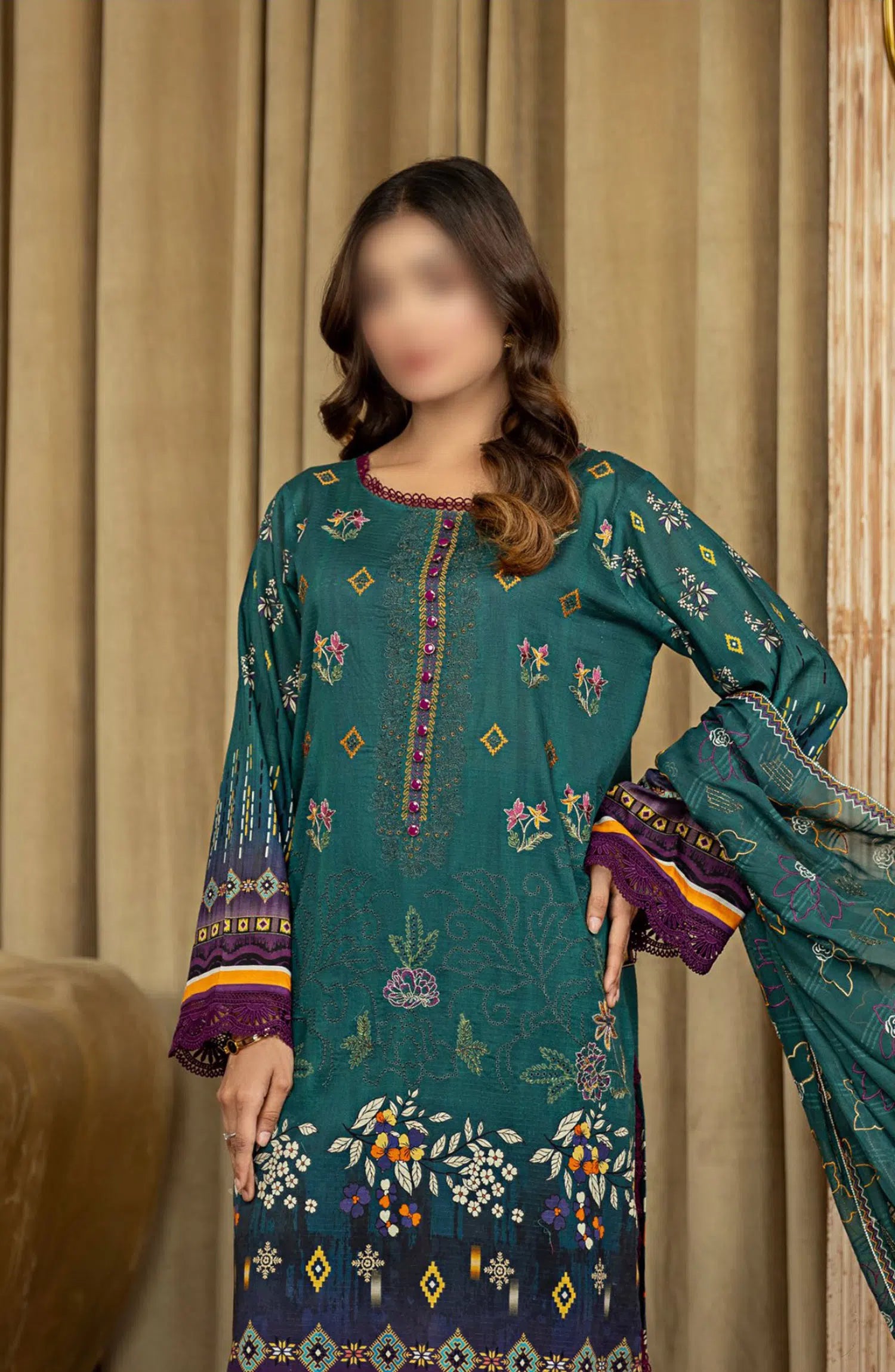 3 Piece Digital Printed and Embroidered Lawn Dora Suit with Fancy Chiffon Embroidered Dupatta.