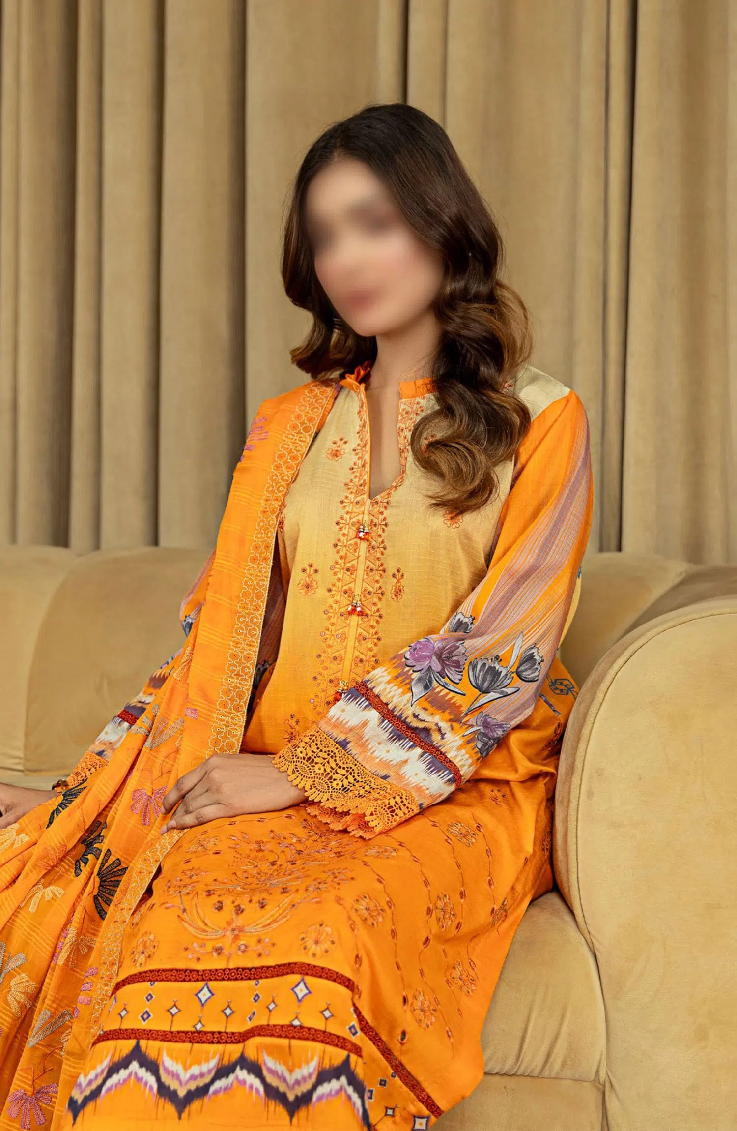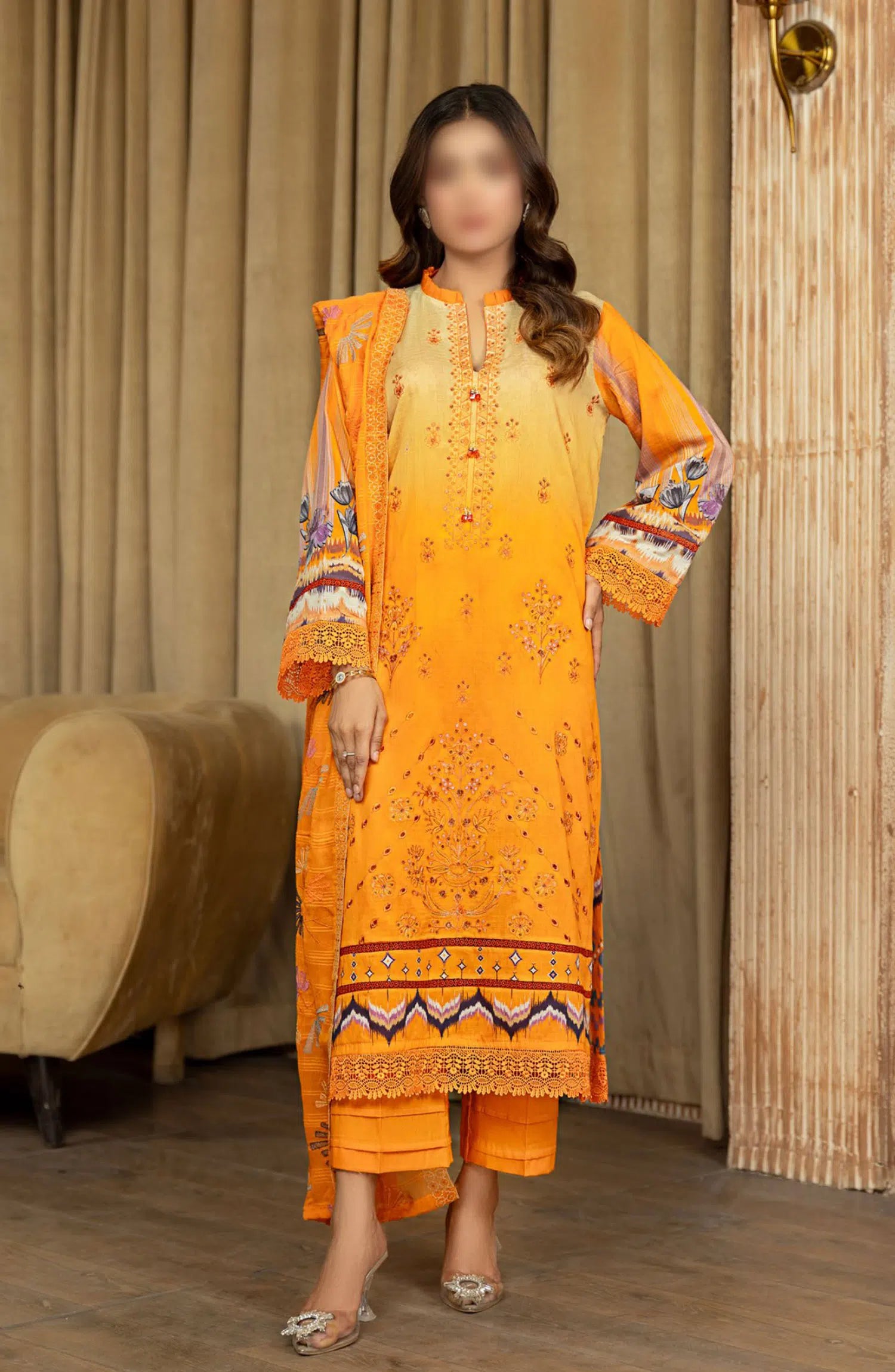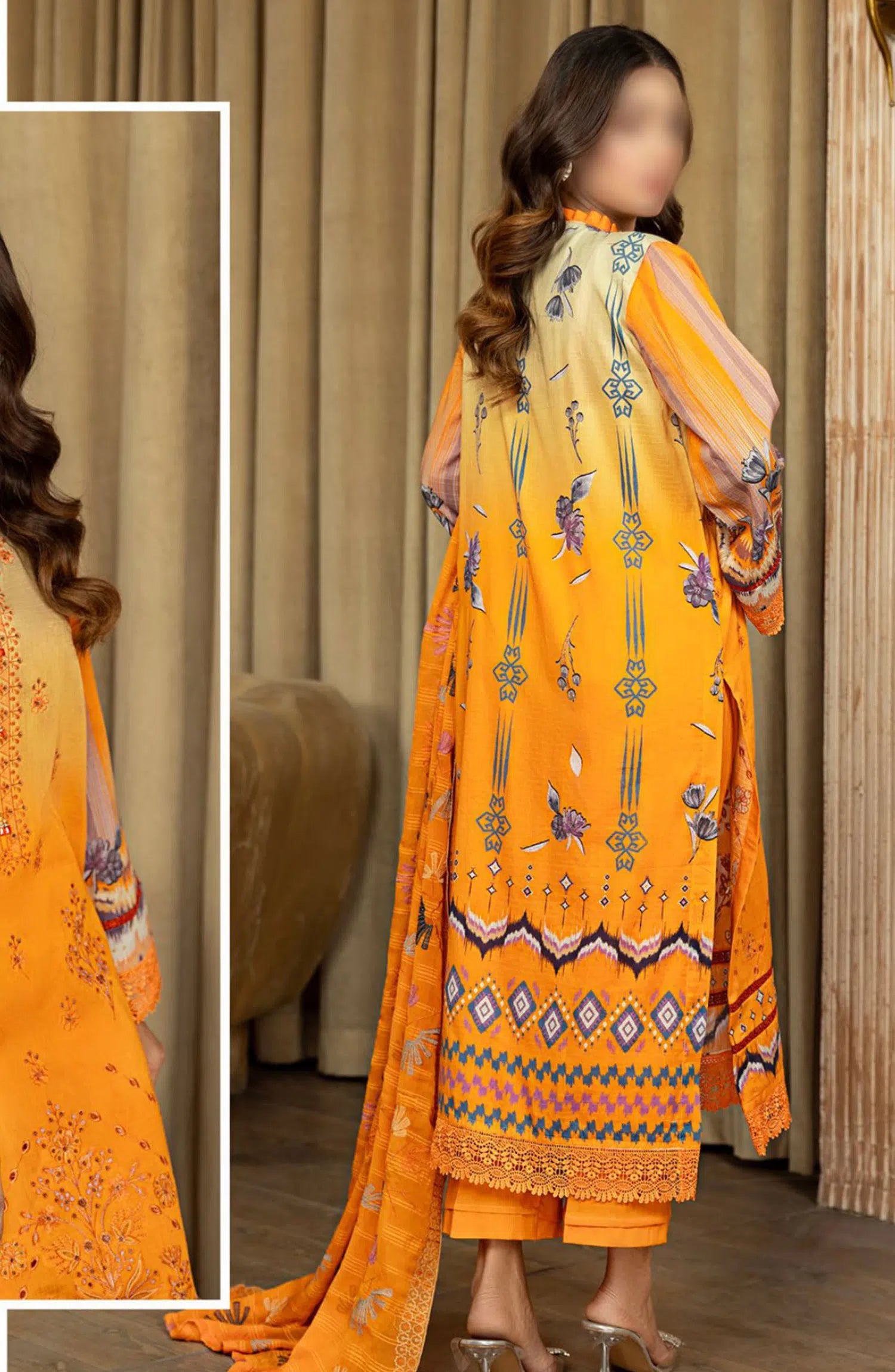 3 Piece Digital Printed and Embroidered Lawn Dora Suit with Fancy Chiffon Embroidered Dupatta.