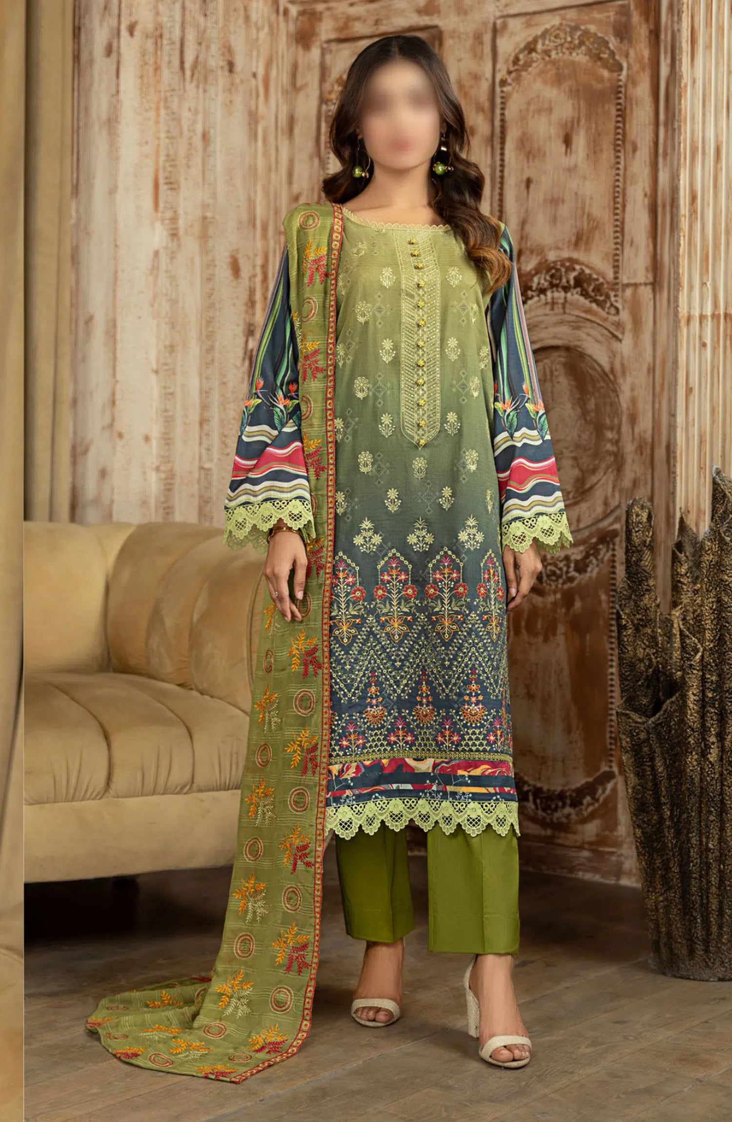 The standard style comes as a long-sleeved kameez with dupatta and trouser/shawlar.
