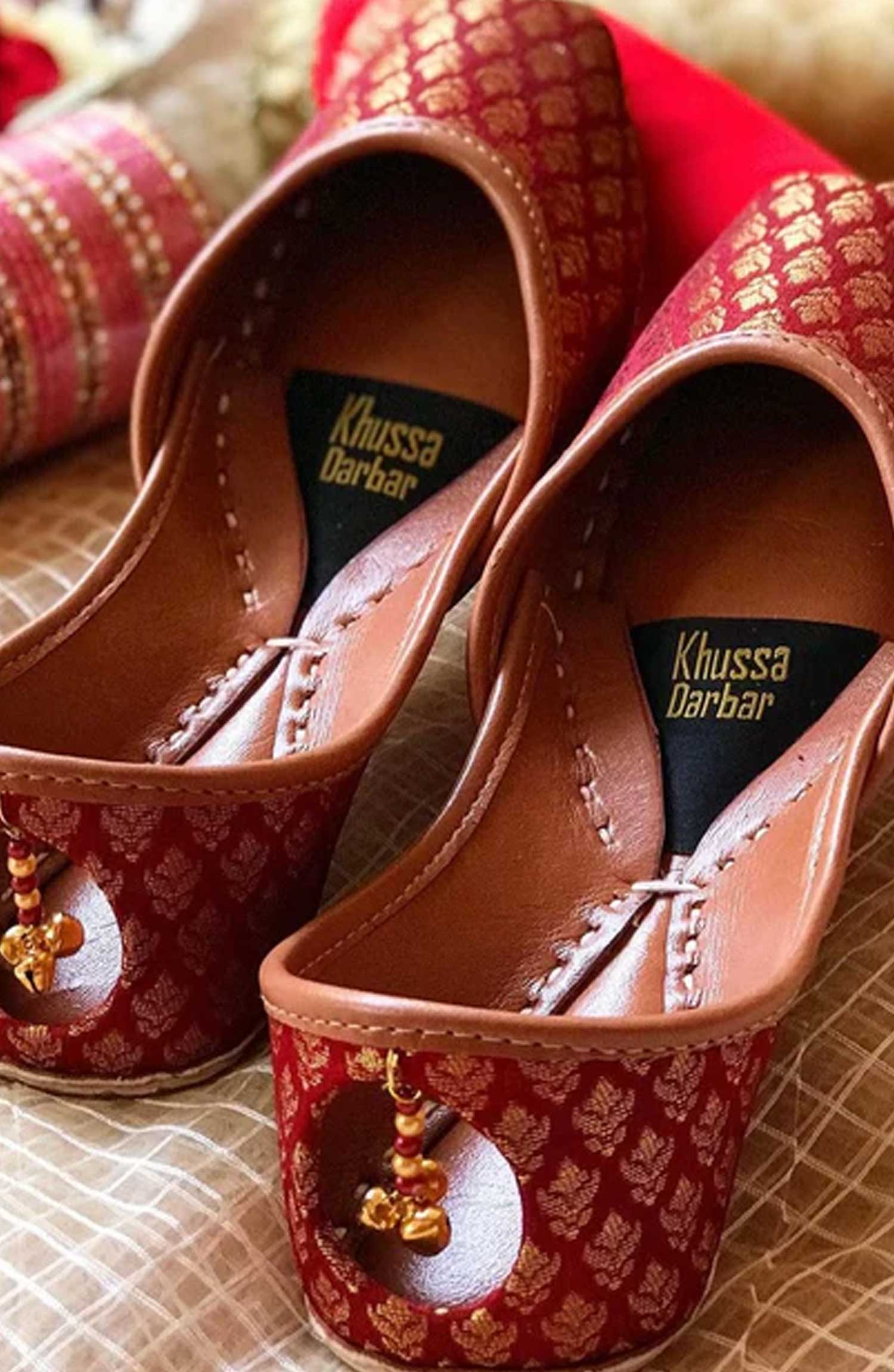 Simple Banarsi khussa with a pretty tassel dangling in the hole at the back.