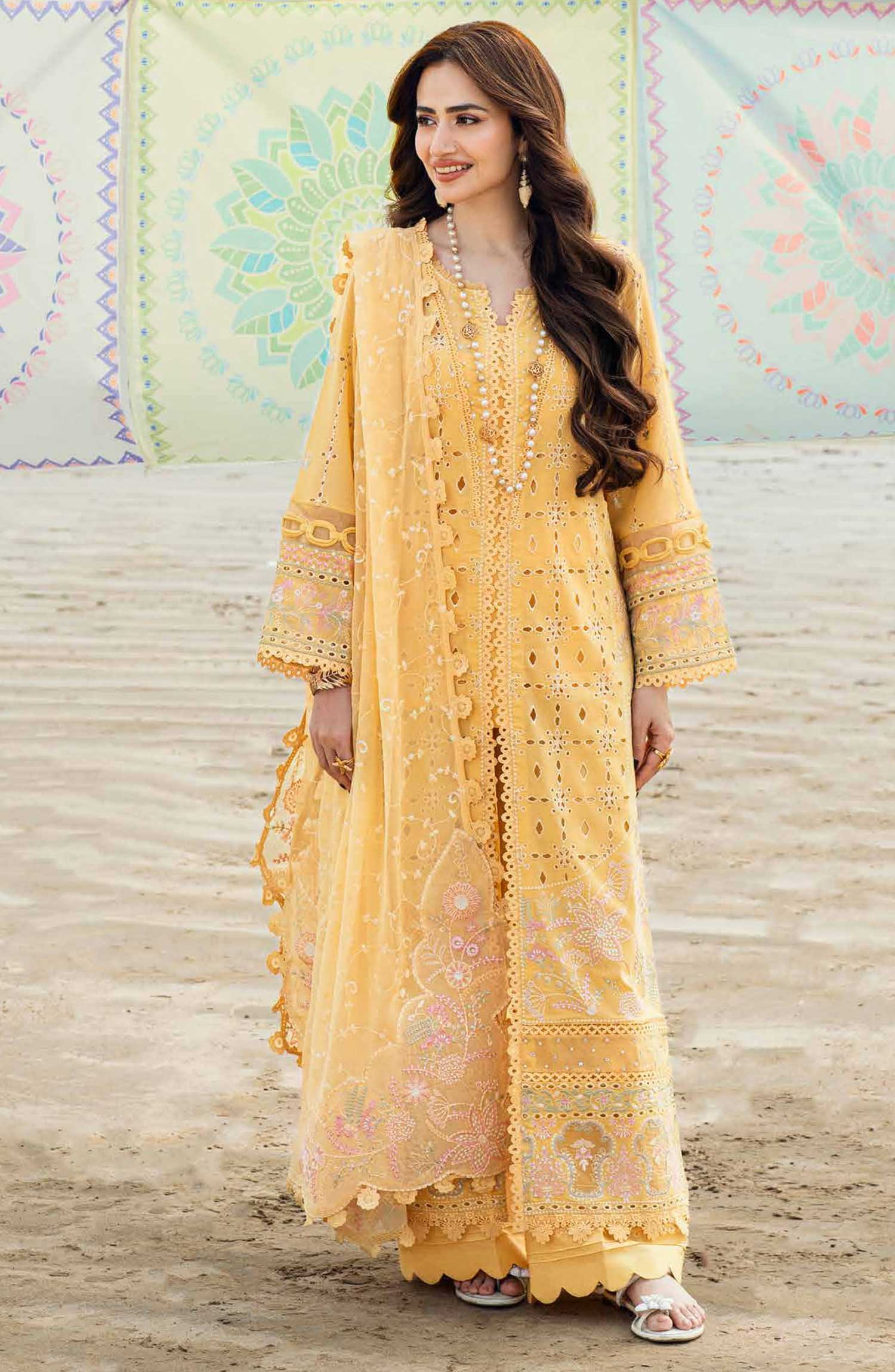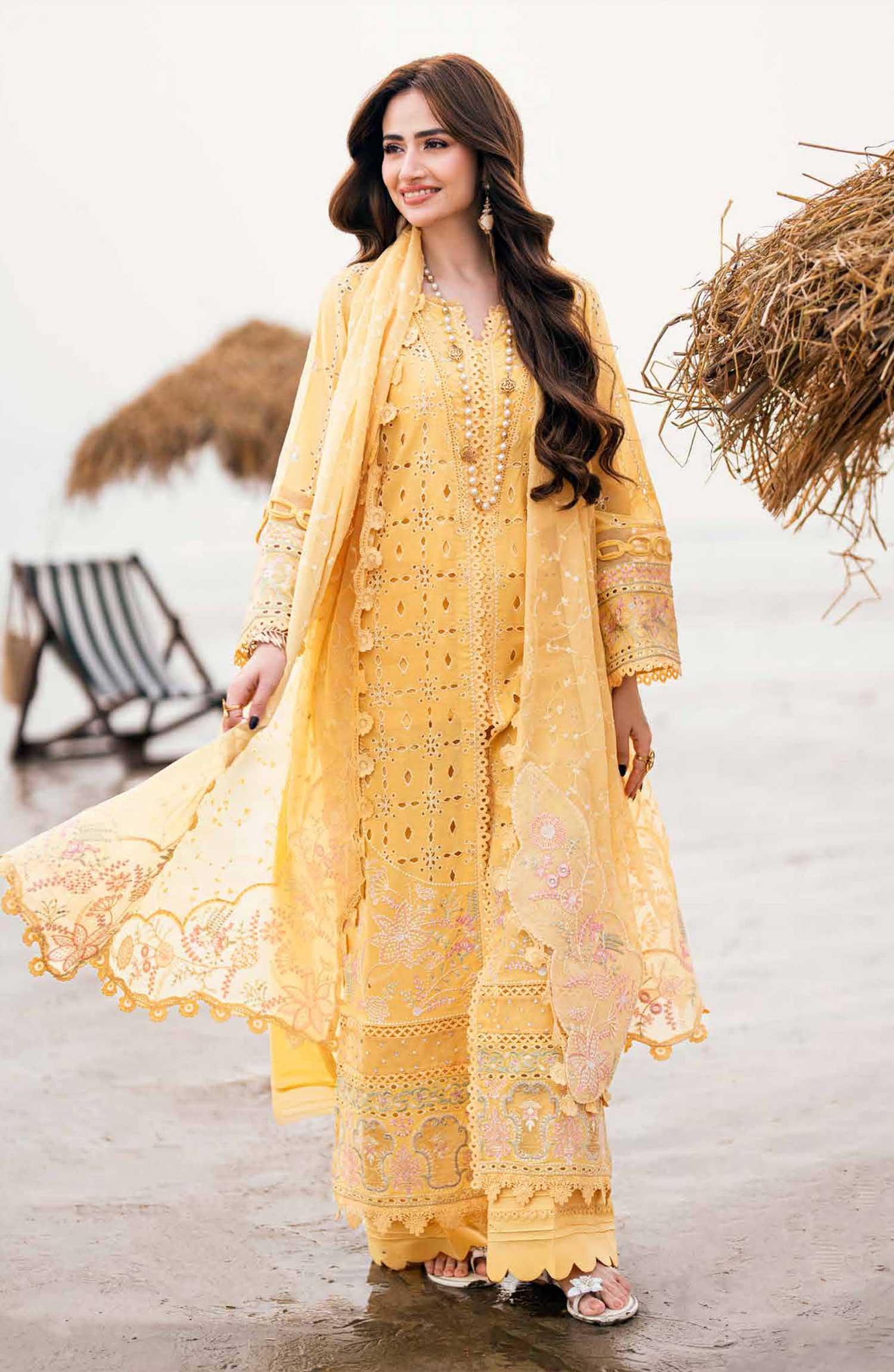 Nureh Khuwab Embroidered and Embellished Swiss Voile Collection has been styled in the image for photography and illustrative purposes.