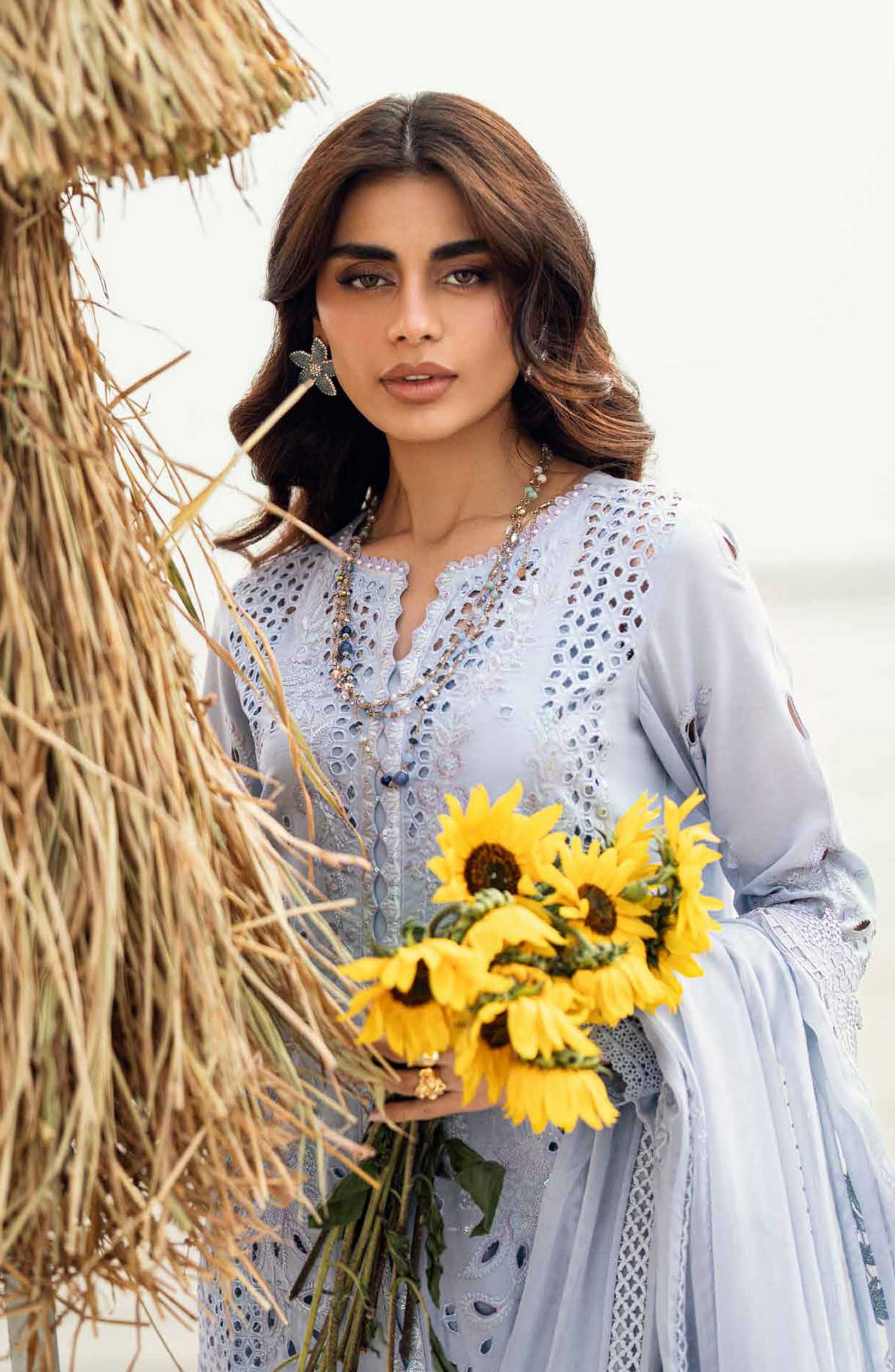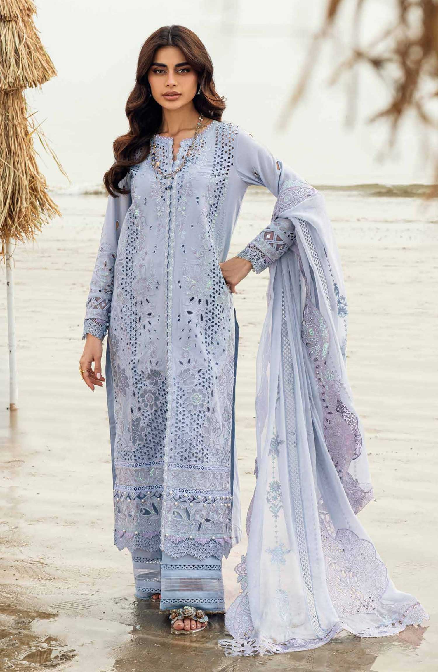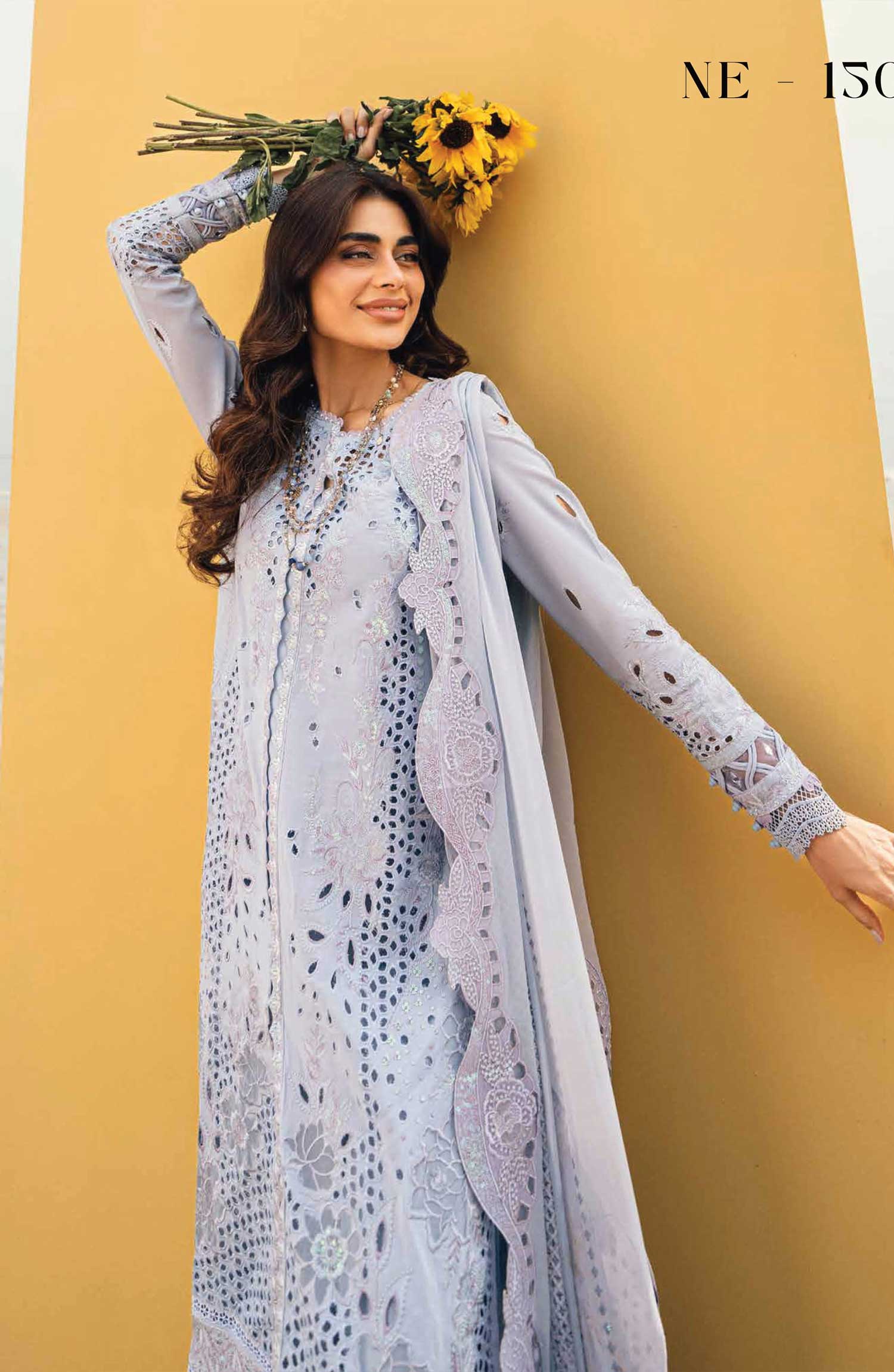 Nureh Khuwab Embroidered and Embellished Swiss Voile Collection has been styled in the image for photography and illustrative purposes.