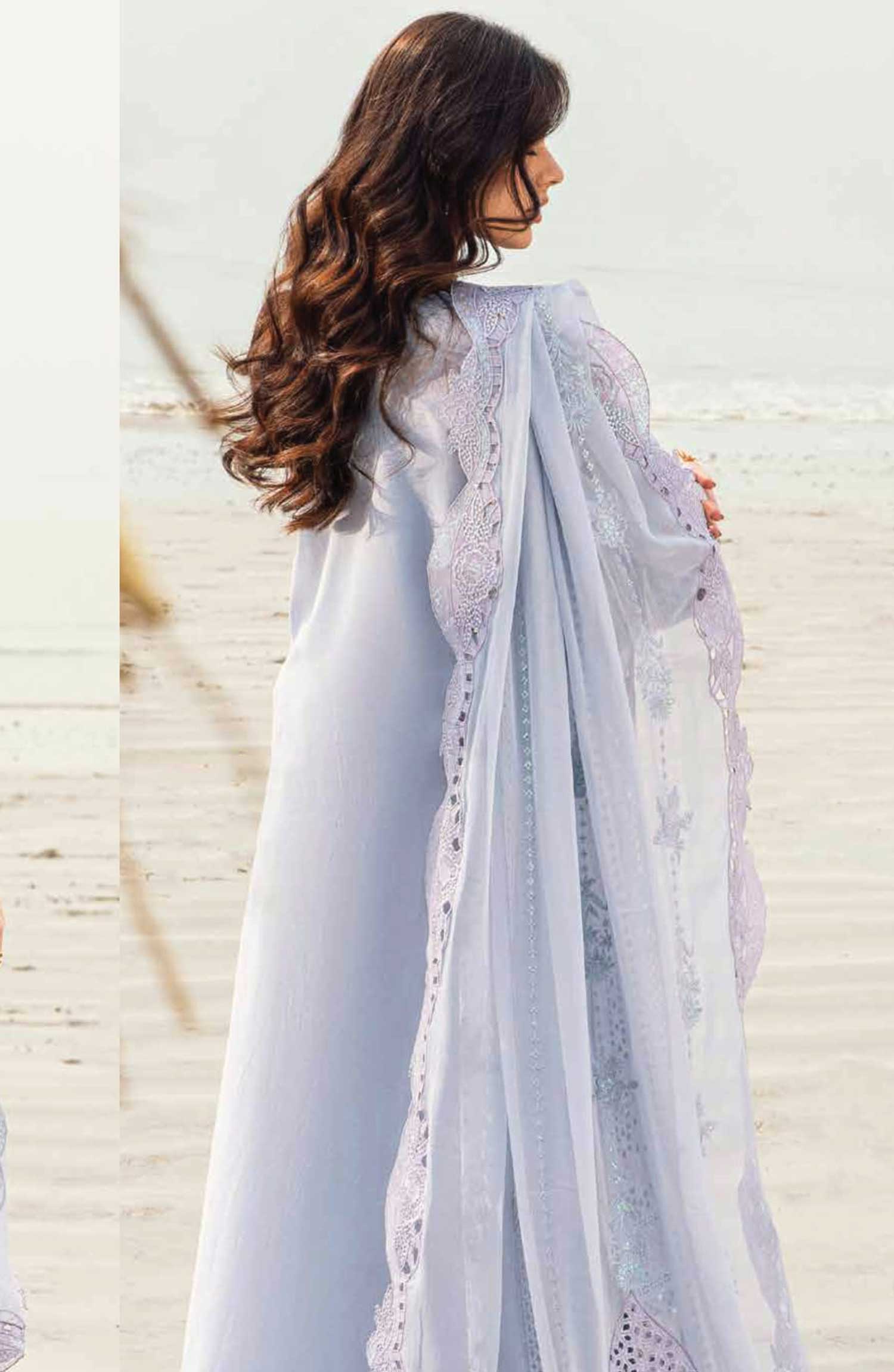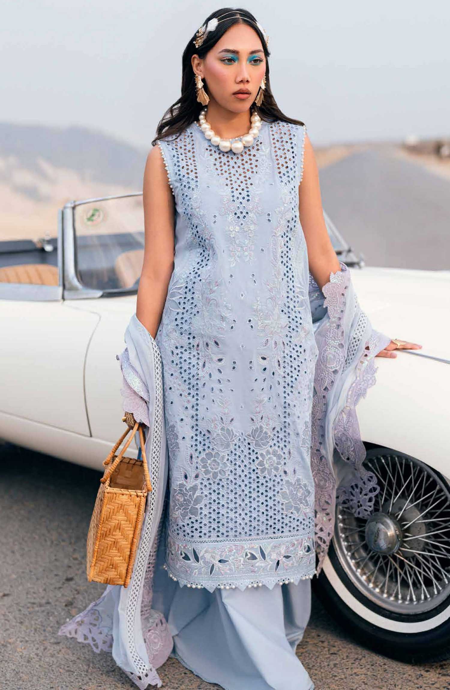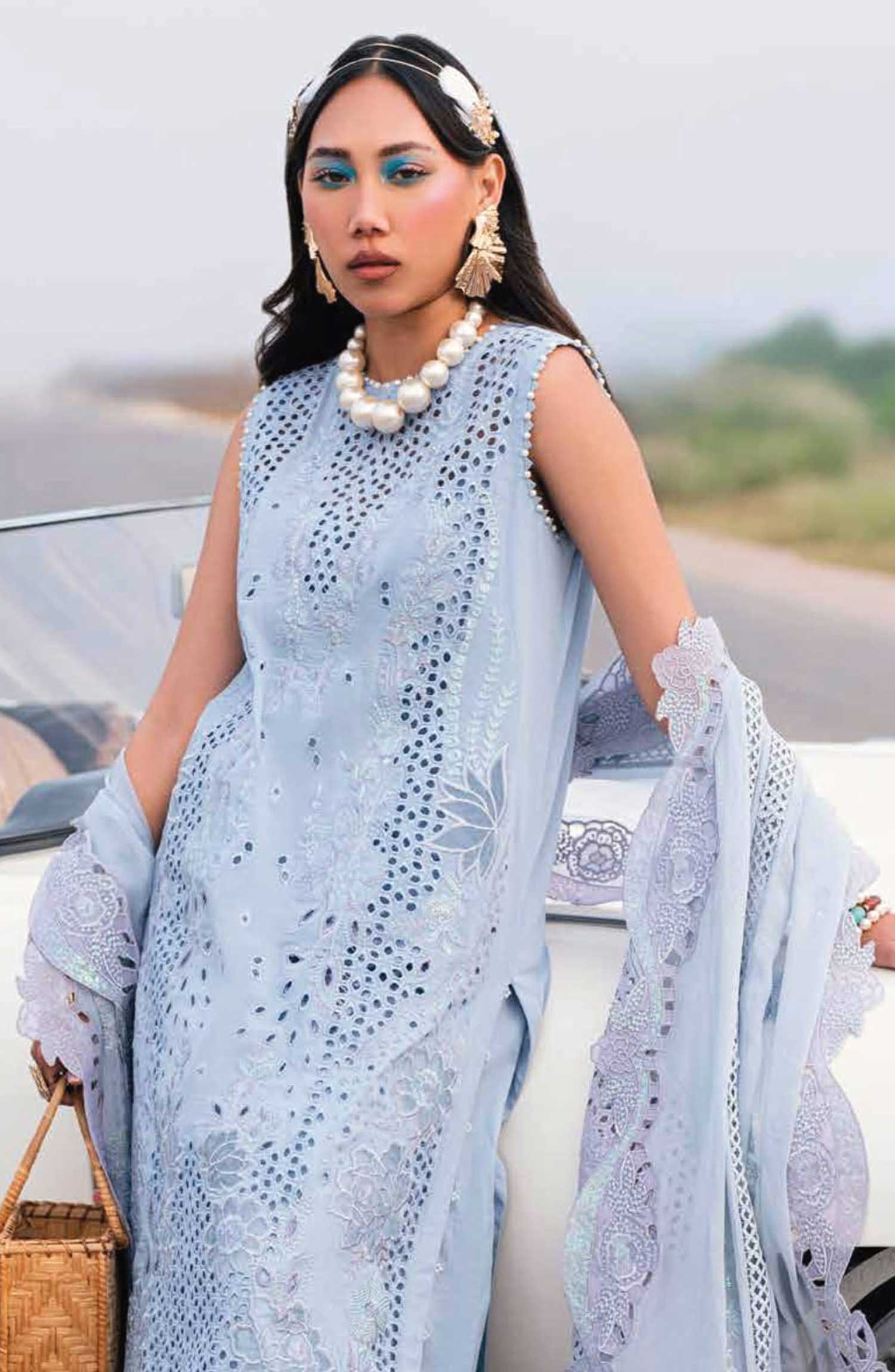 Nureh Khuwab Embroidered and Embellished Swiss Voile Collection has been styled in the image for photography and illustrative purposes.
