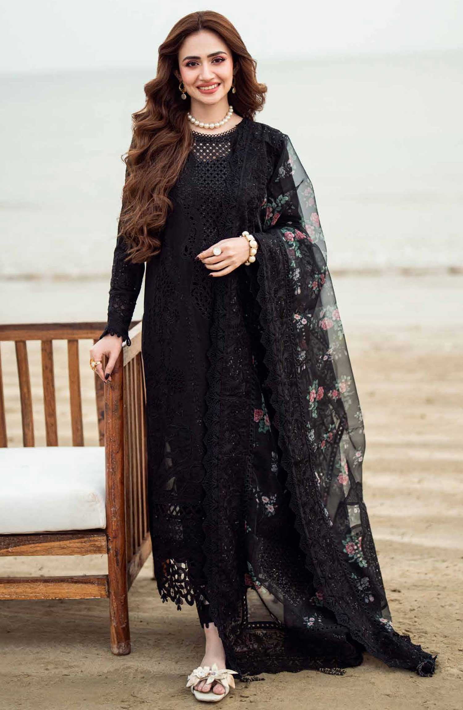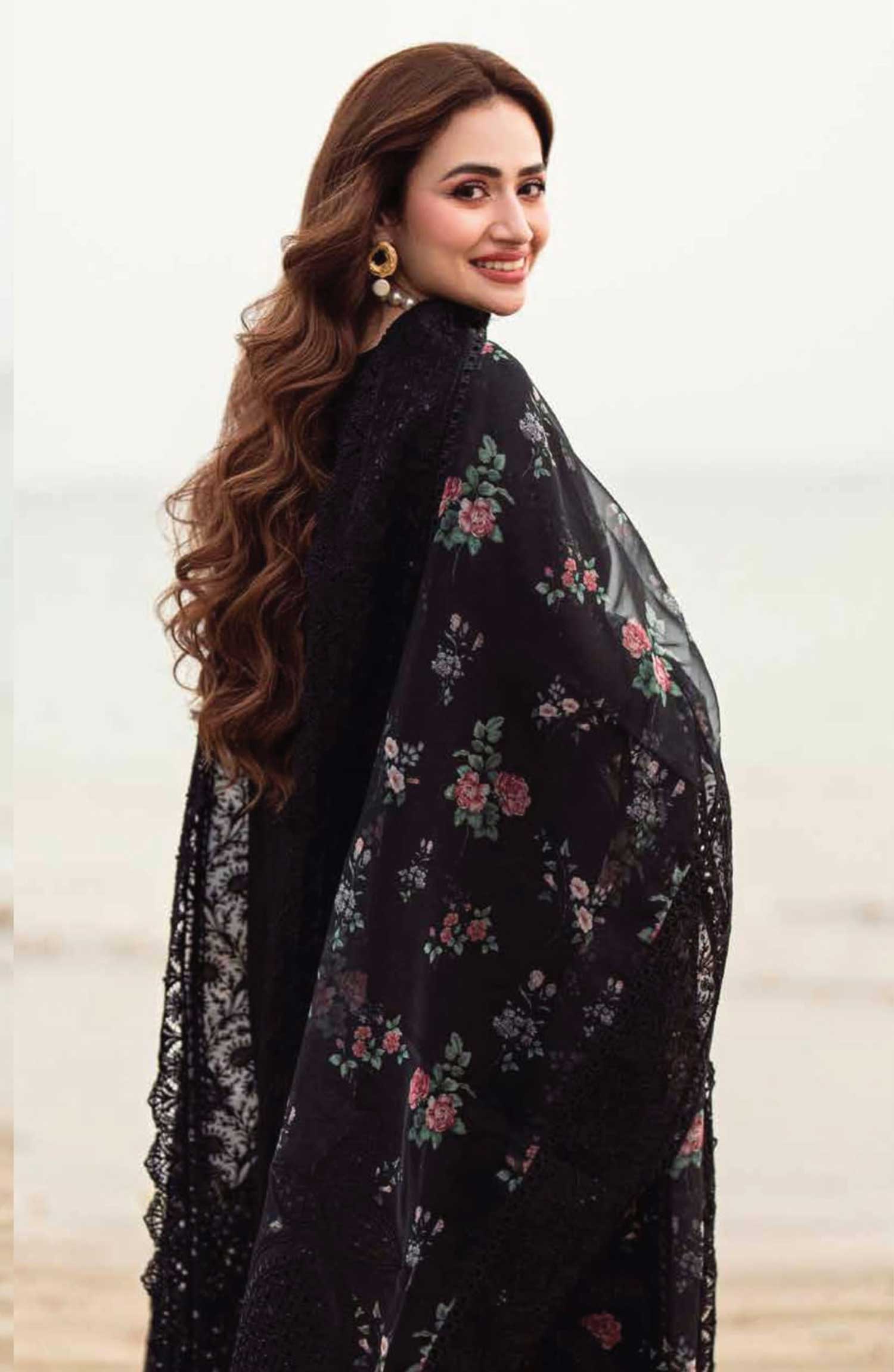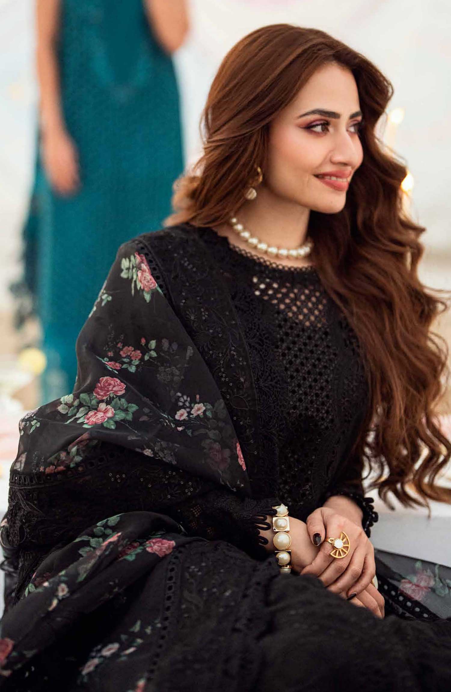 Nureh Khuwab Embroidered and Embellished Swiss Voile Collection has been styled in the image for photography and illustrative purposes.