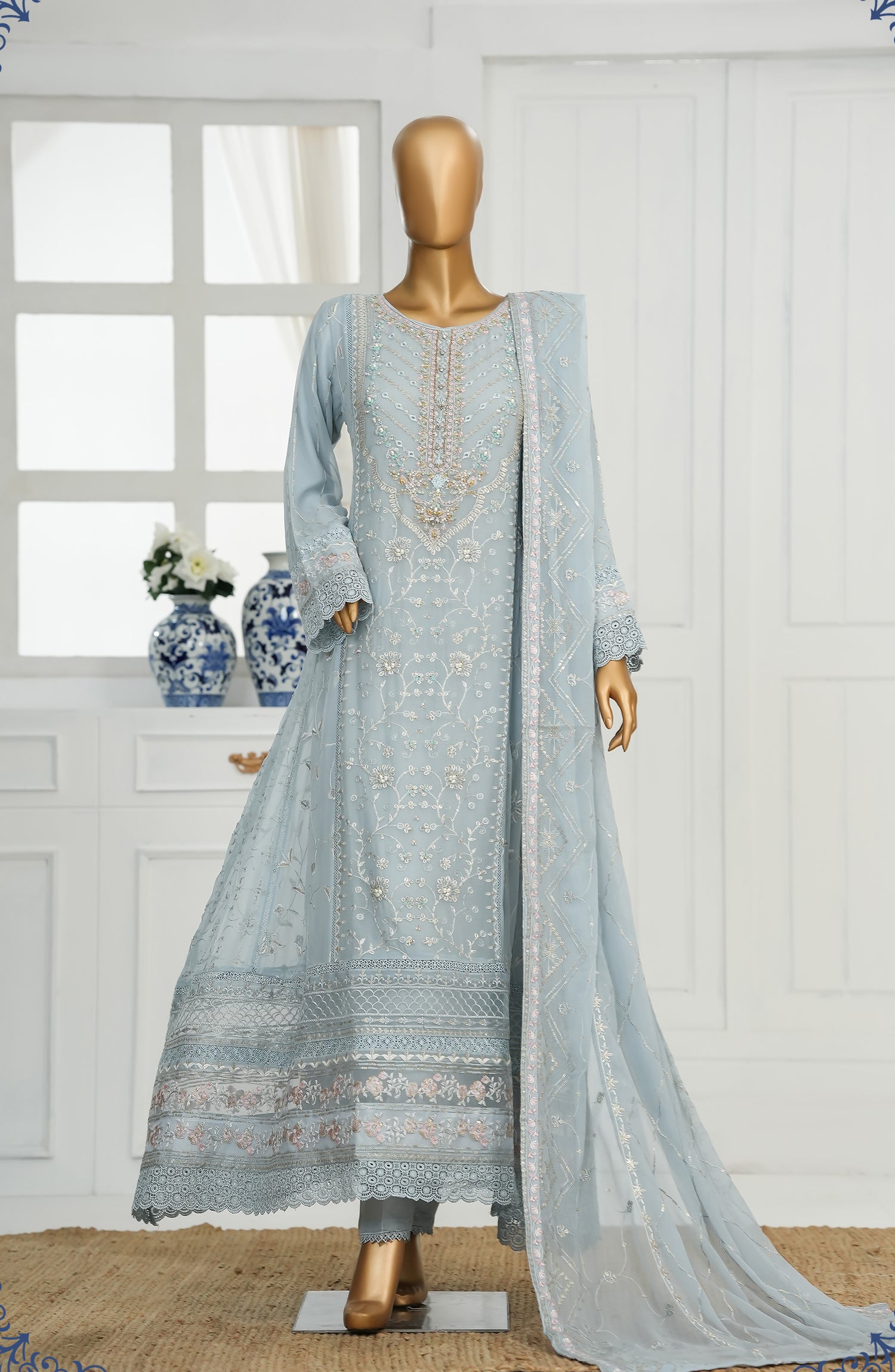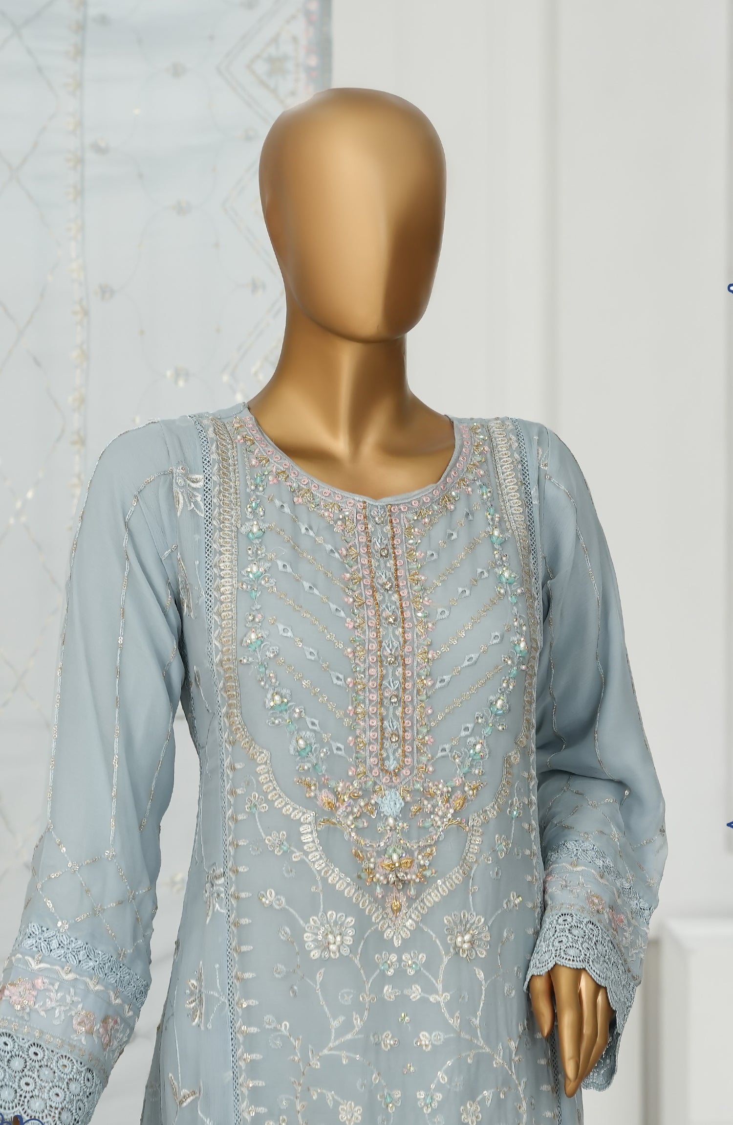 Embroidered Chiffon Stitch Maxi including Neck Hand Work & Lace Work with Viscose Inner
