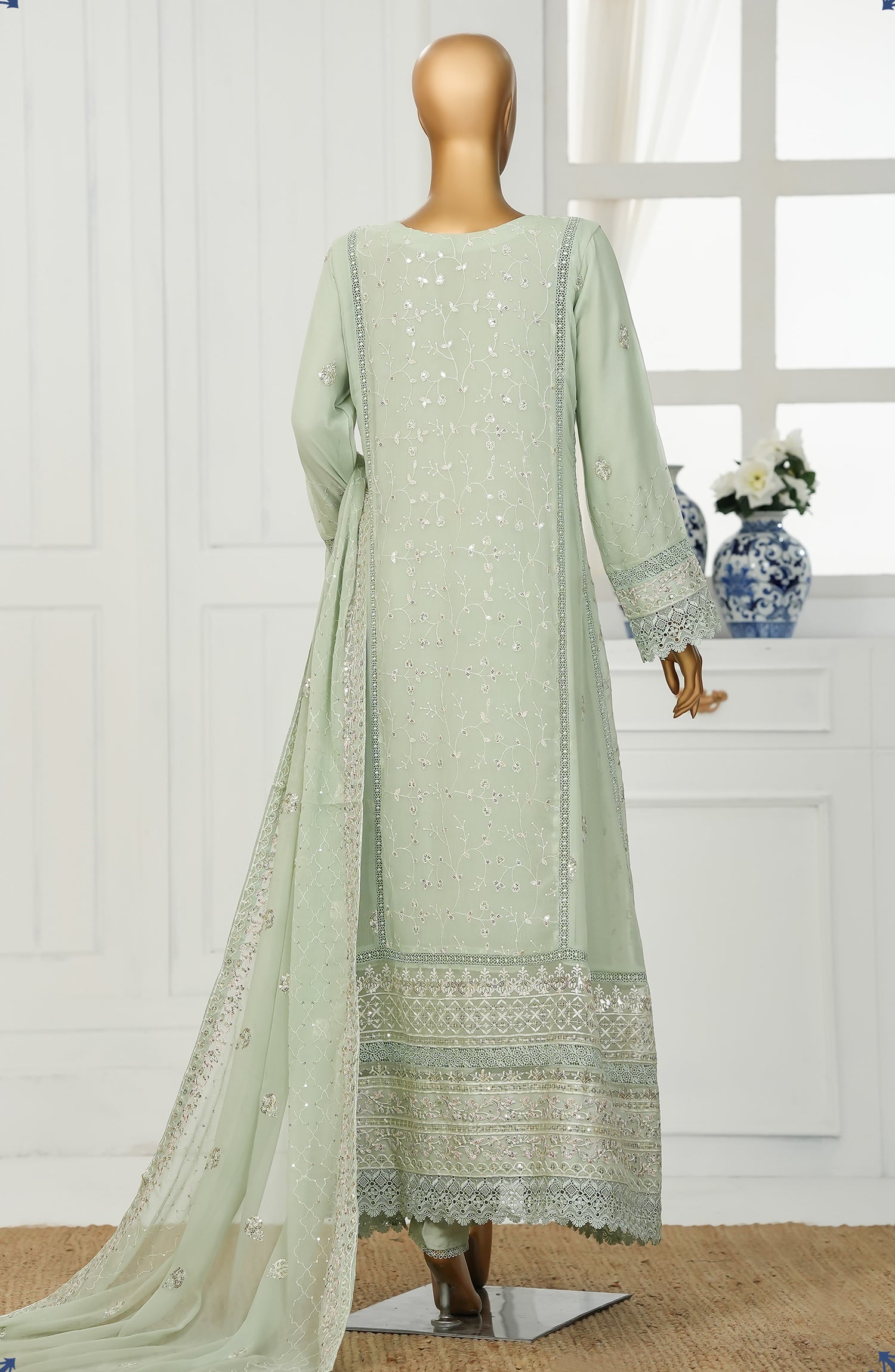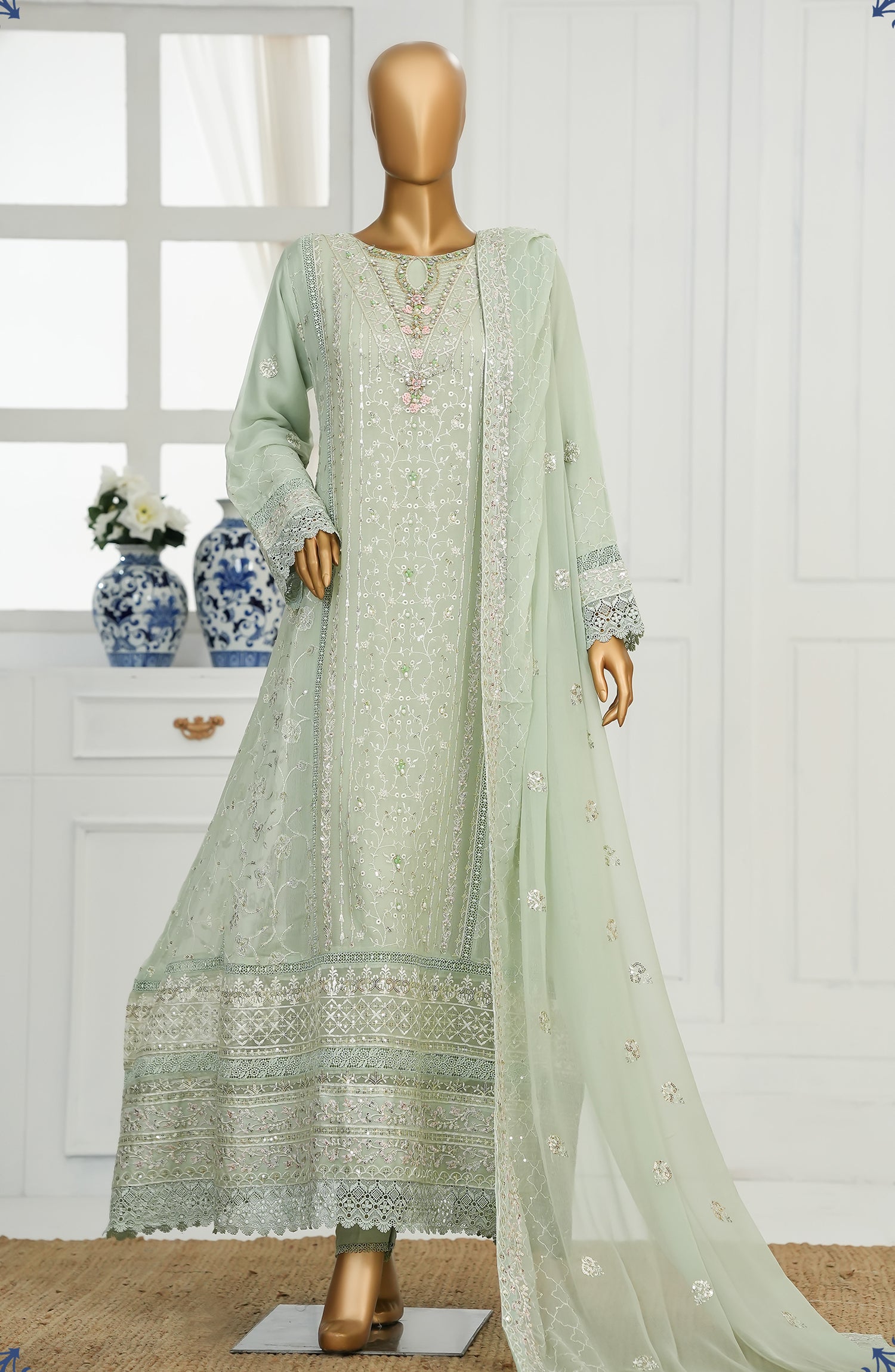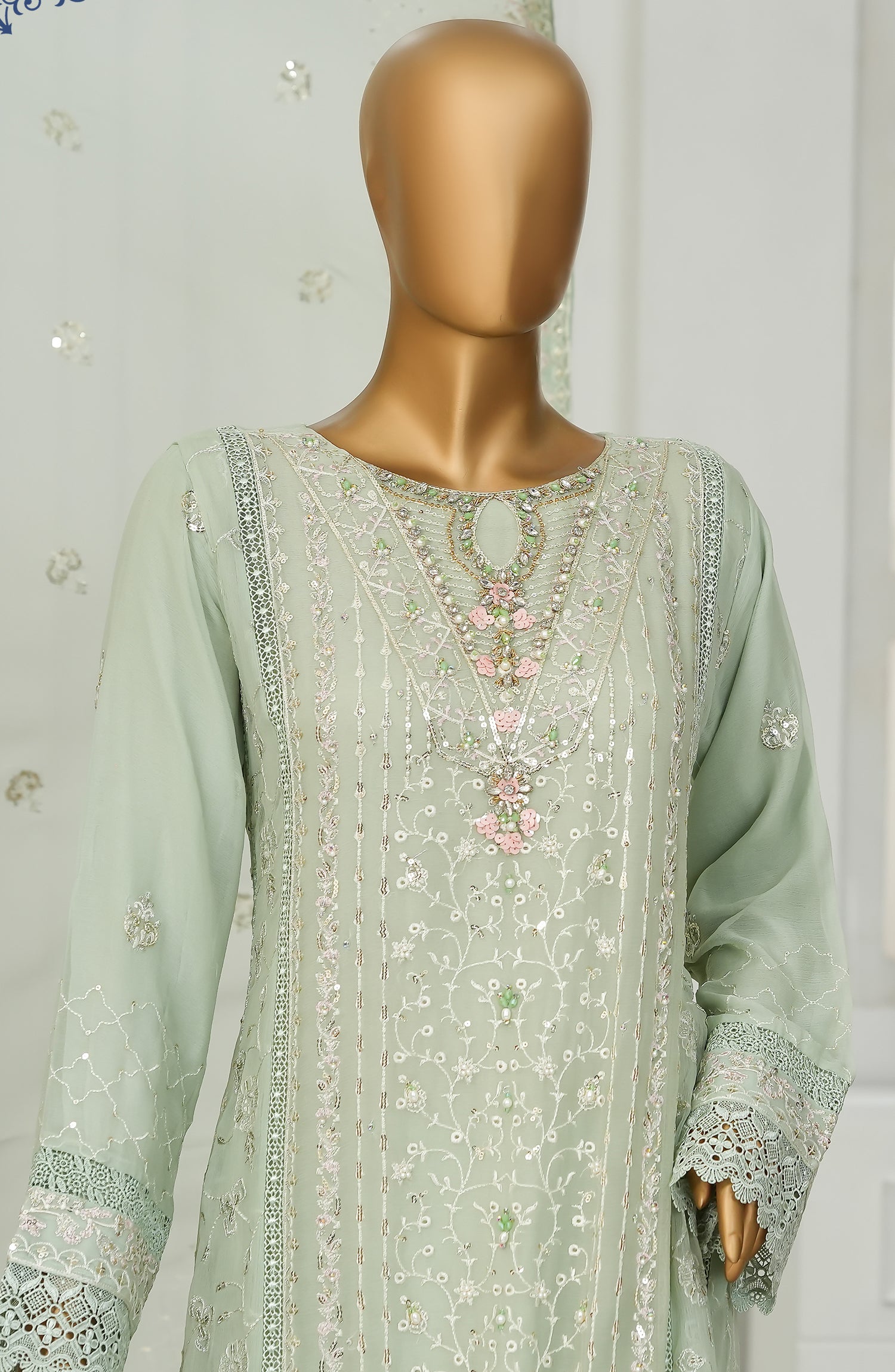 Embroidered Chiffon Stitch Maxi including Neck Hand Work & Lace Work with Viscose Inner