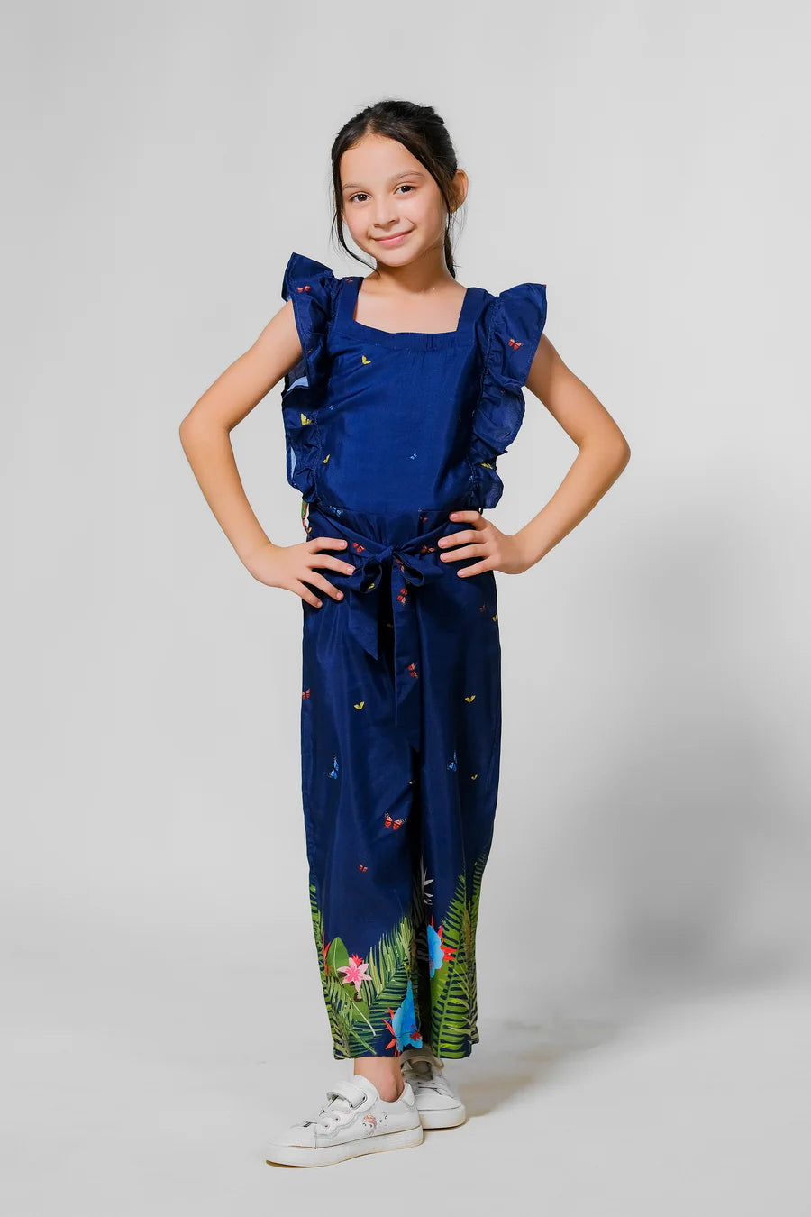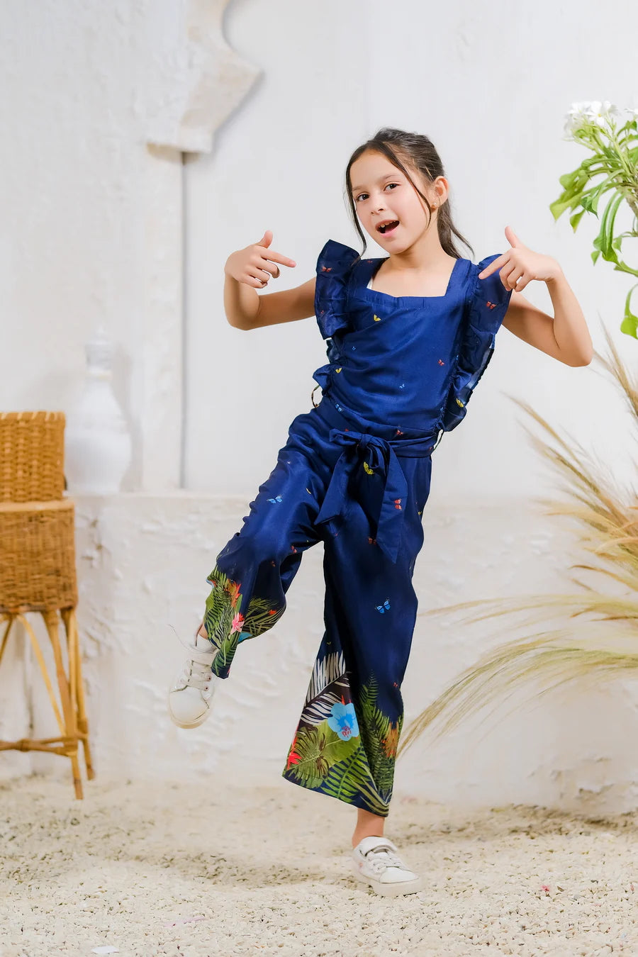 Dive into the vibrant hues of the tropics with this Tropical Night Jumpsuit. The deep navy fabric is adorned with lively tropical prints at the hem, creating a beautiful contrast. Ruffled sleeves and a comfortable fit make it perfect for playful adventures or casual outings.