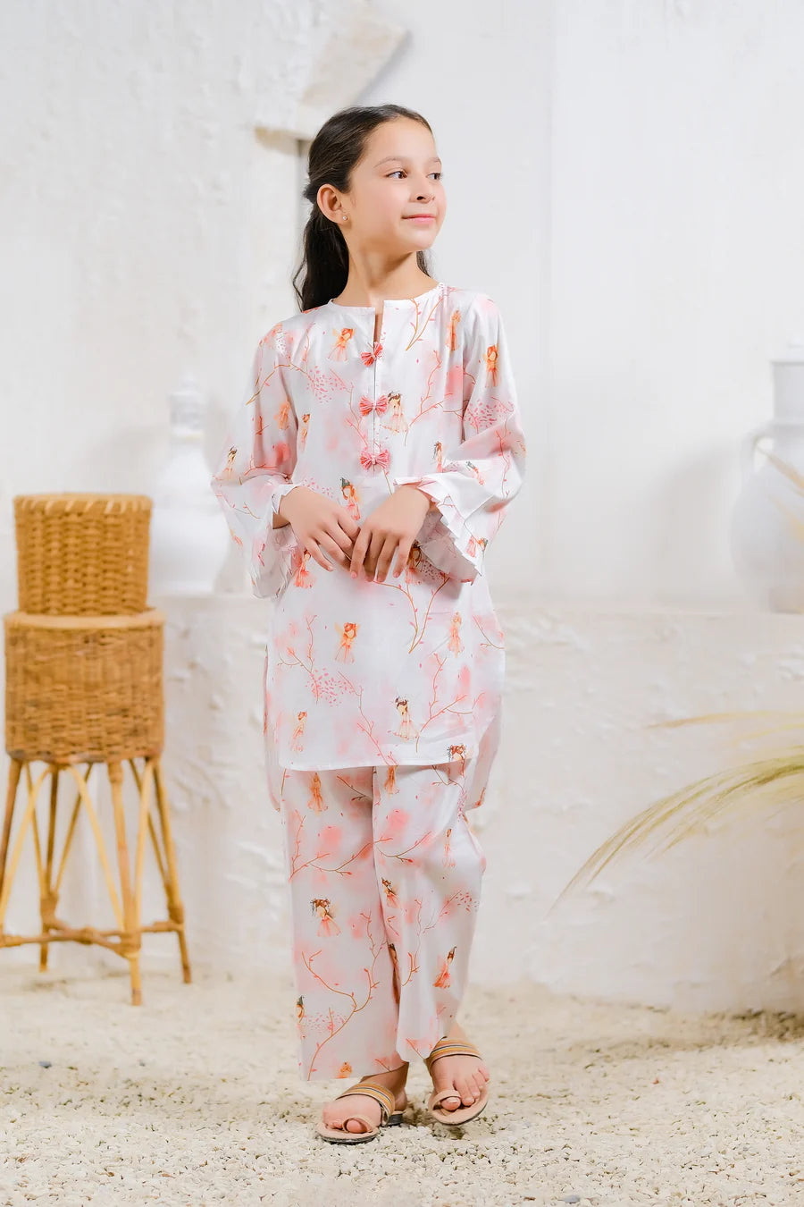 Step into a world of wonder with this ethereal two-piece set featuring delightful fairy motifs against a soft, blush background. The delicate bows on the front complement the pastel shades and whimsical designs, making this outfit ideal for little dreamers. Crafted from comfortable cambric fabric, this ensemble is perfect for twirling in gardens or enjoying a magical day out.