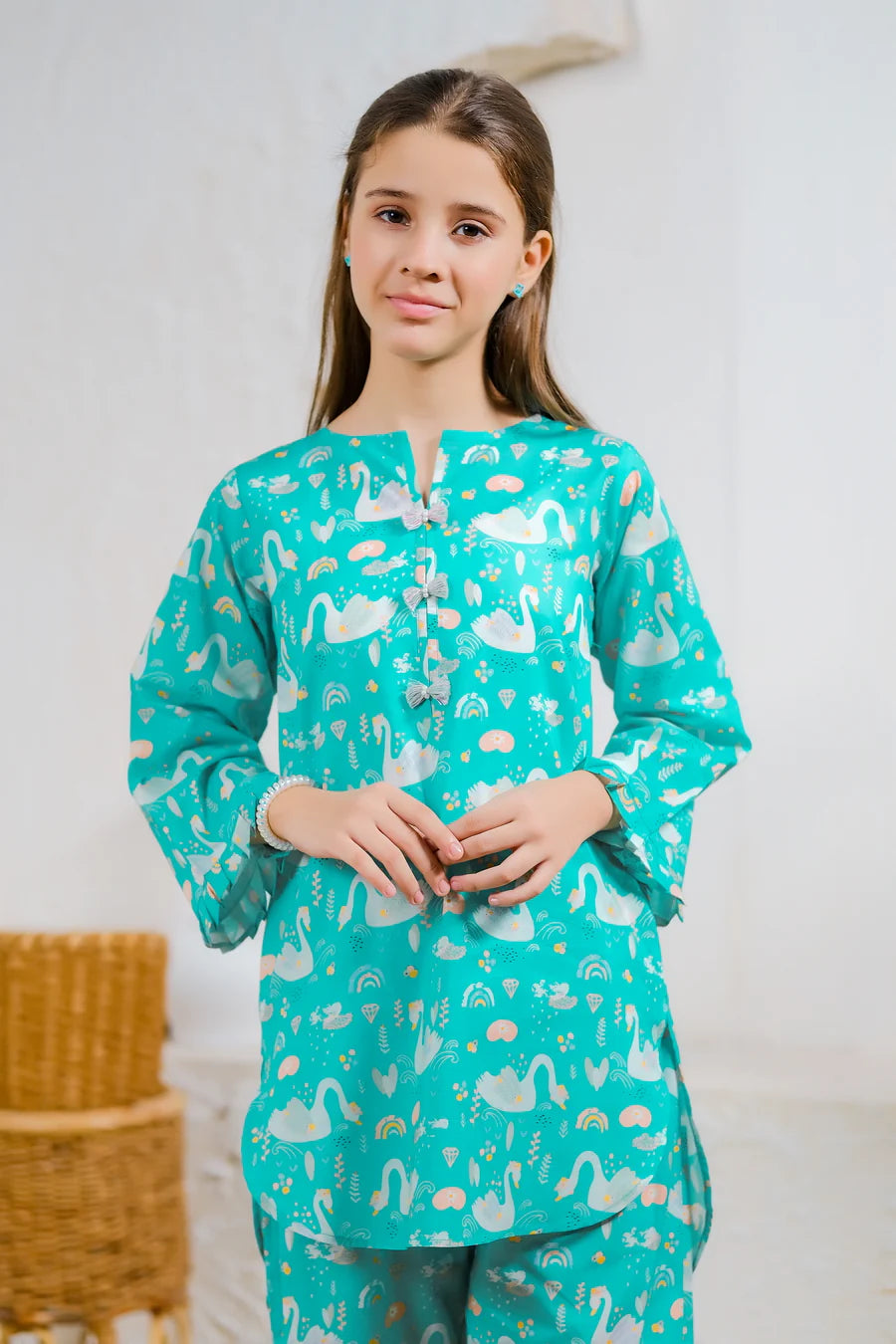 Let your little one embrace the magic of swan-filled days with this enchanting two-piece cambric outfit. The vibrant teal canvas is adorned with charming swans and whimsical rainbows, perfect for a day filled with imagination. Delicate bows embellish the neckline, adding a playful touch to this outfit, which offers comfort and style for any occasion.