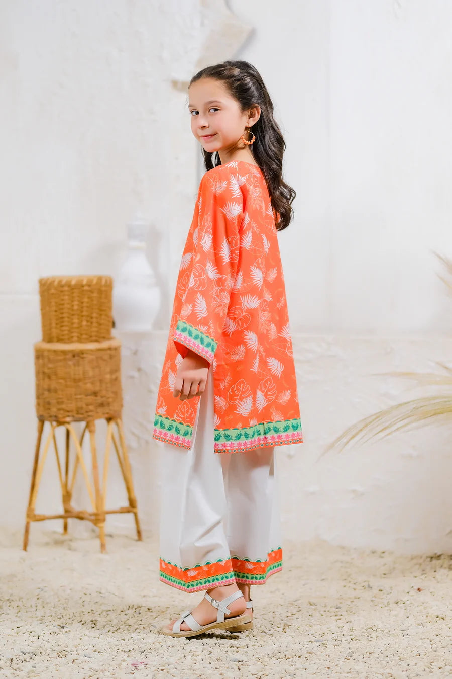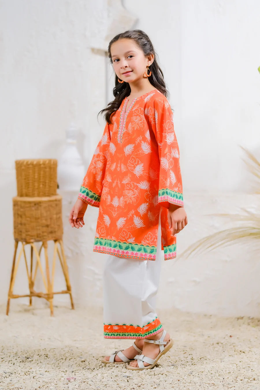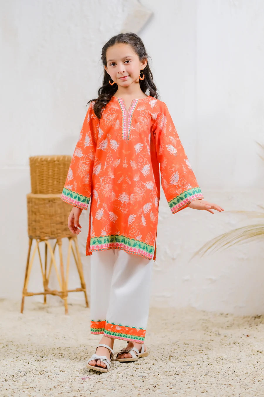 Channel the warm, golden hues of a Marrakech sunset with this striking outfit. The bold orange top, decorated with intricate leaf patterns, brings the warmth and energy of this Moroccan city to life. Paired with crisp white trousers, the Marrakech Sunset set is perfect for making a vibrant statement.