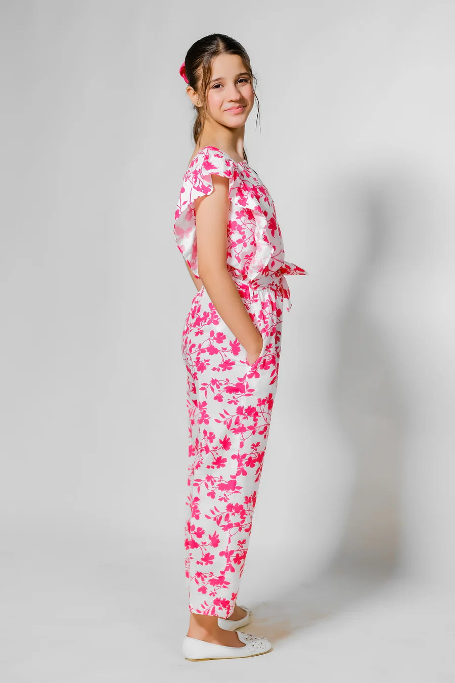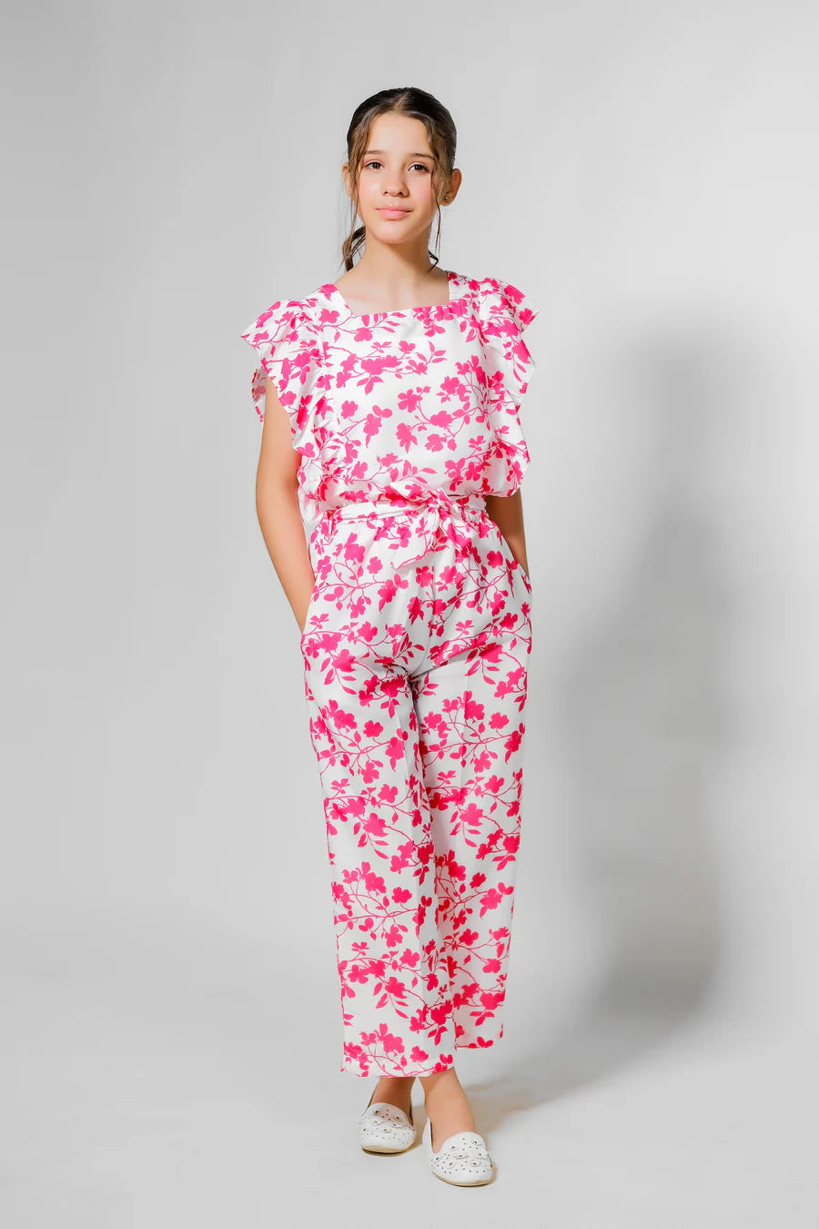 This adorable co-ord set features a breezy top with fluttery sleeves and wide-legged pants adorned with delicate palm tree motifs. Crafted from soft fabric, it's perfect for casual outings and playdates, offering both comfort and style for your little one.