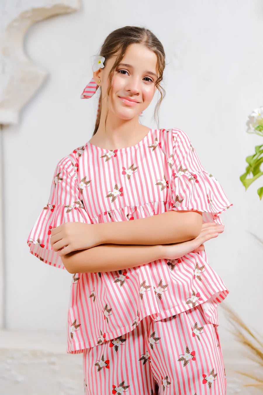 Sweet as can be, this co-ord set brings together playful pink and white stripes with charming strawberry accents. The frilly top and relaxed-fit pants make it ideal for summertime fun, keeping your child both fashionable and comfortable.