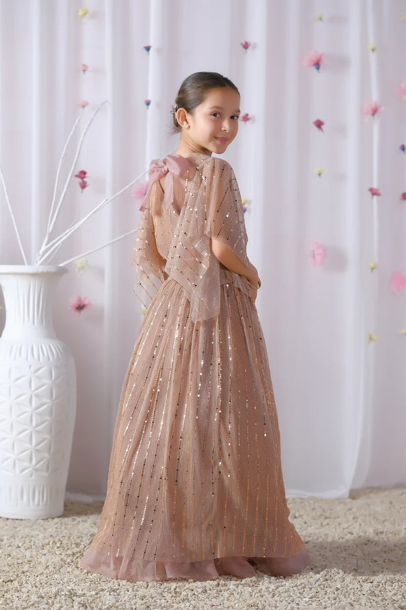 Elevate your style with this exquisite beige two-piece lehenga set featuring a short top, bow at the back and a lehenga adorned with shimmering silver sequins. The lehenga is accentuated with organza at the bottom, adding a touch of ethereal beauty to your ensemble.
