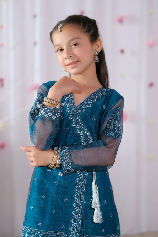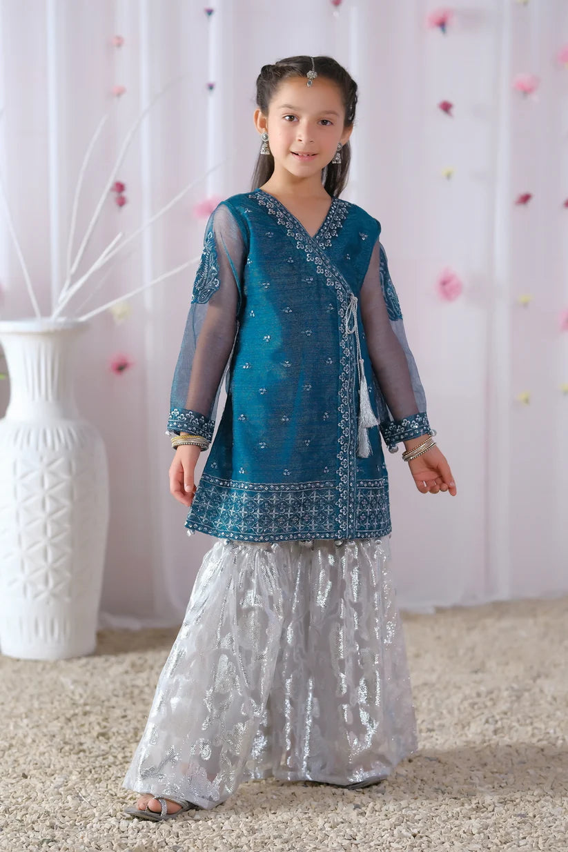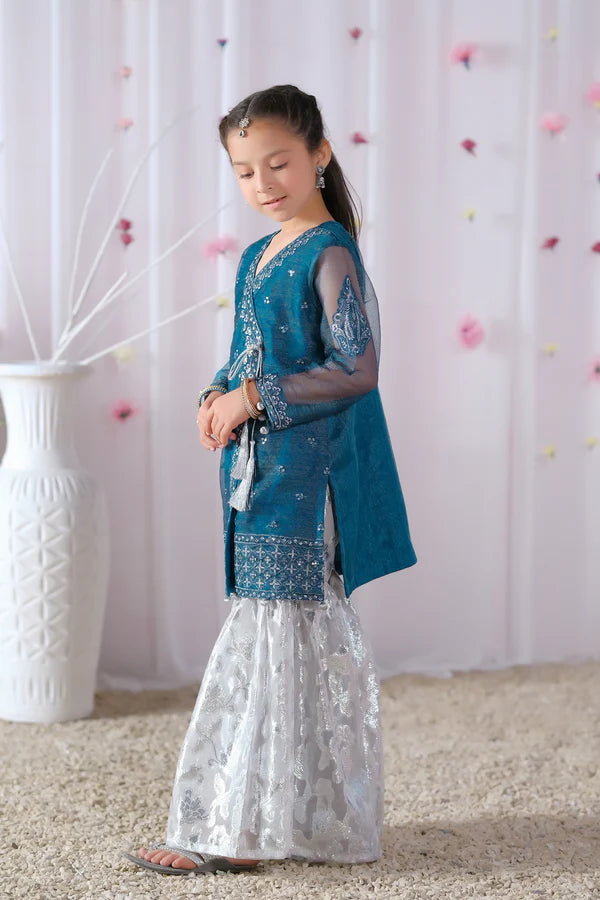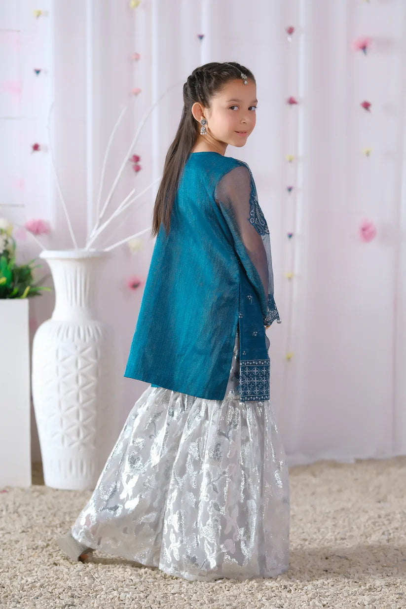 Introducing "Nilofer," a stunning teal blue and silver two-piece outfit for girls that captivates with its elegance. The angarkha-style top in teal blue exudes regal charm, complemented by the shimmering silver gharara. Perfect for special occasions, this ensemble radiates sophistication and grace, making your little one stand out with timeless beauty.