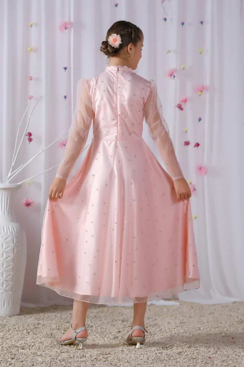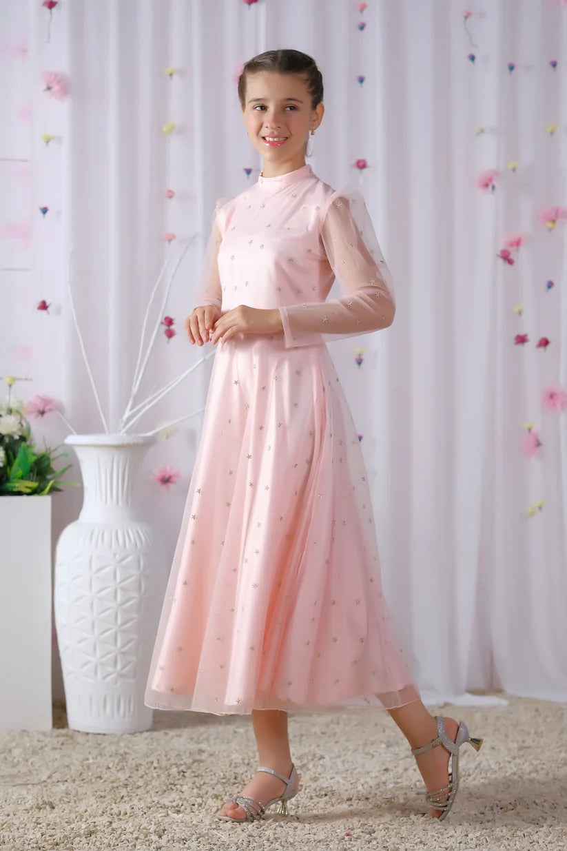 Introducing "Sahar," a celestial light pink long dress for girls adorned with enchanting silver star embroidery throughout. This ethereal ensemble exudes grace and charm, perfect for special occasions. Let your little one shine like a star in this mesmerizing dress that captures the magic of the night sky.
