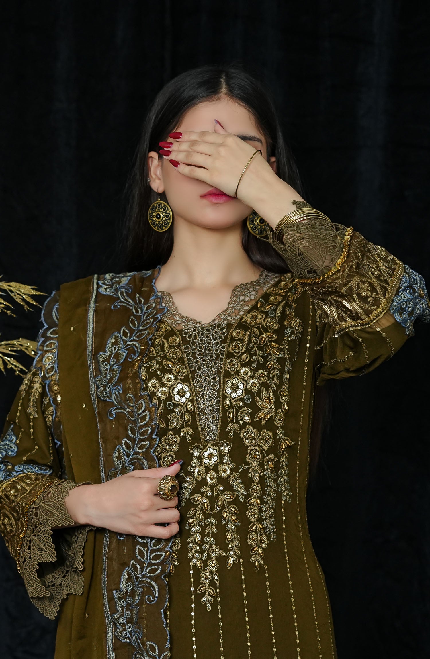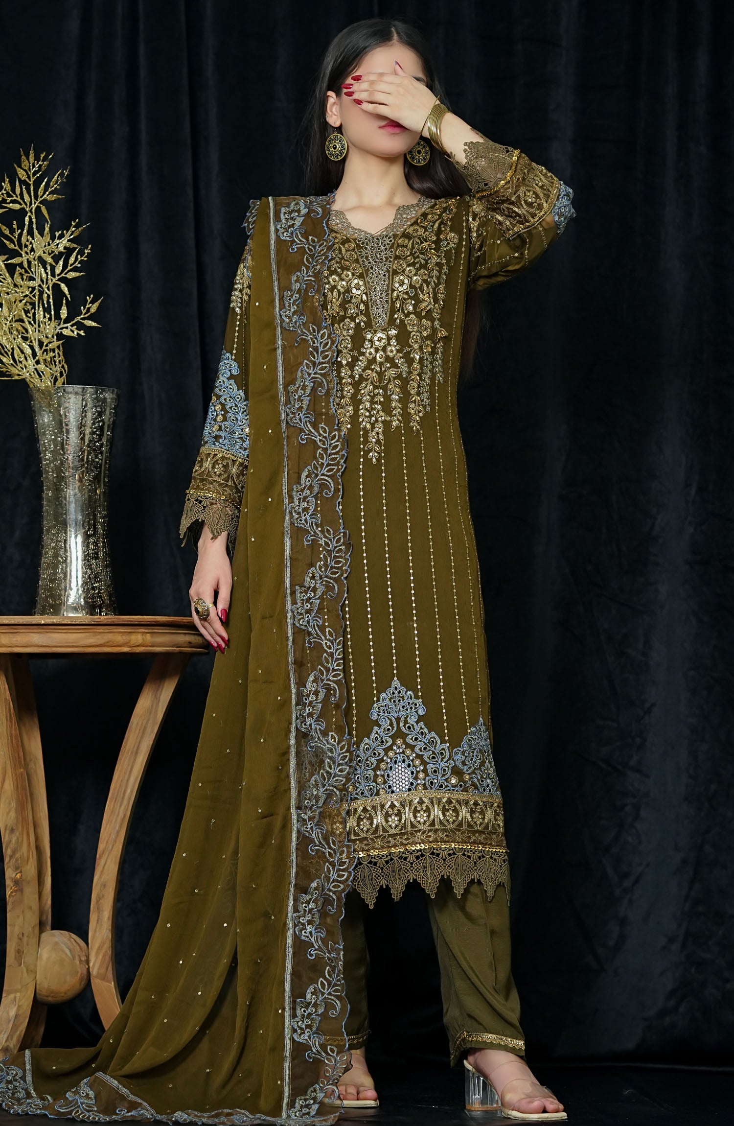 The standard style comes as a long-sleeved kameez with dupatta and trouser/shawlar.