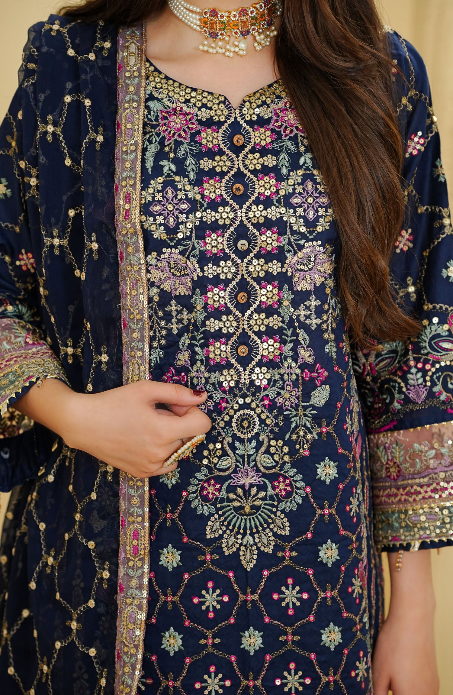 The standard style comes as a long-sleeved kameez with dupatta and trouser/shawlar.