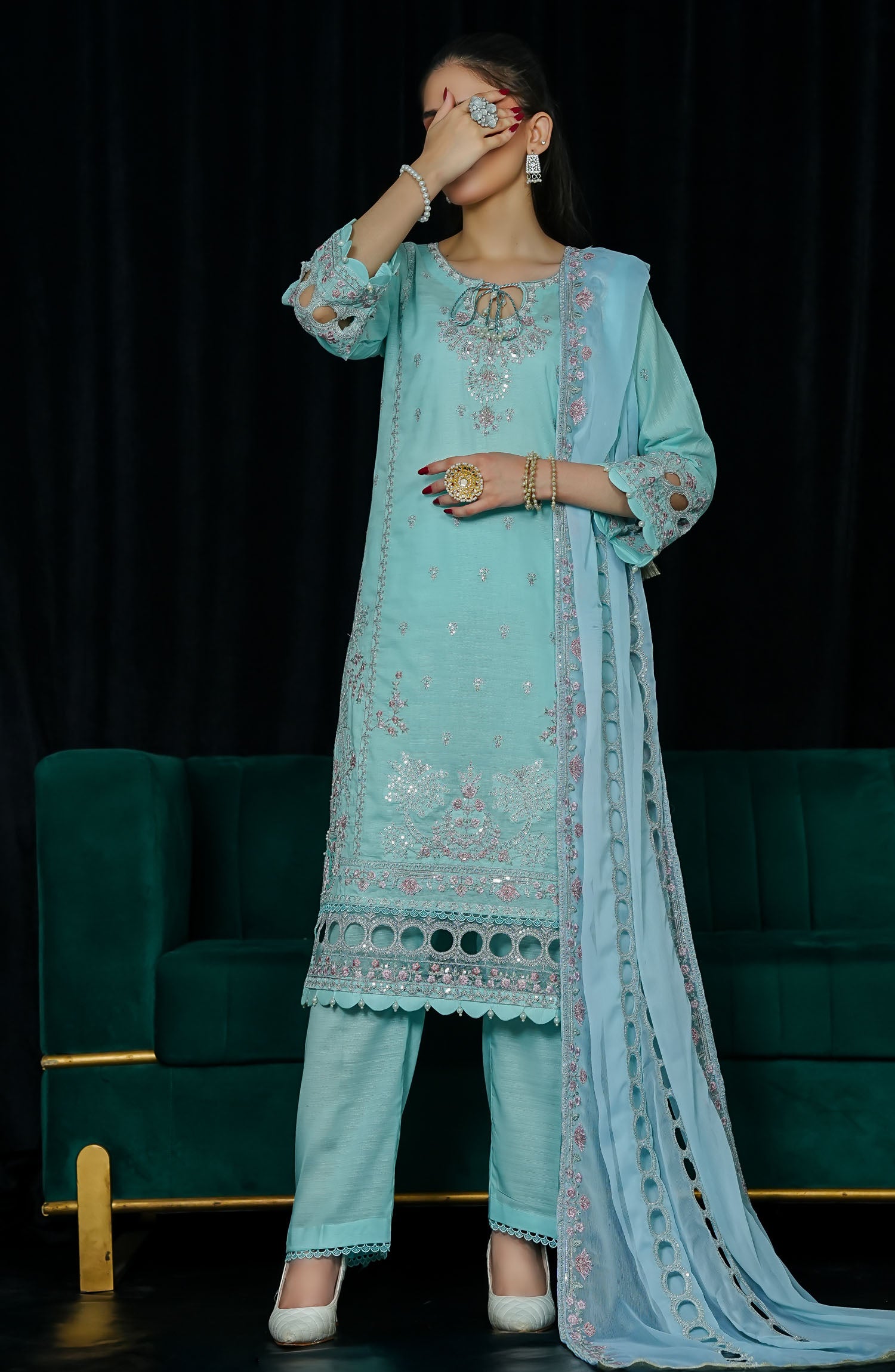 The standard style comes as a long-sleeved kameez with dupatta and trouser/shawlar.
