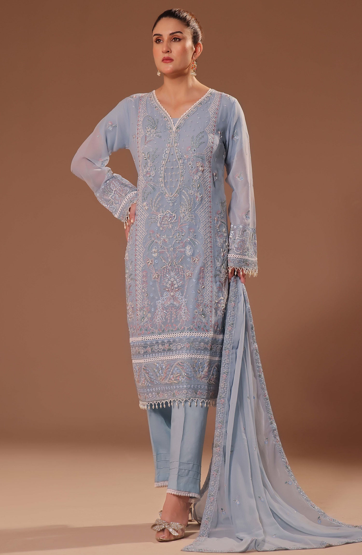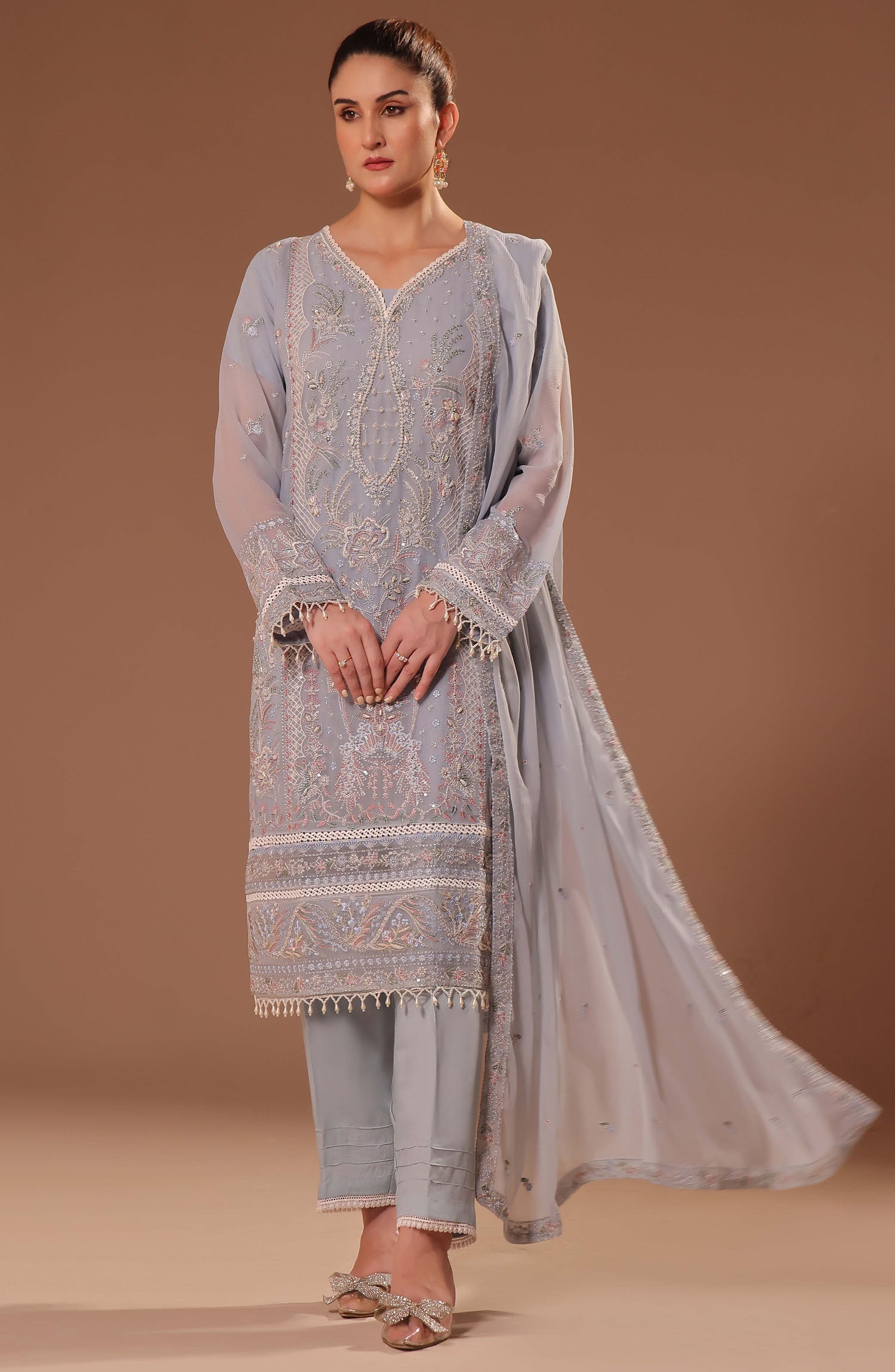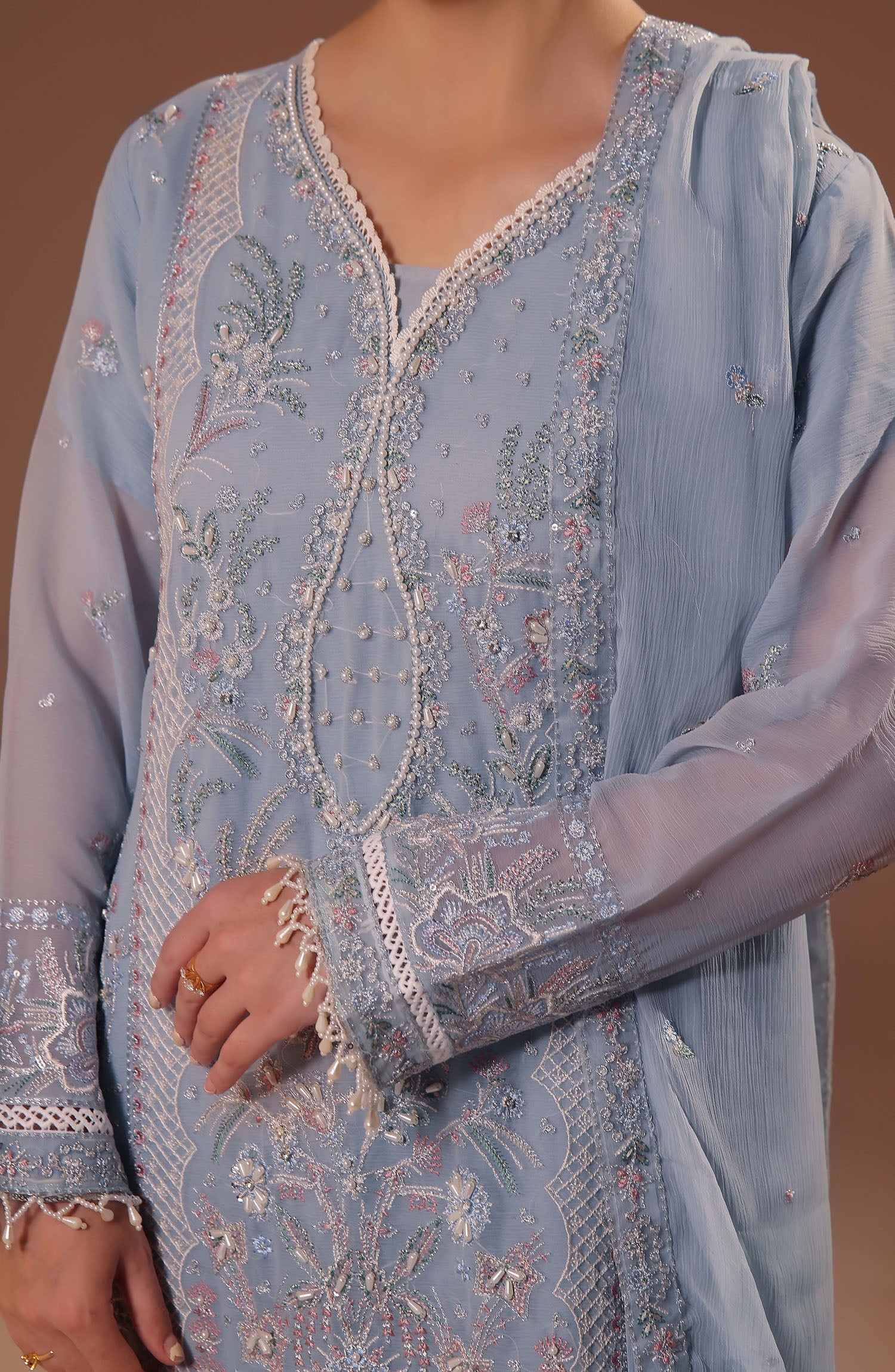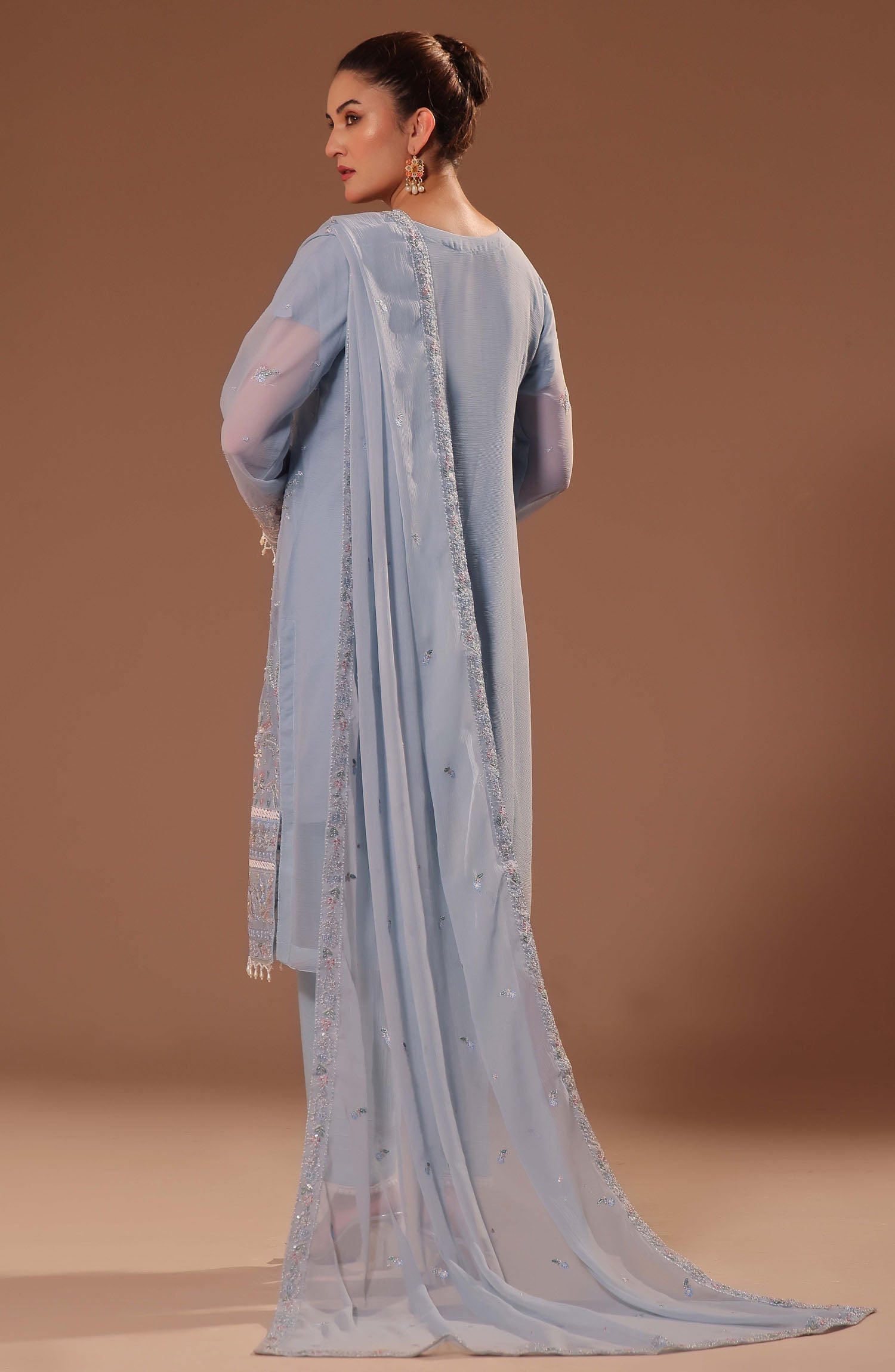 The standard style comes as a long-sleeved kameez with dupatta and trouser .