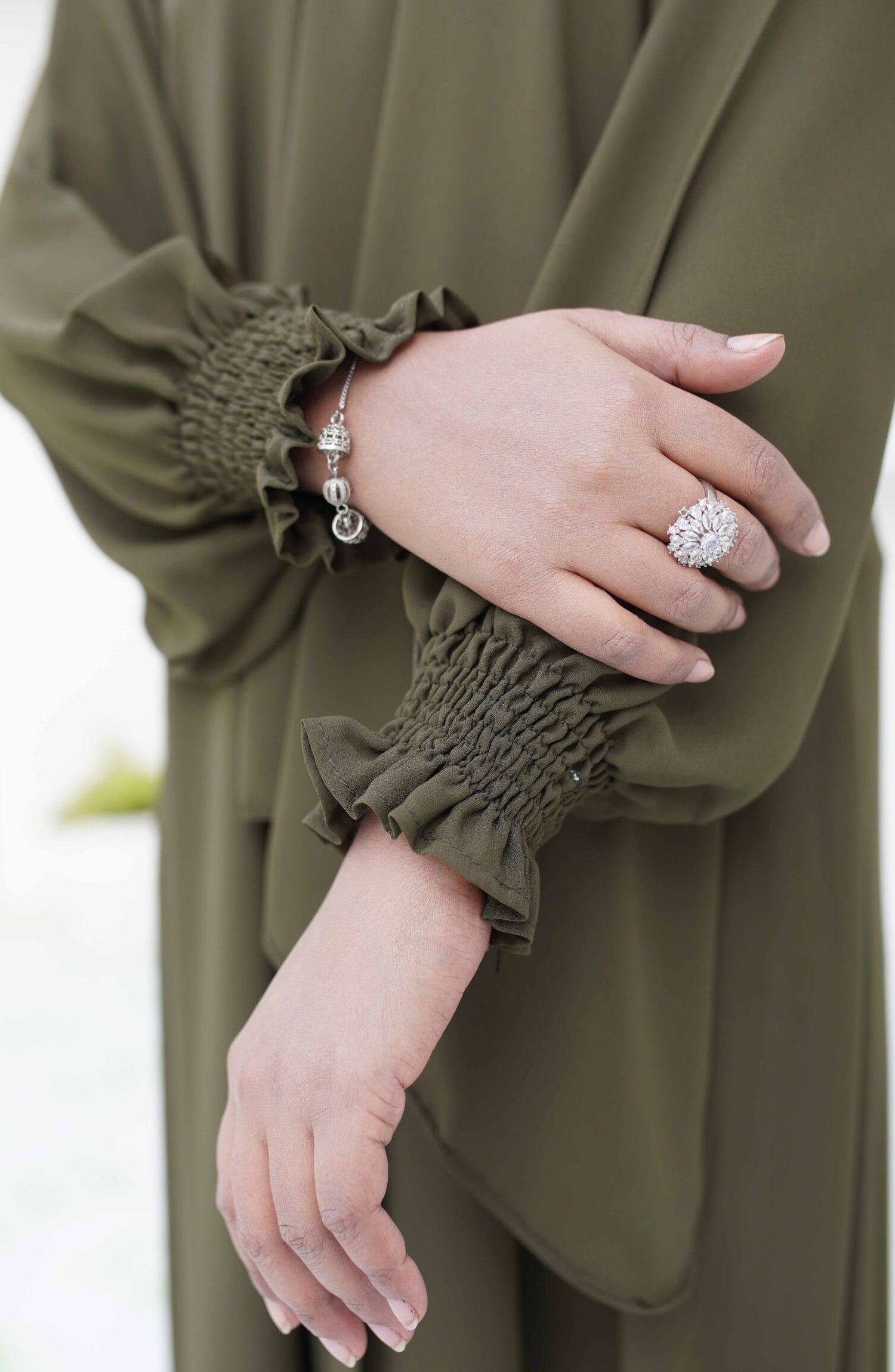 Introducing The Olive button-down open Abaya, your new go-to piece for effortless style in every season featuring stylish elasticated cuff sleeves. It comes with a soft Georgette matching Hijab making it a perfect all-in-one outfit.