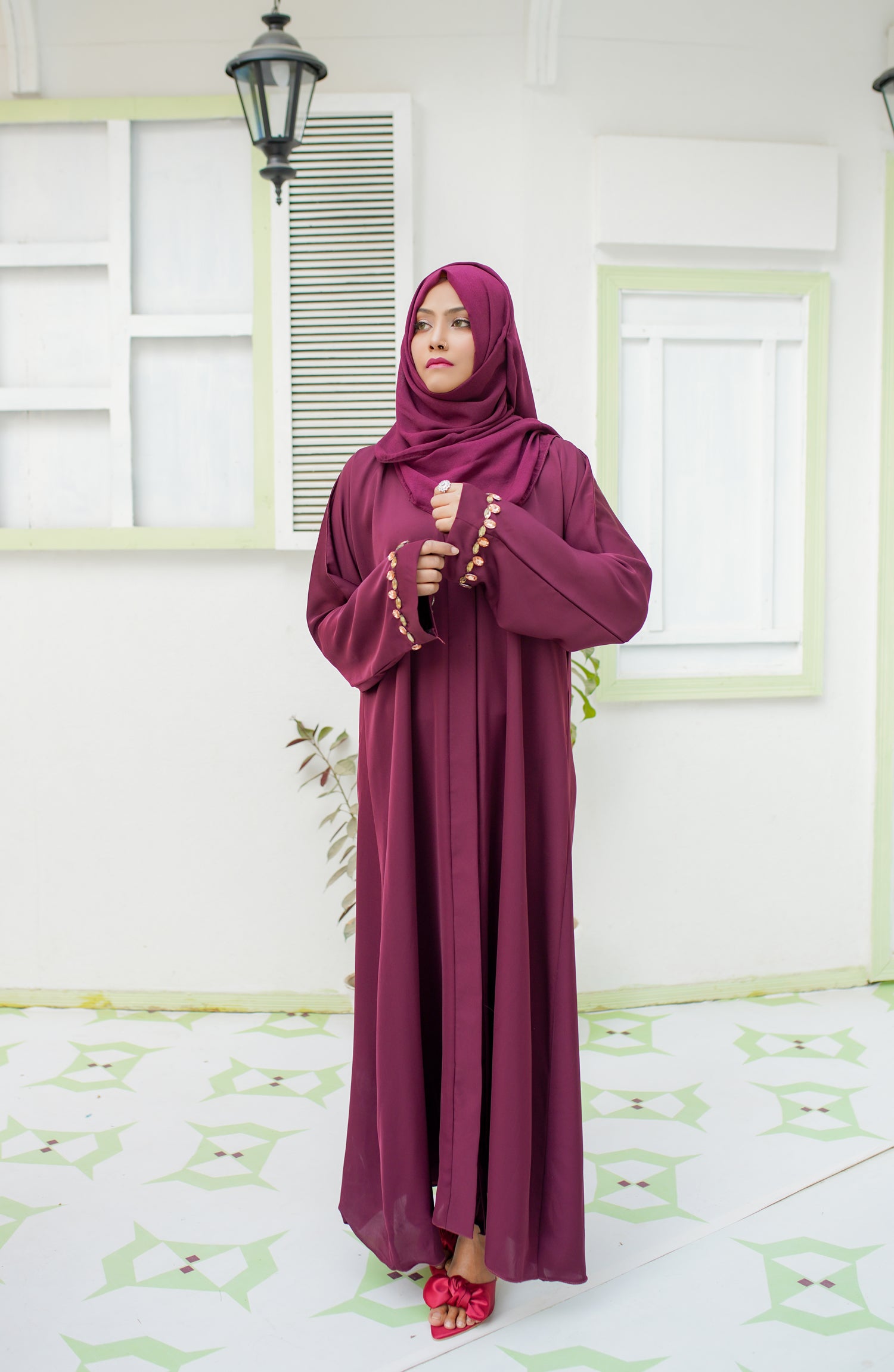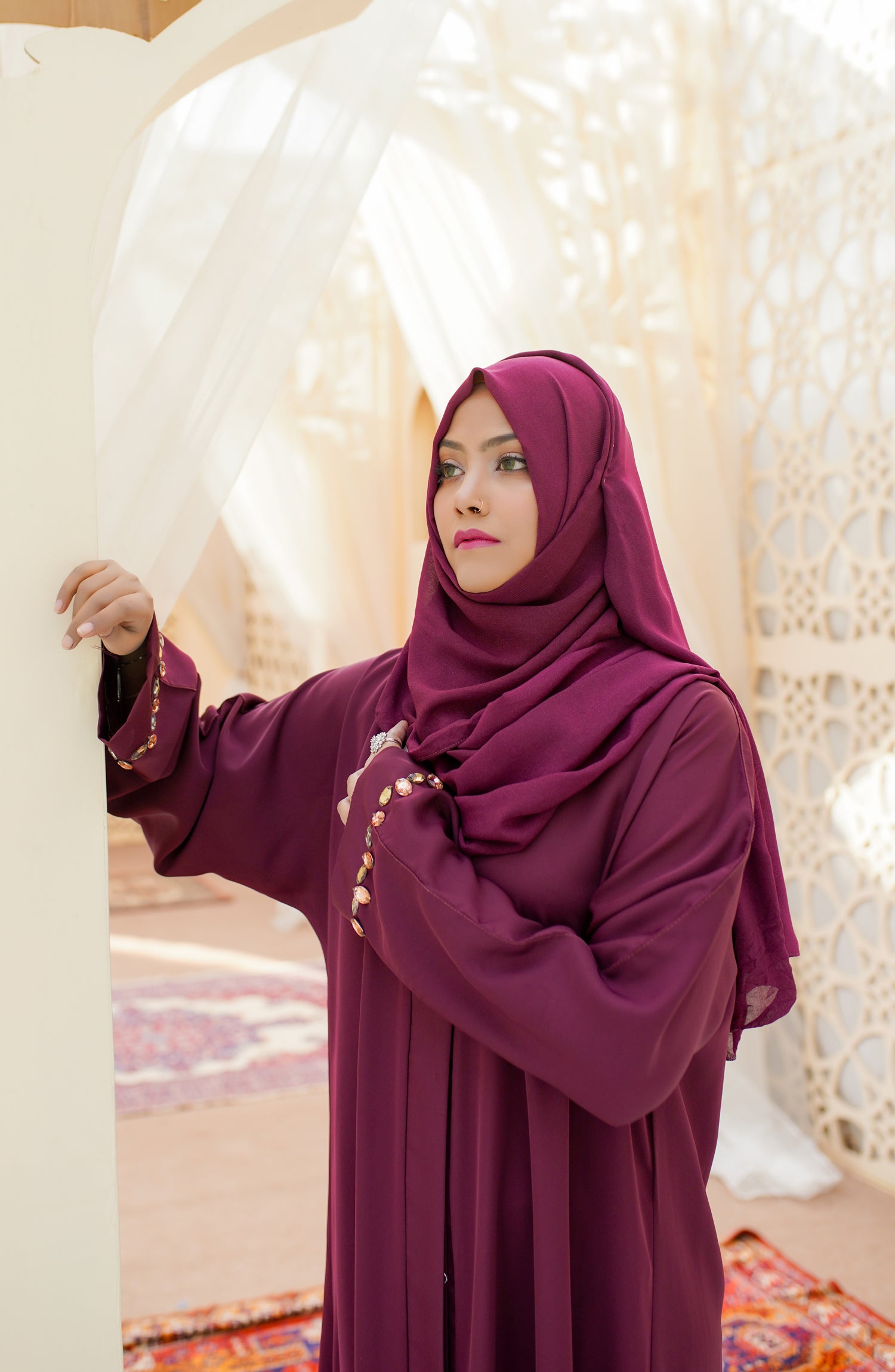 Experience Elegance and exclusivity in our premium embellished open abaya. This luxurious piece of clothing is hand-crafted with stone details on the cuff. Stud fastened buttons are provided.